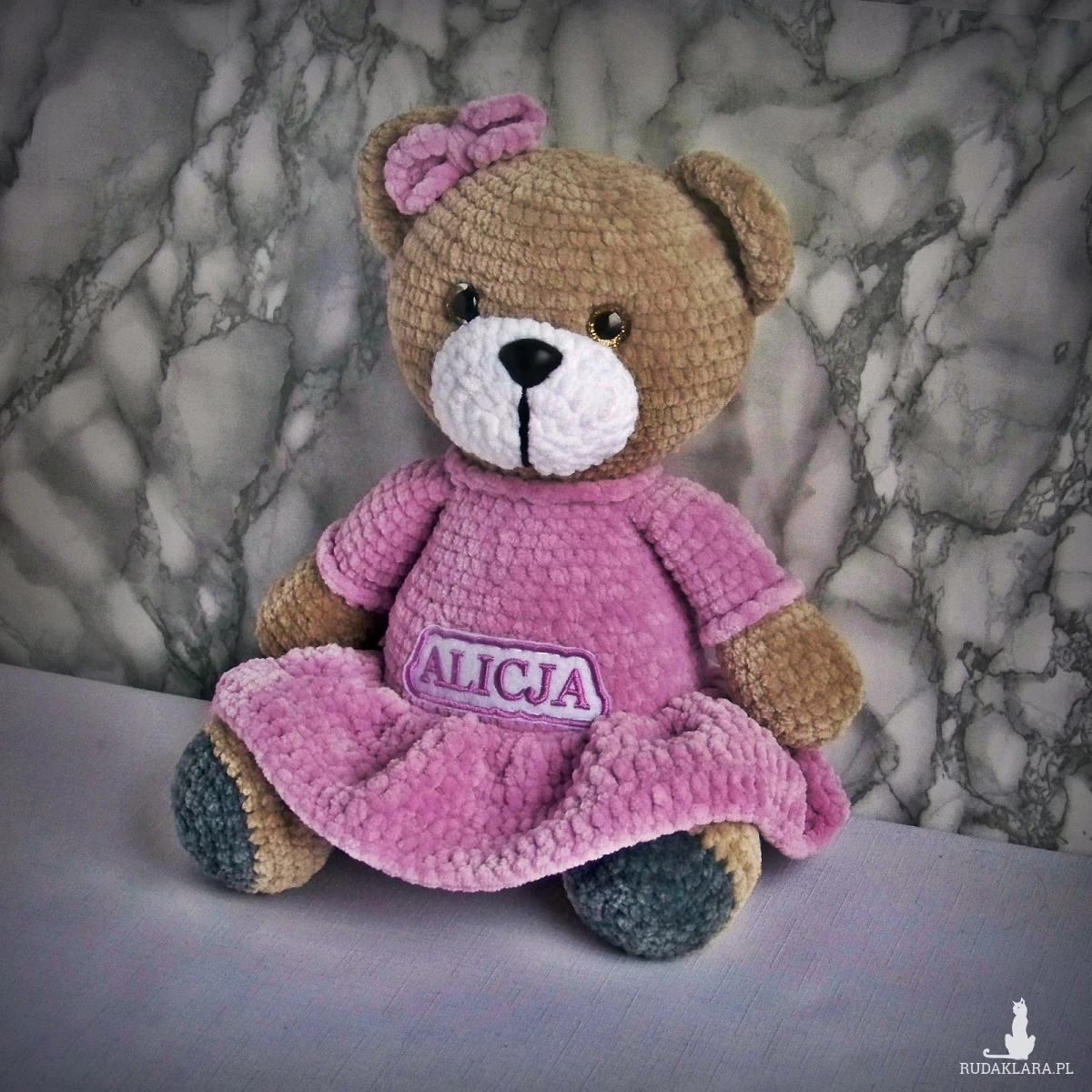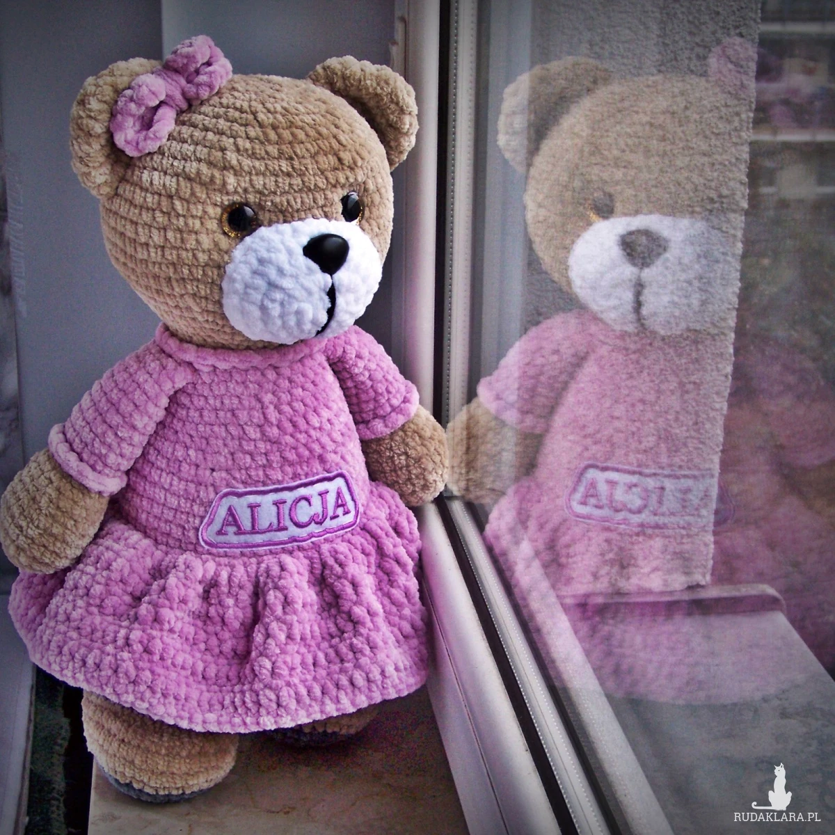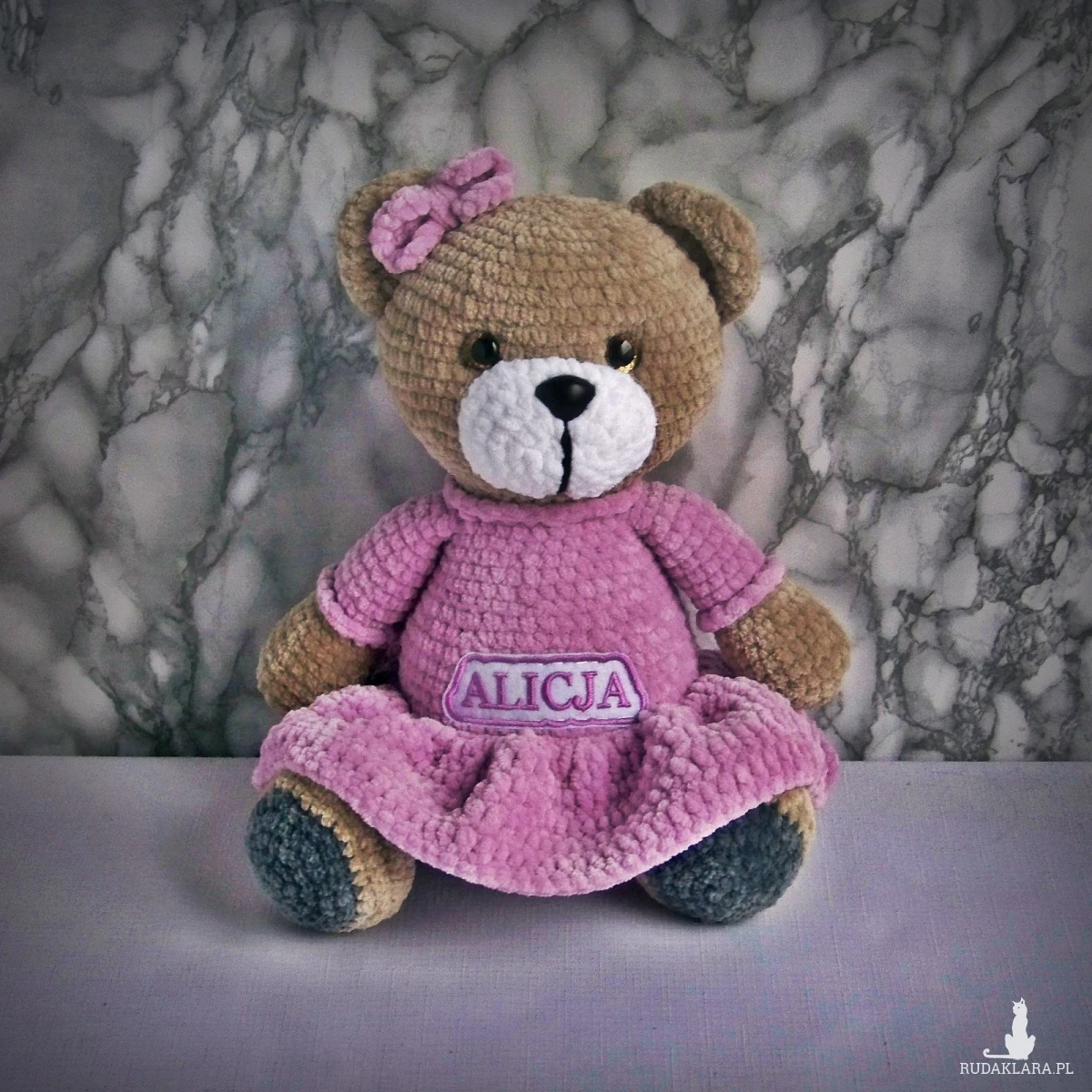 Szydełkowy miś Alicja 32cm we wrzosowej sukience (na zamówienie)