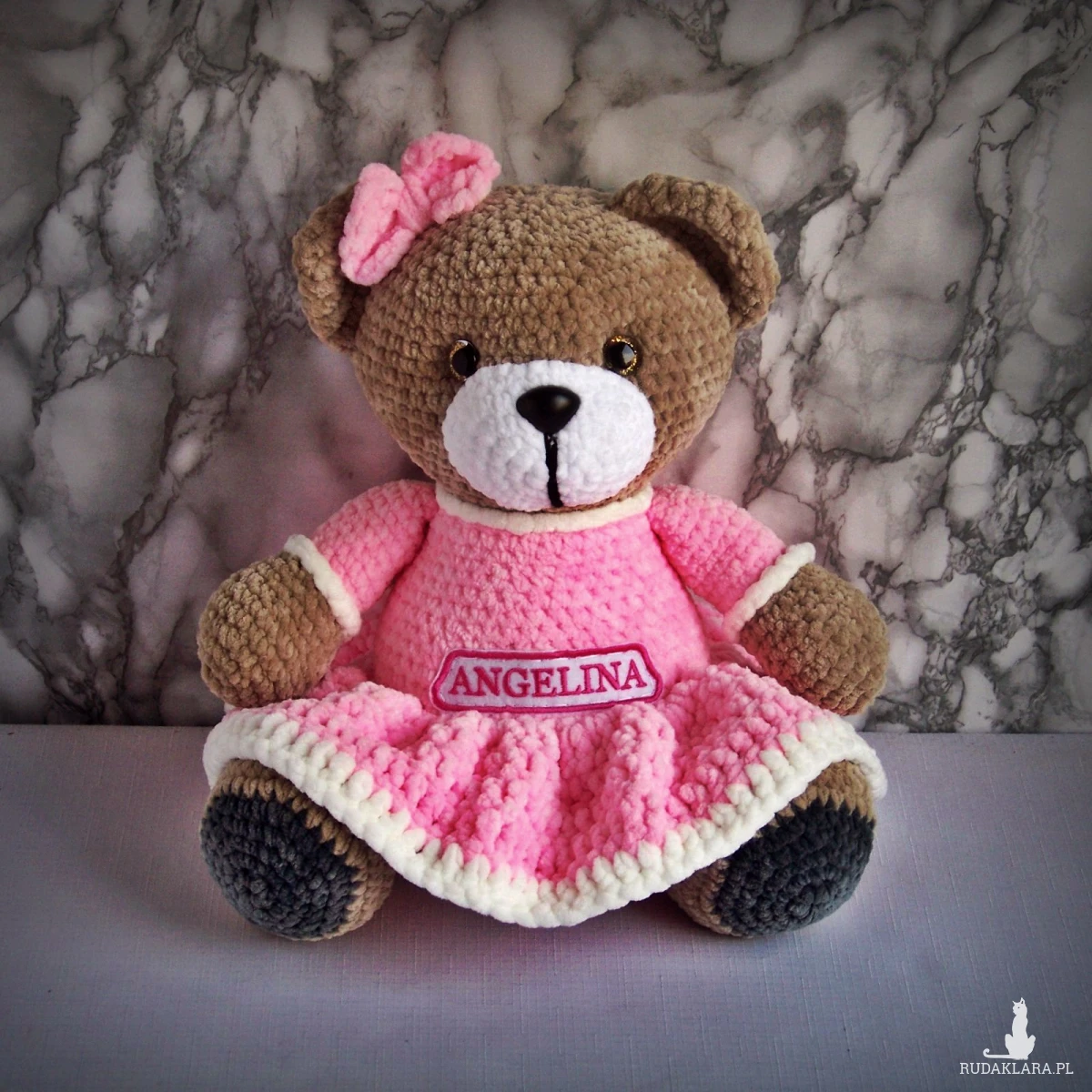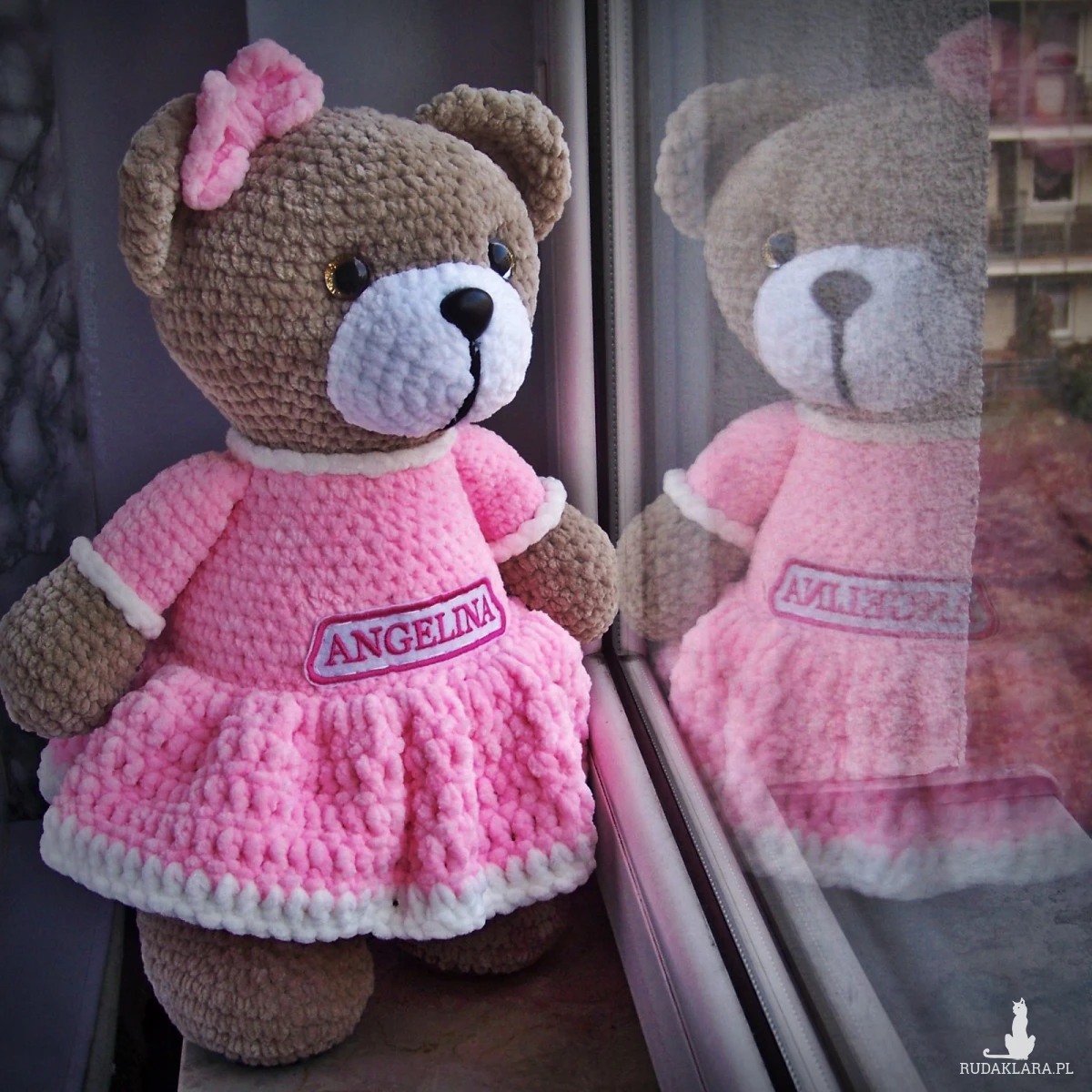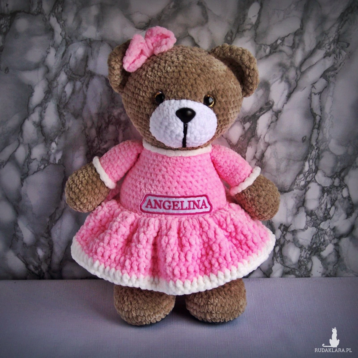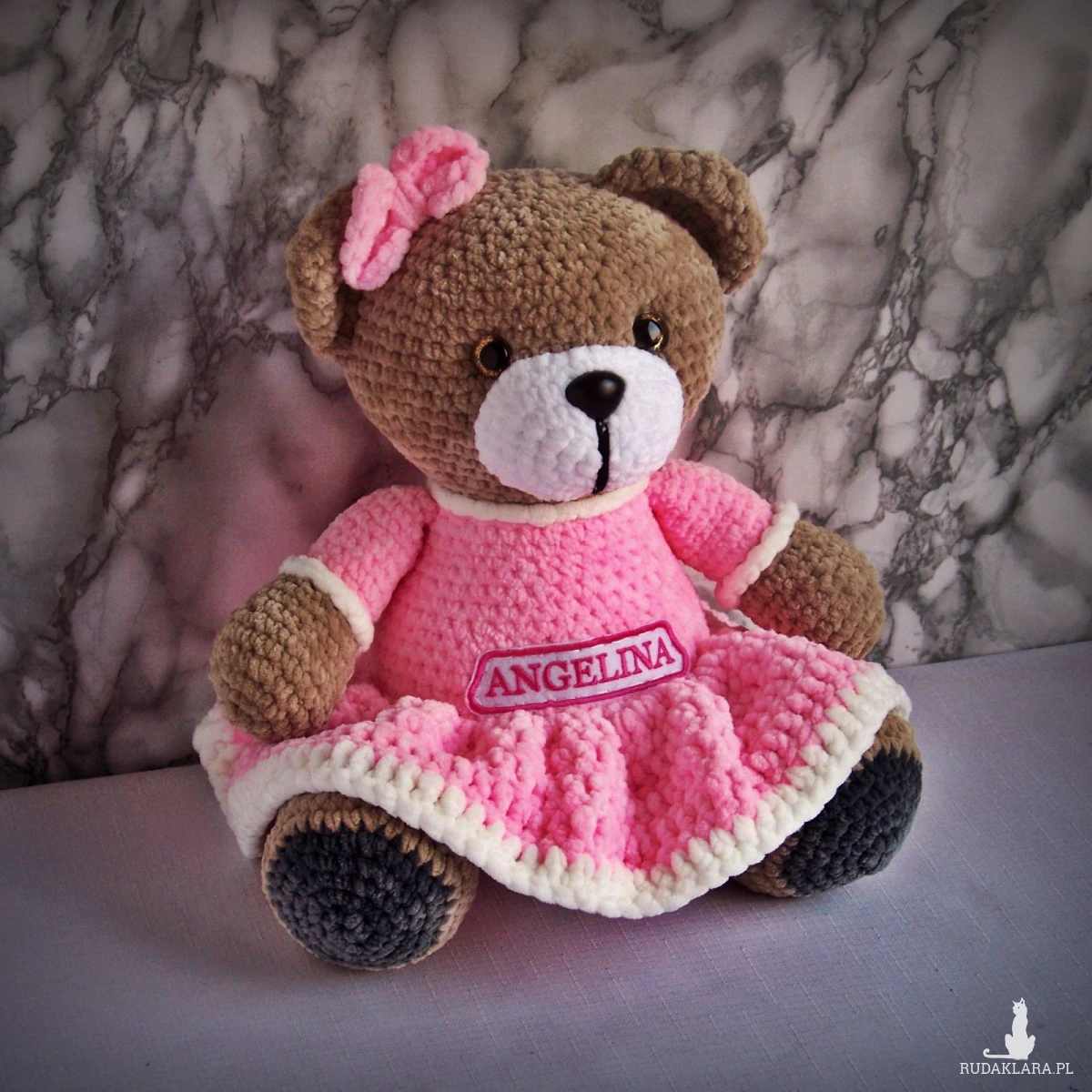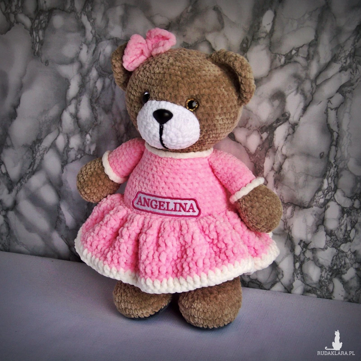 Szydełkowy miś Angelina 32cm w różowej sukience (na zamówienie)