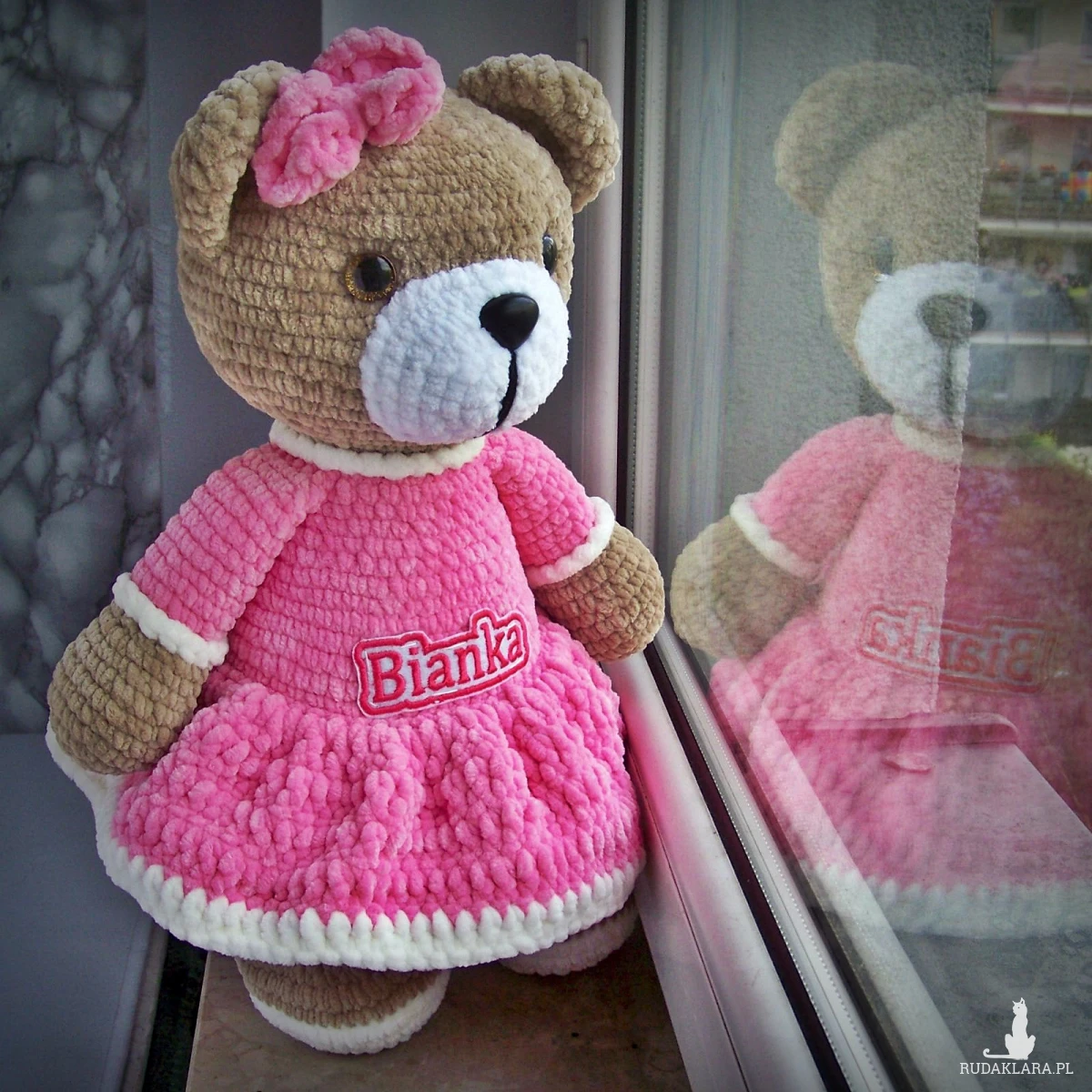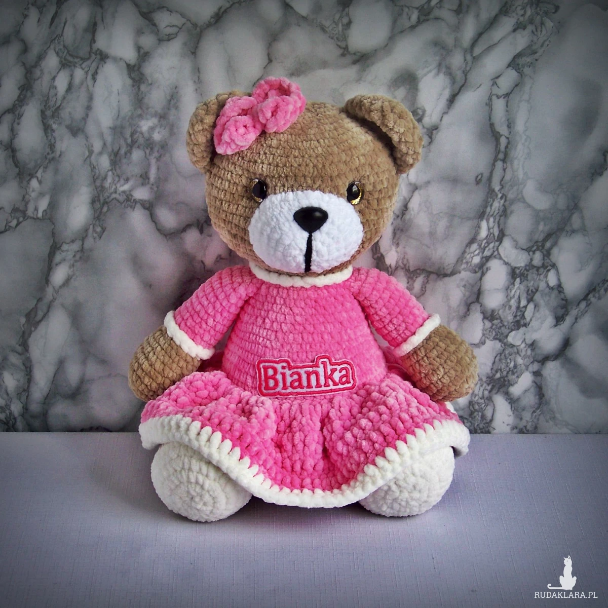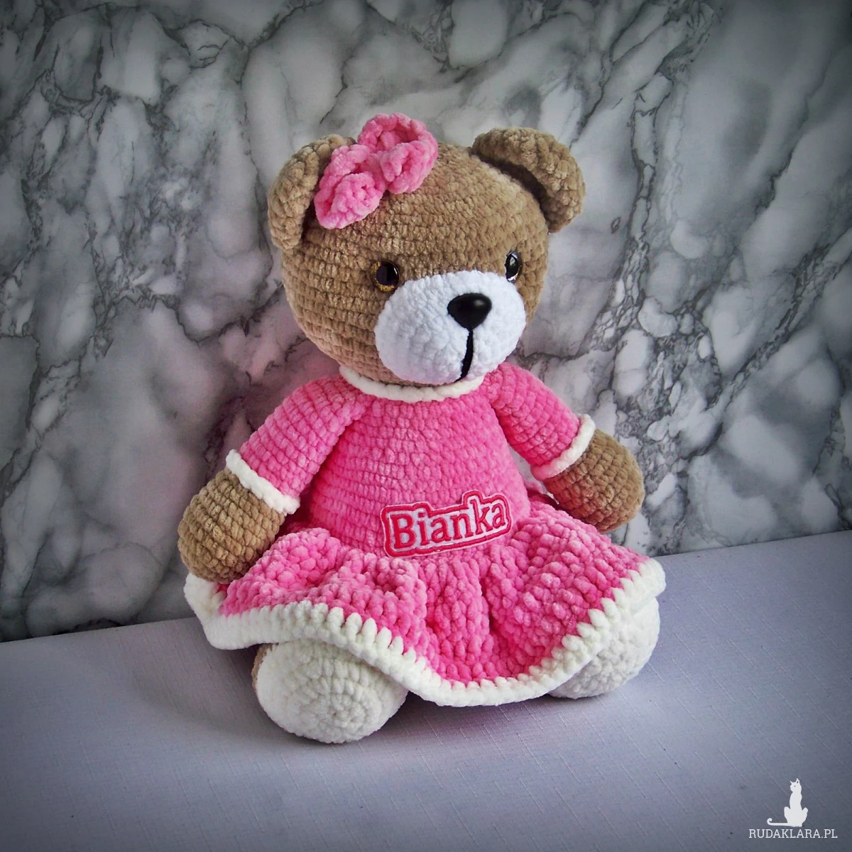 Szydełkowy miś Bianka 32cm w ciemnoróżowej sukience (na zamówienie)