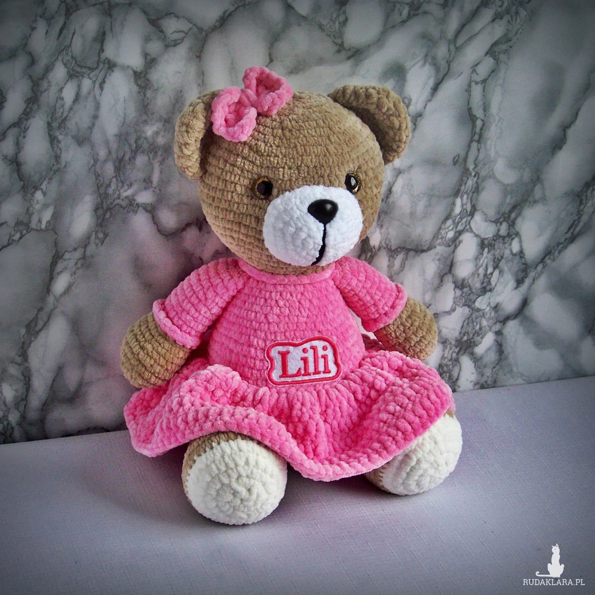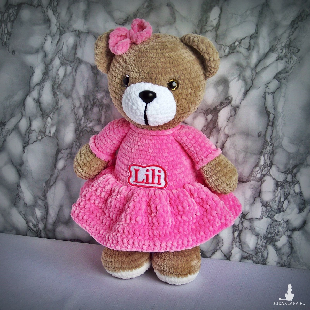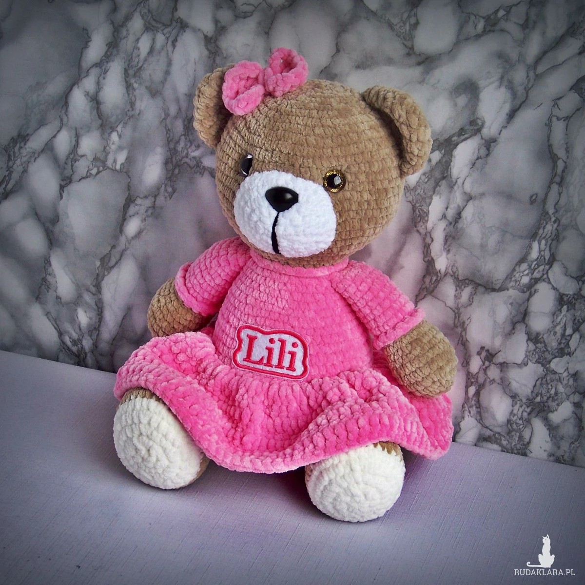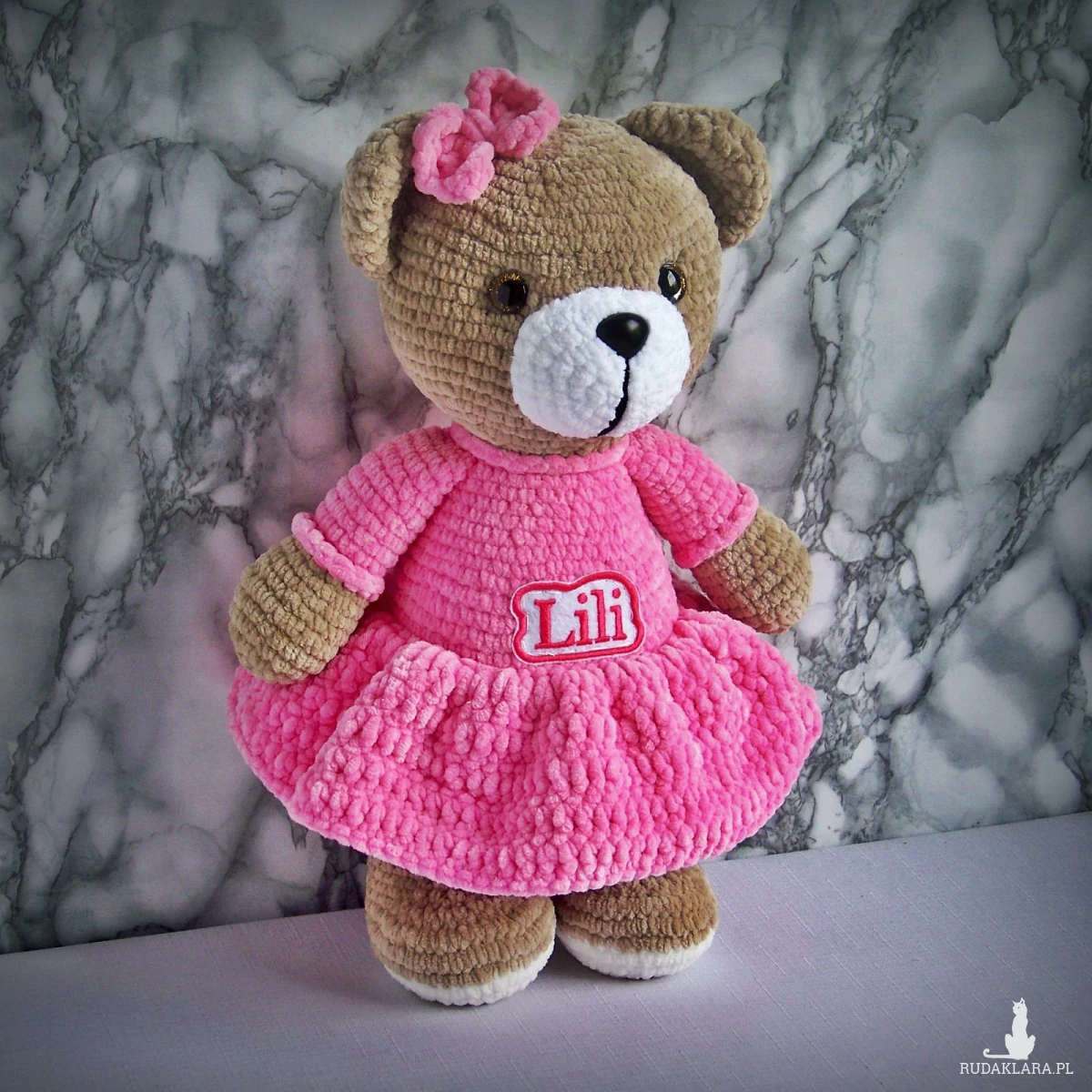 Szydełkowy miś Lili 32cm w ciemnoróżowej sukience (na zamówienie)