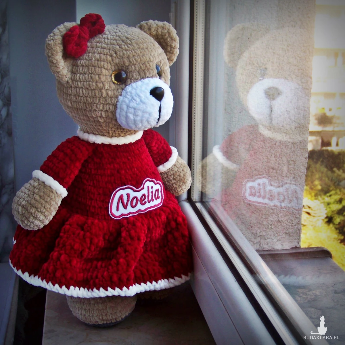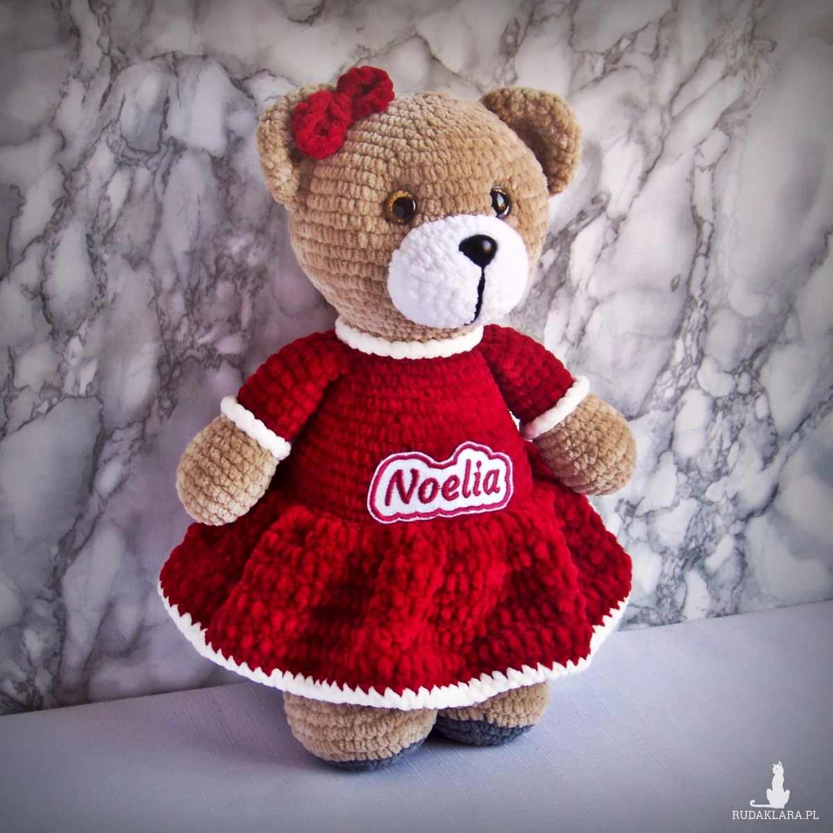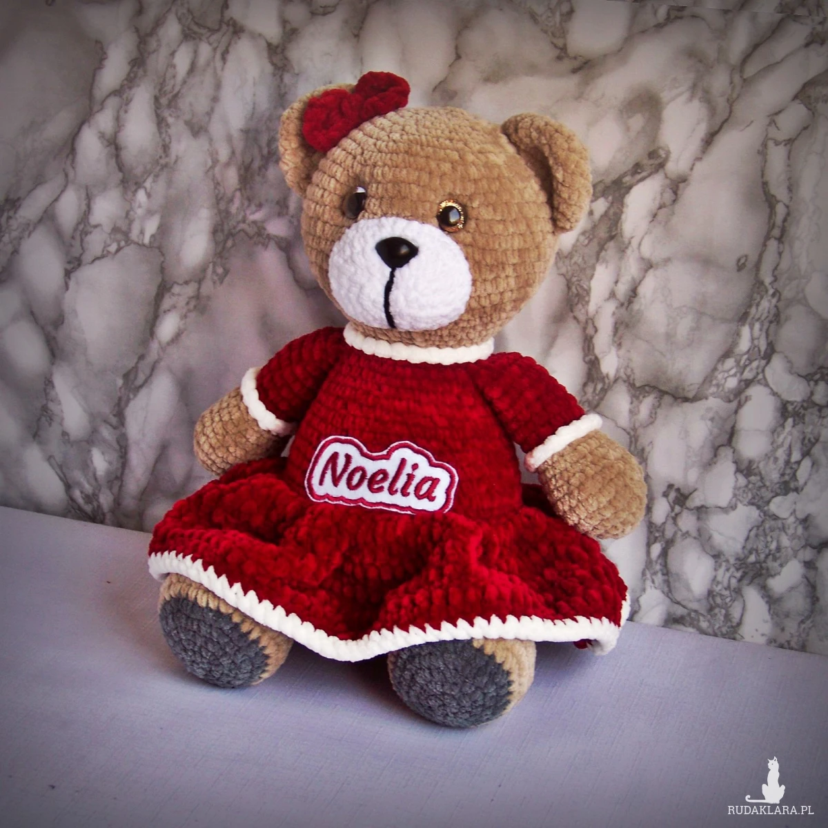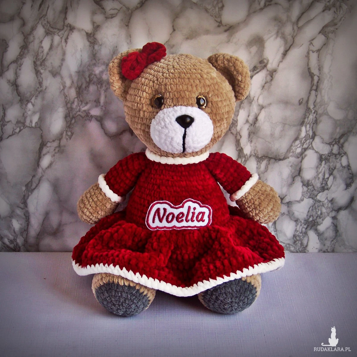 Szydełkowy miś Noelia 32cm w bordowej sukience (na zamówienie)