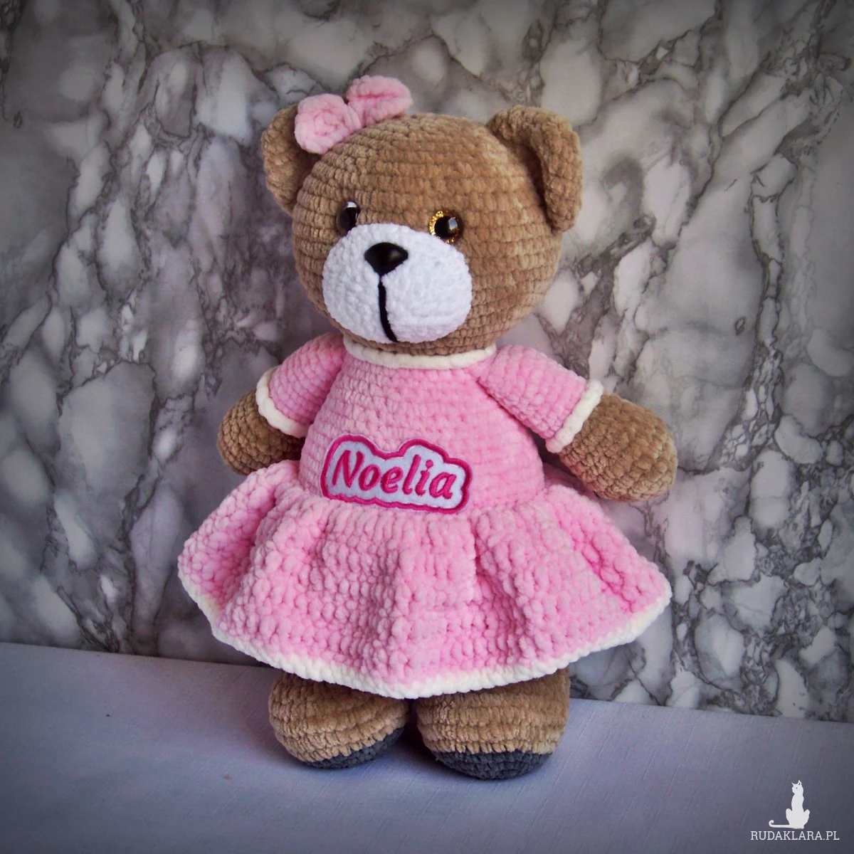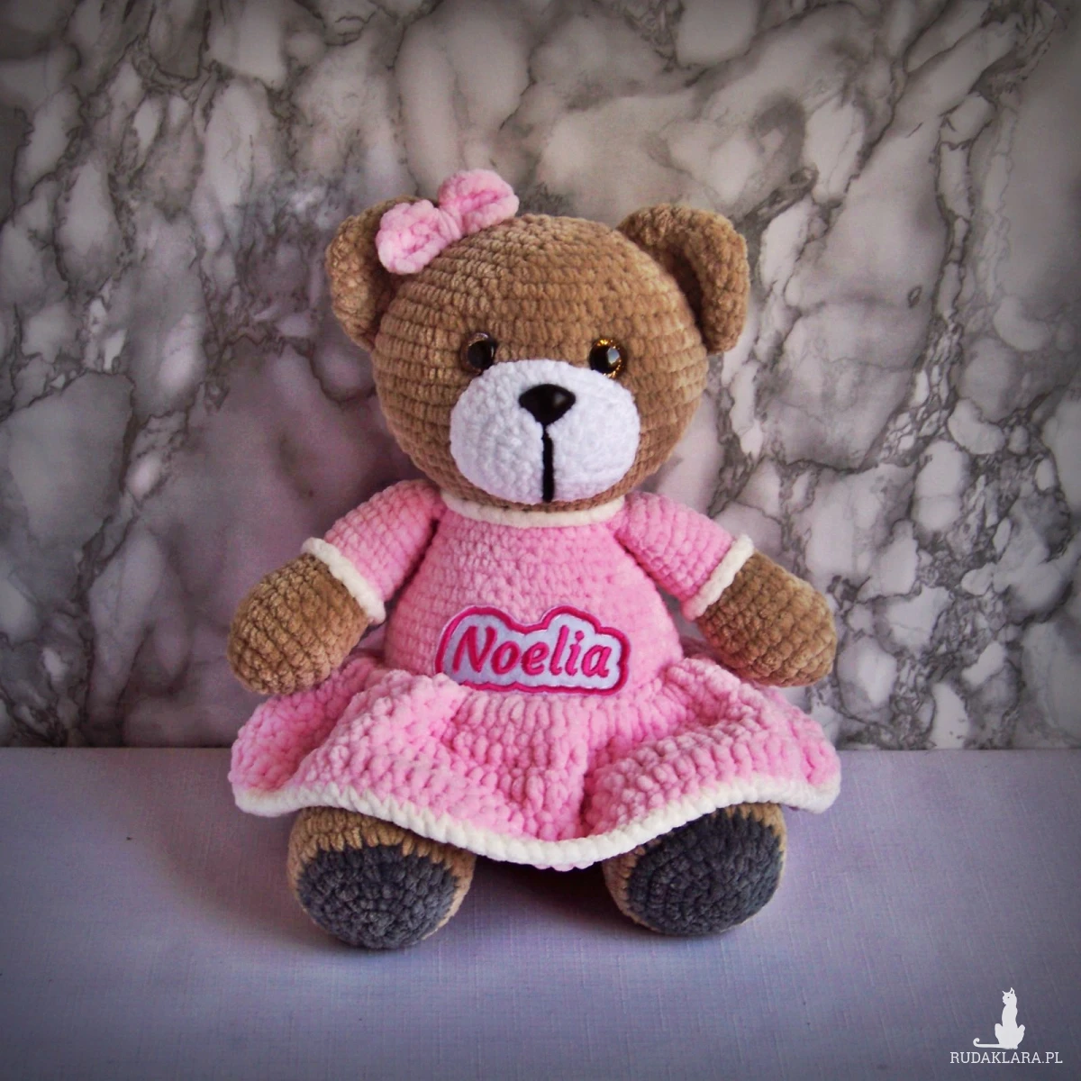 Szydełkowy miś Noelia 32cm w jasnoróżowej sukience (na zamówienie)