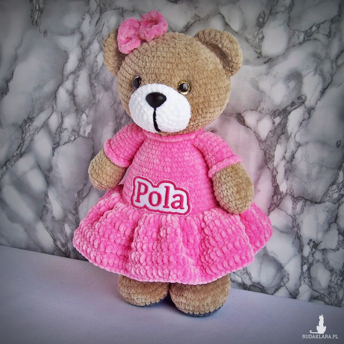 Szydełkowy miś Pola 32cm w ciemnoróżowej sukience (na zamówienie)