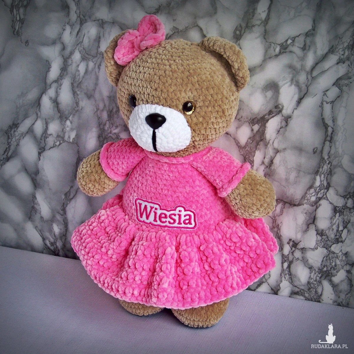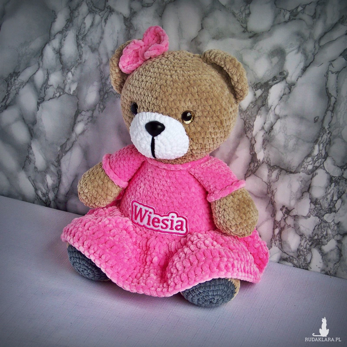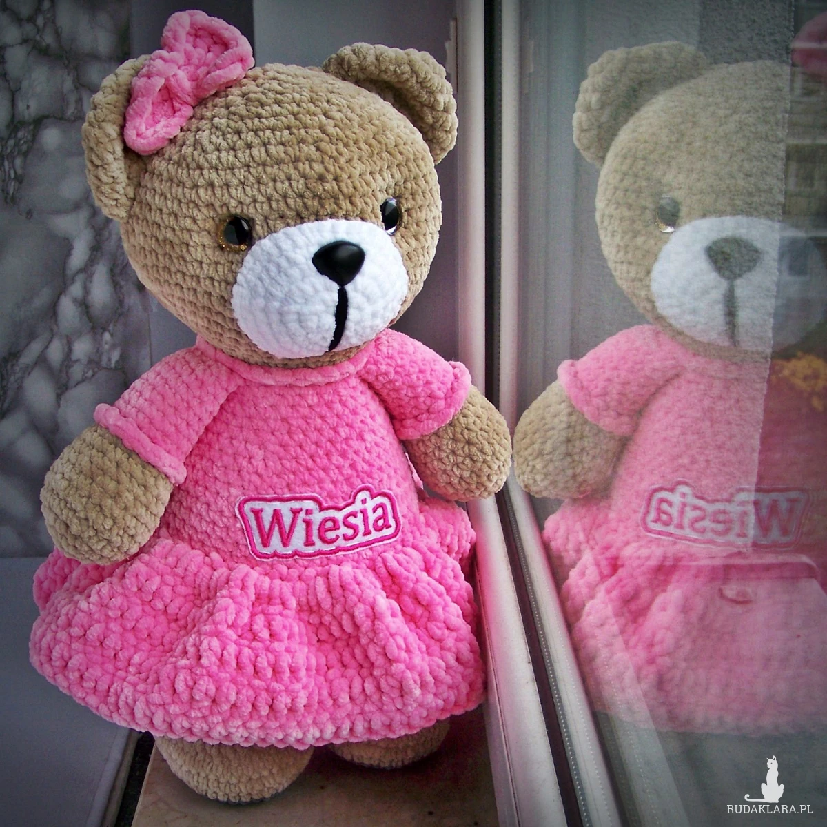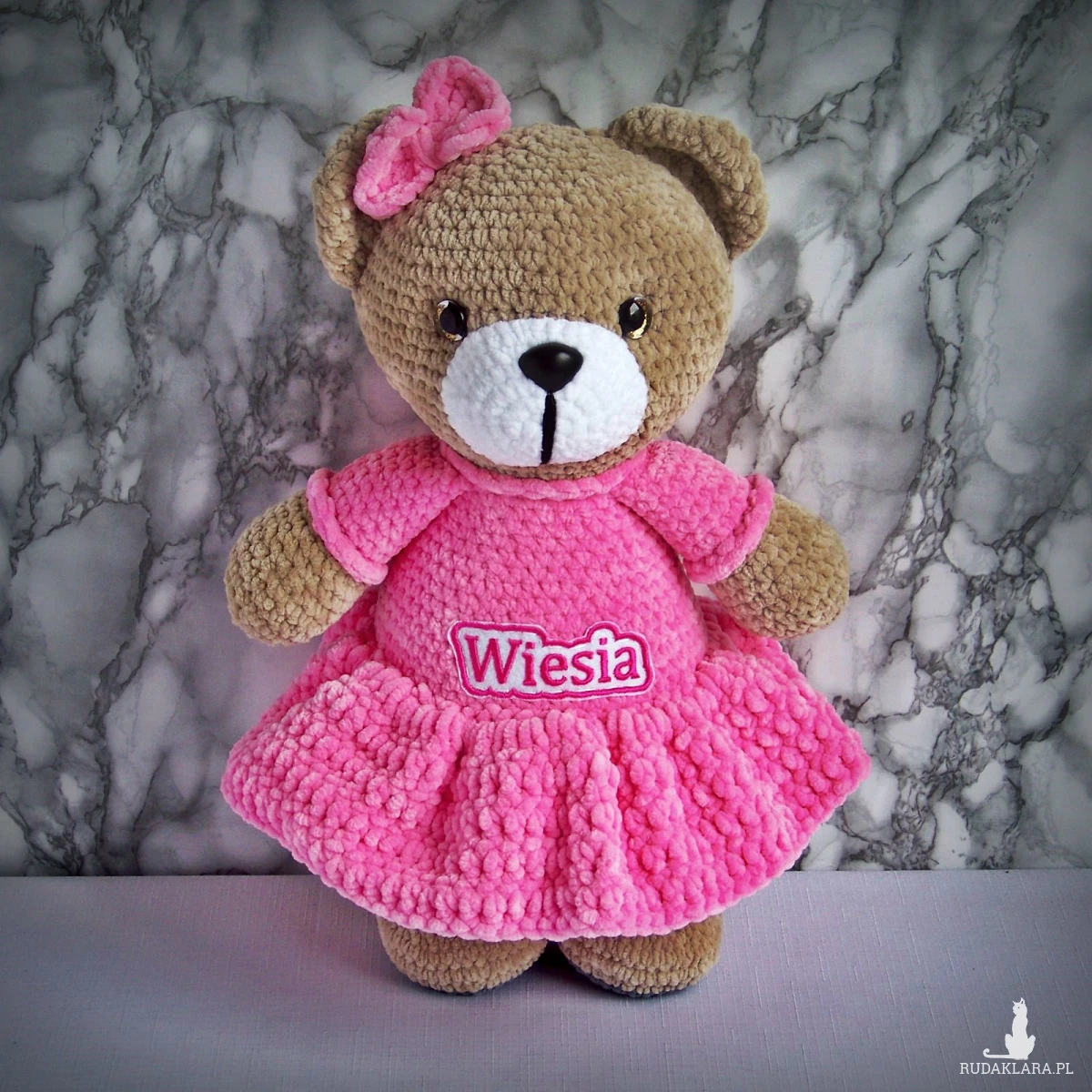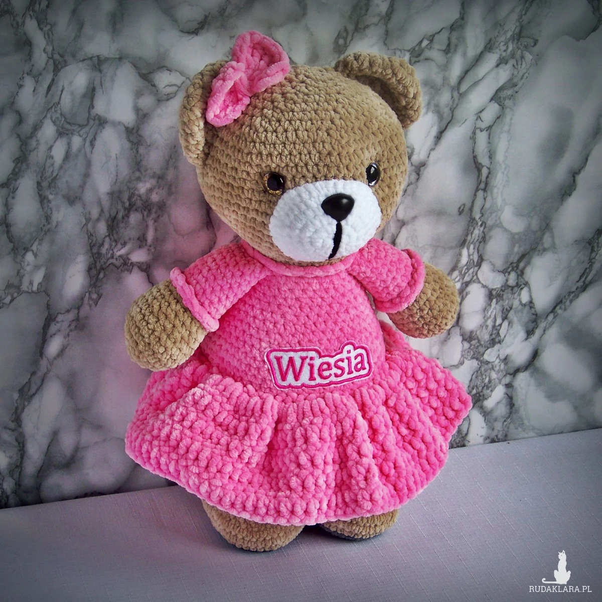 Szydełkowy miś Wiesia 32cm w ciemnoróżowej sukience (na zamówienie)