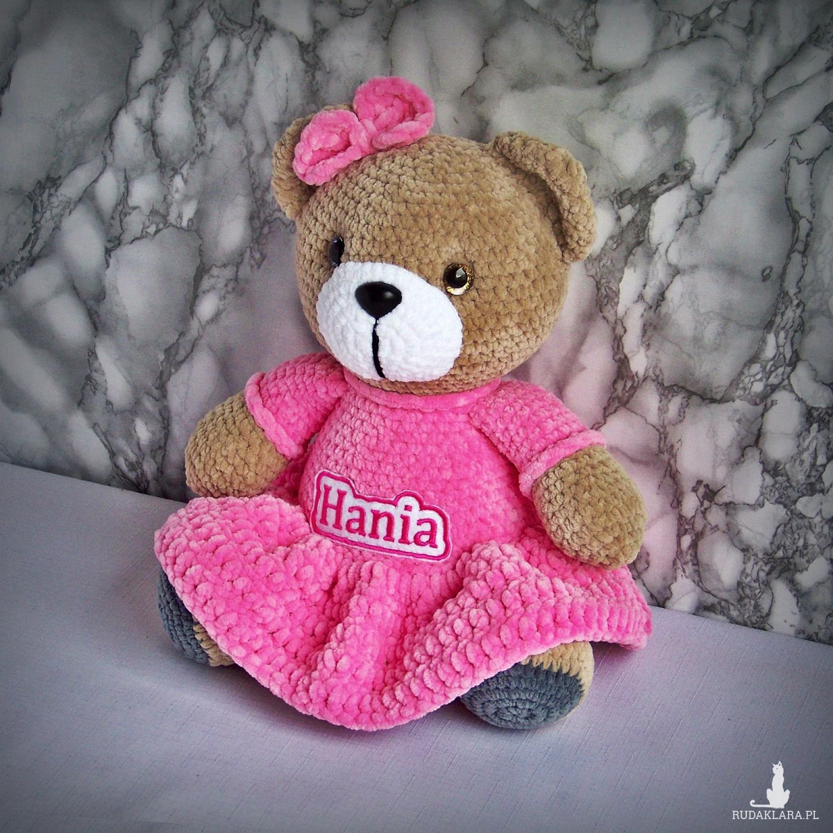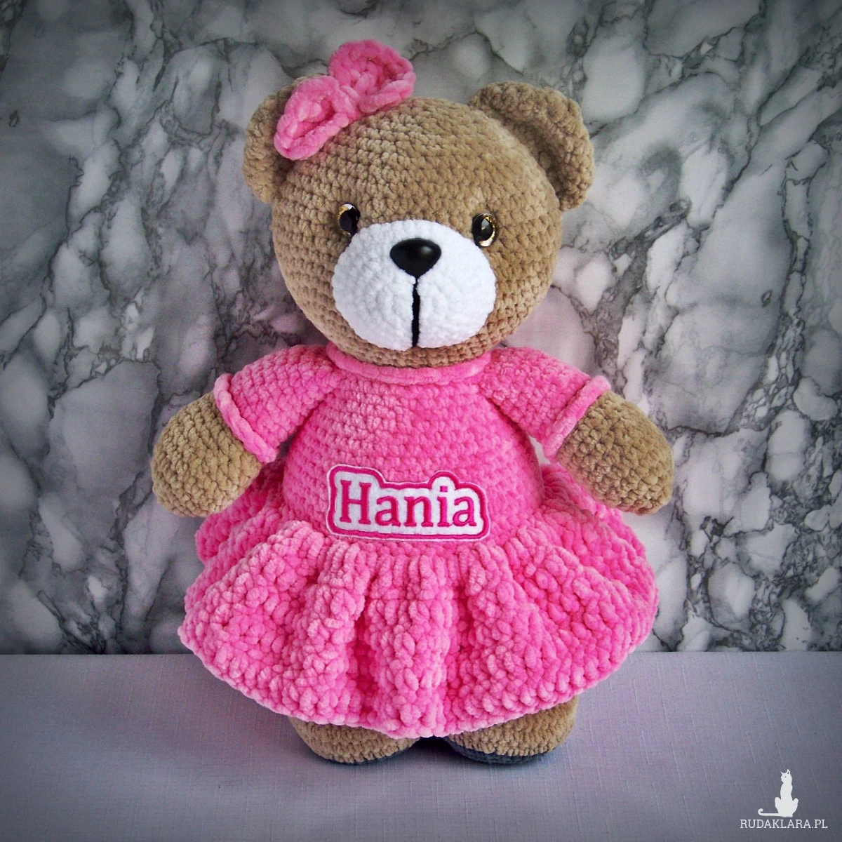 Szydełkowy miś Hania 32cm w ciemnoróżowej sukience (na zamówienie)