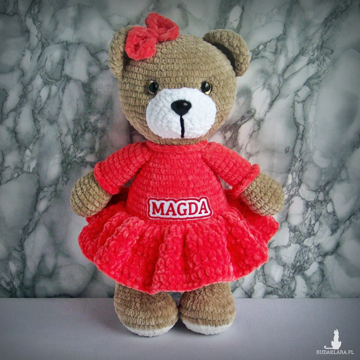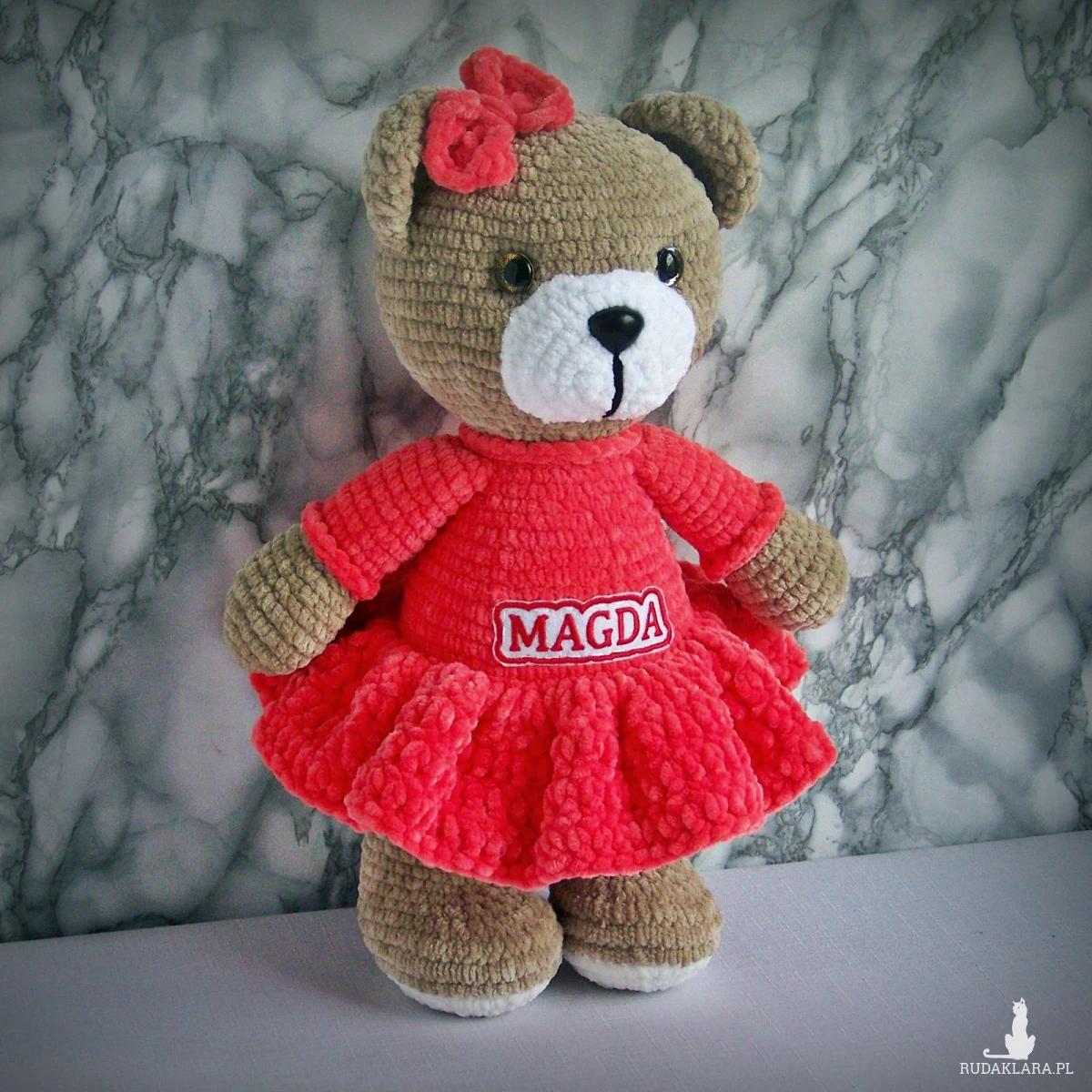 Szydełkowy miś Magda 32cm w koralowej sukience (na zamówienie)