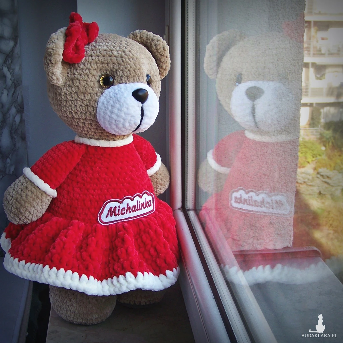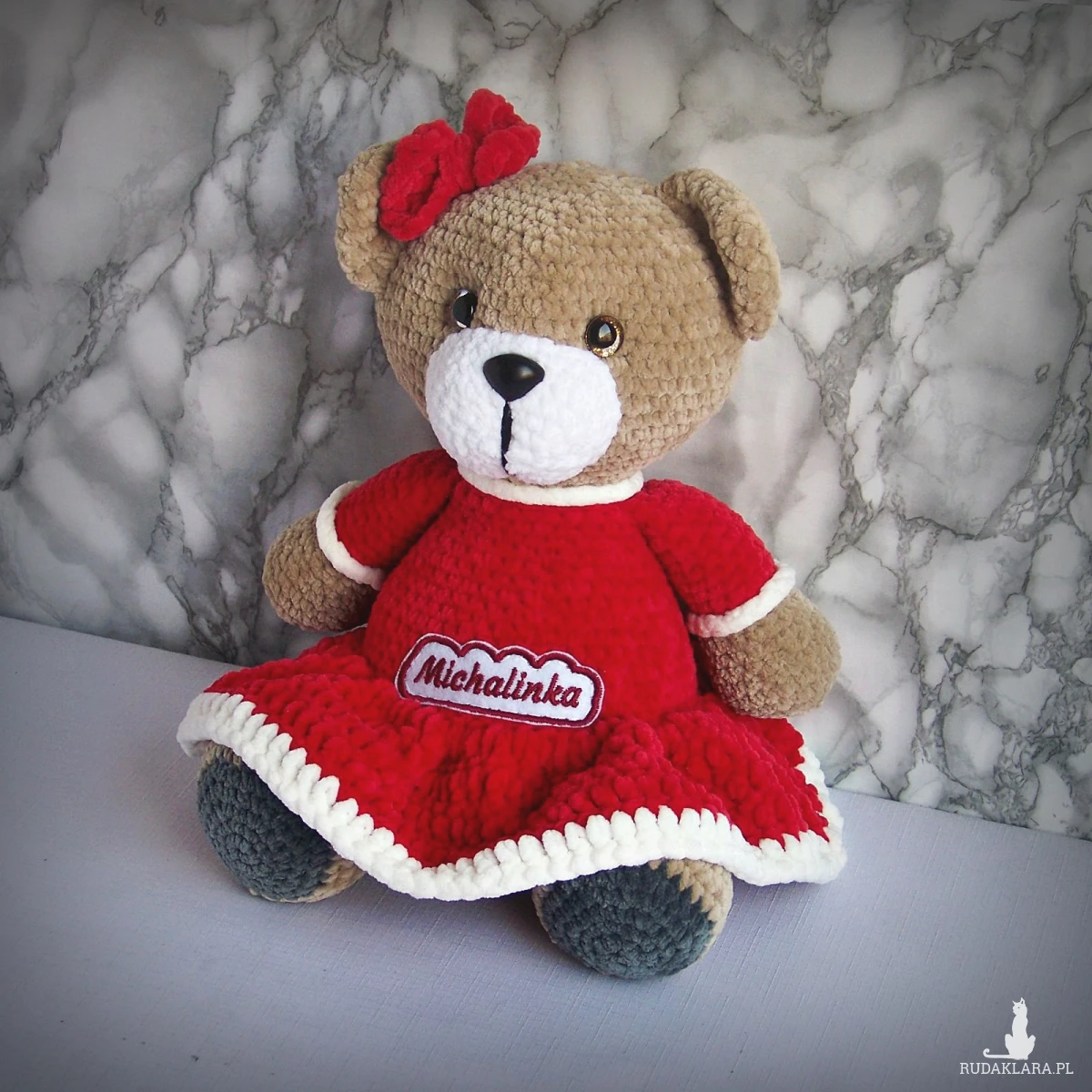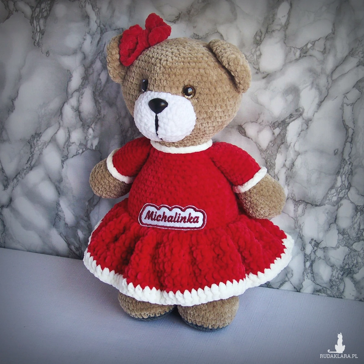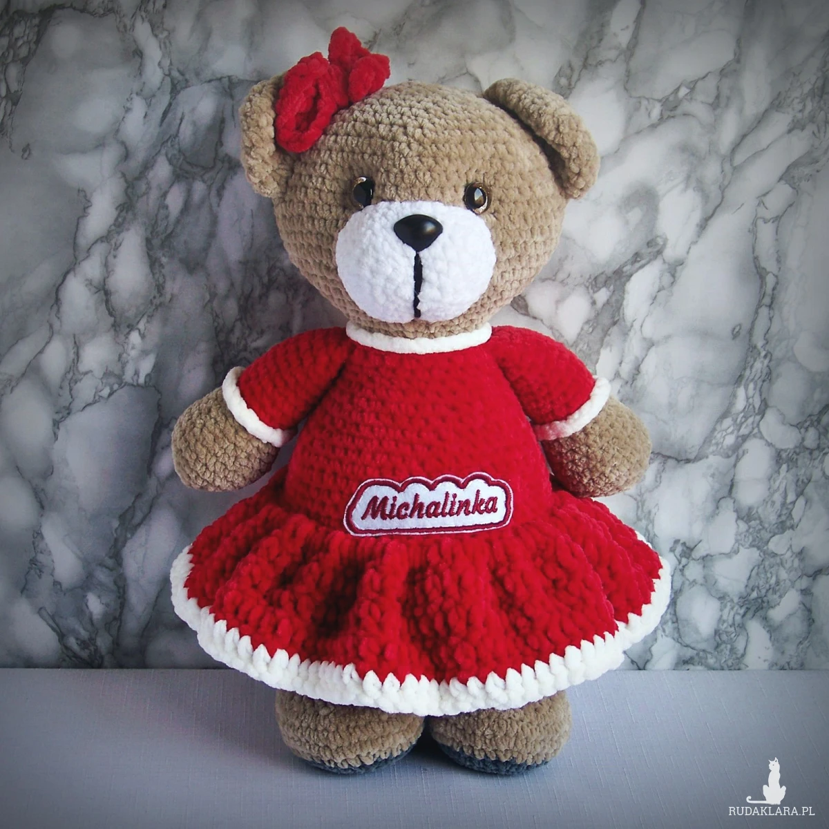 Szydełkowy miś Michalinka 32cm w czerwonej sukience (na zamówienie)