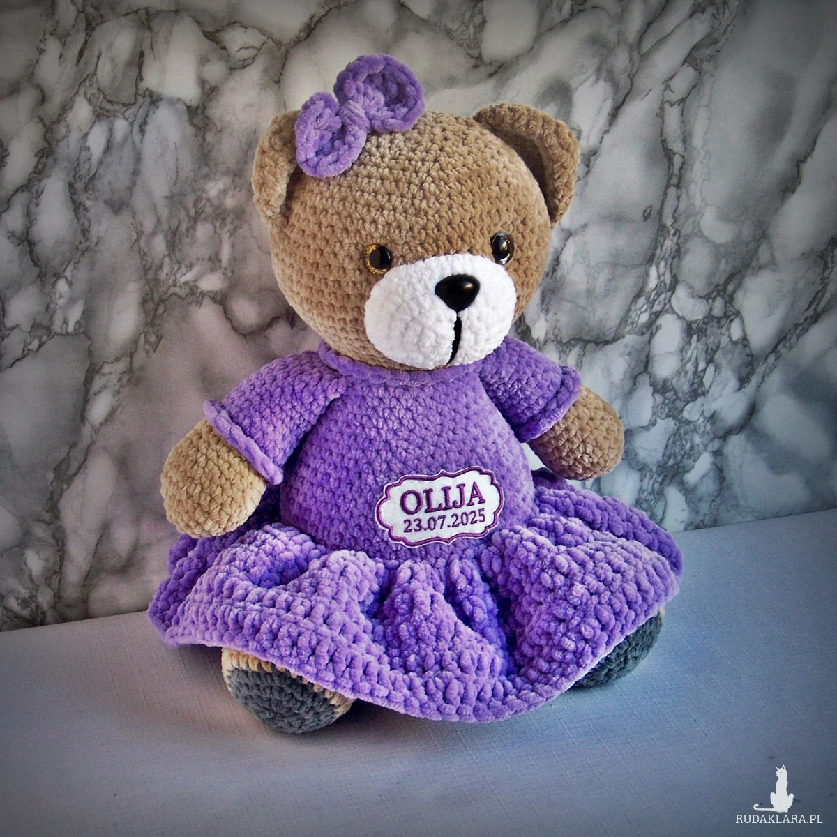 Miś jest zrobiony z bardzo delikatnej i miłej w dotyku włóczki, jest to certyfikowana włóczka antyalergiczna w 100% bezpieczna dla skóry. Nosek i oczka są trwale zaklipsowane, nie da się ich wyrwać. Imię na misiu będzie zrobione takie, jakie będzie potrzebowała osoba zamawiająca misia. Zamiast imienia może też być inny napis, nie może tylko on być zbyt długi. Miś może być misiem do przytulania, ale także może być misiem dekoracyjnym, który doda ciepła i uroku każdemu wnętrzu 😊 Wysokość misia to ok. 31-32 cm (na stojąco).