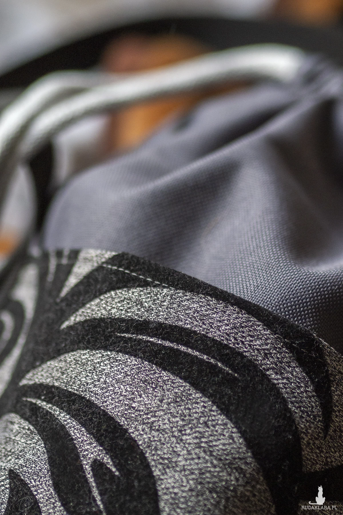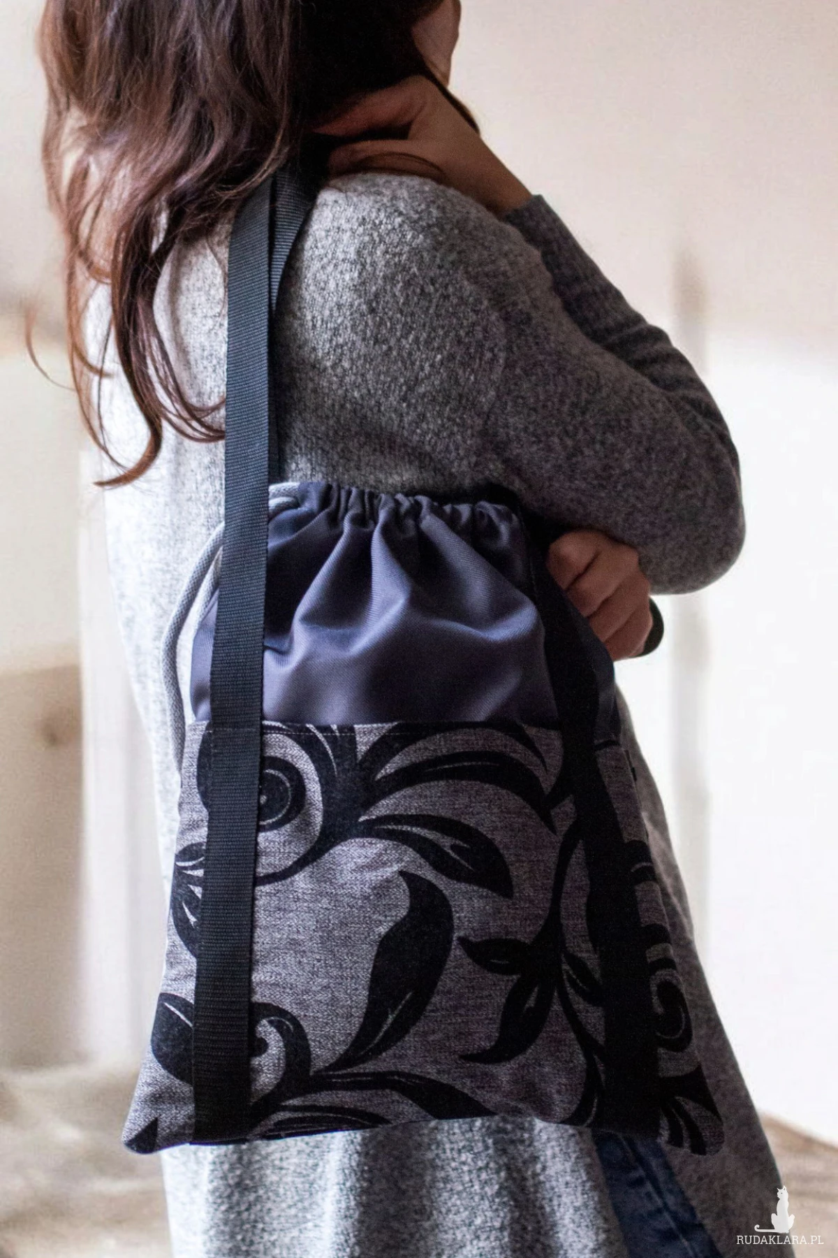 Torba na ramię z kominem, ściągana jak worek, w kolorze szarym. Z przodu i z tyłu torebki duże otwarte kieszenie.