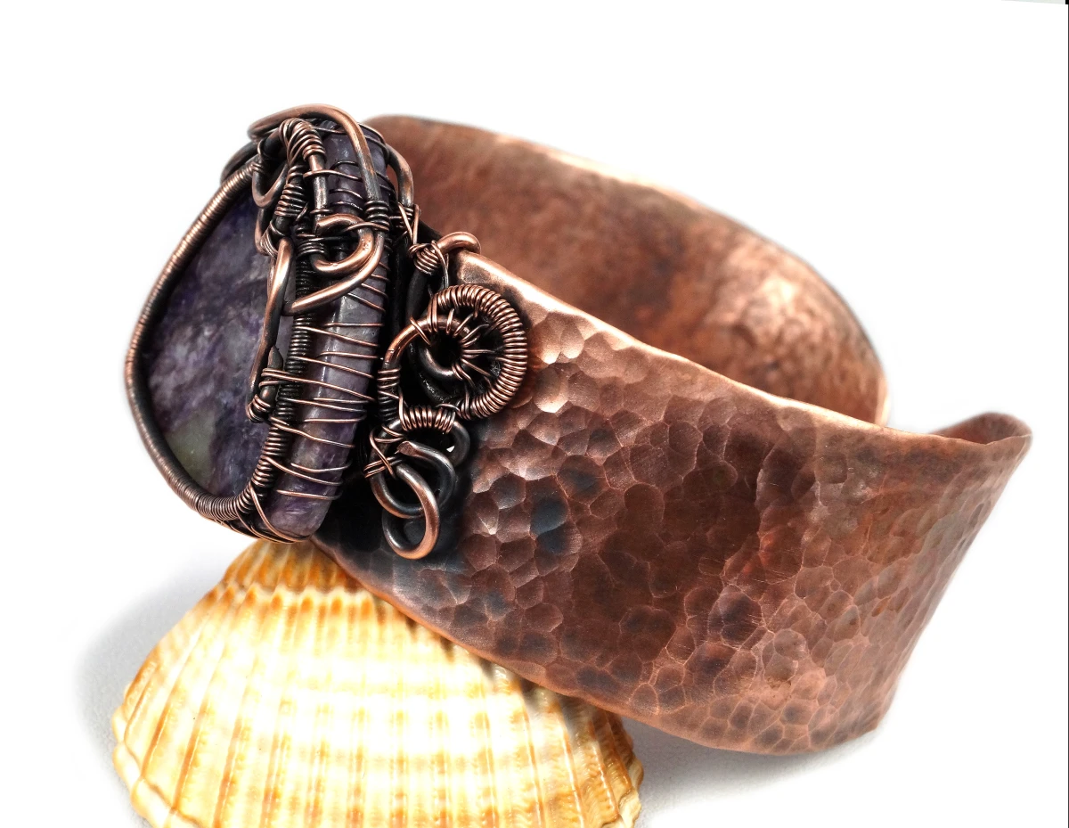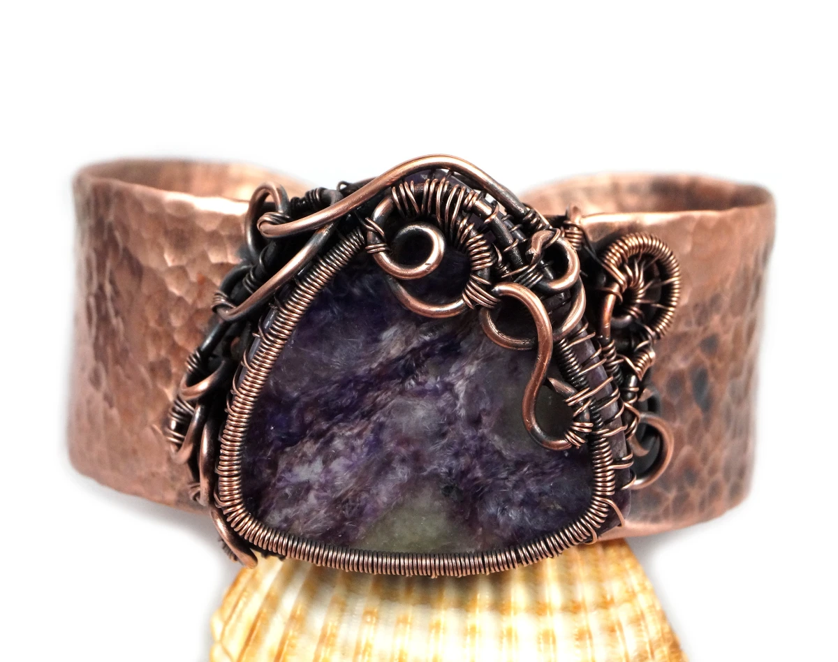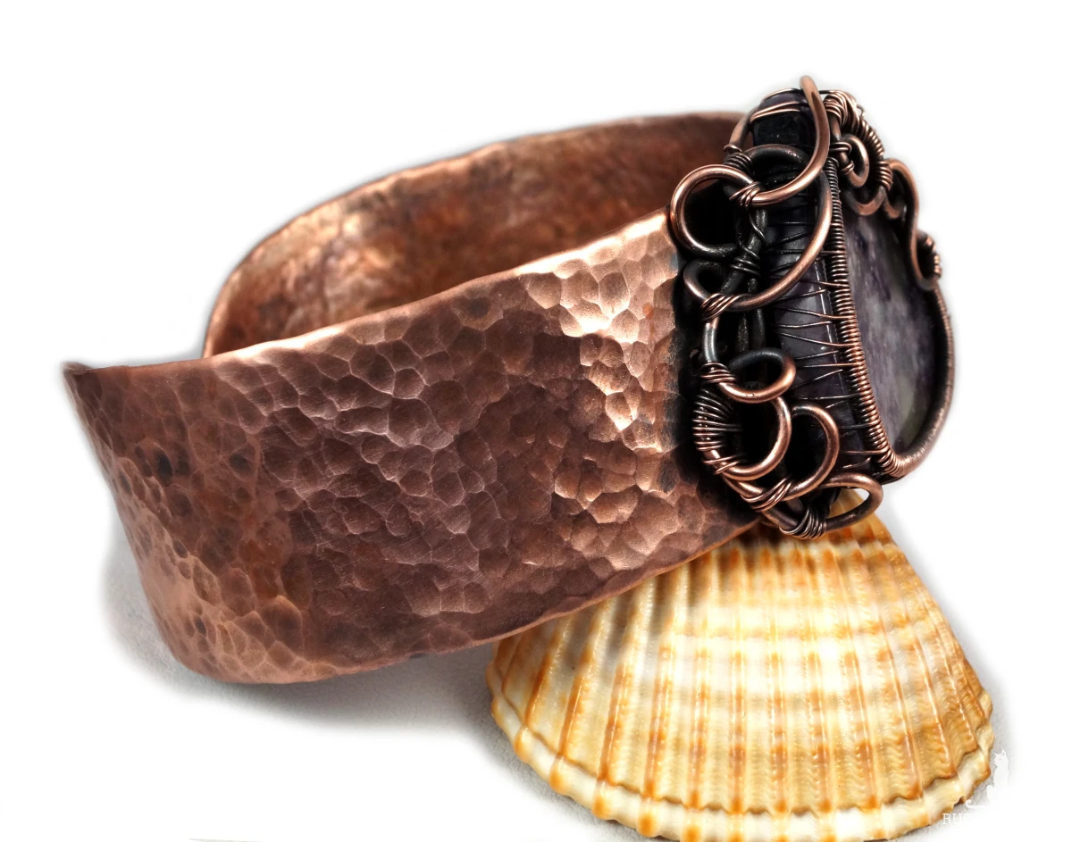 Bajeczna, misternie wykonana bransoletka z patynowanej miedzi z kaboszonem czaroitu. Bransoletka wykonana z młotkowanej miedzi i z kaboszonu czaroitu osadzonego w technice wire wrapping. Bransoletka regulowana. Miedz młotkowana, patynowana polerowana i przecierana.