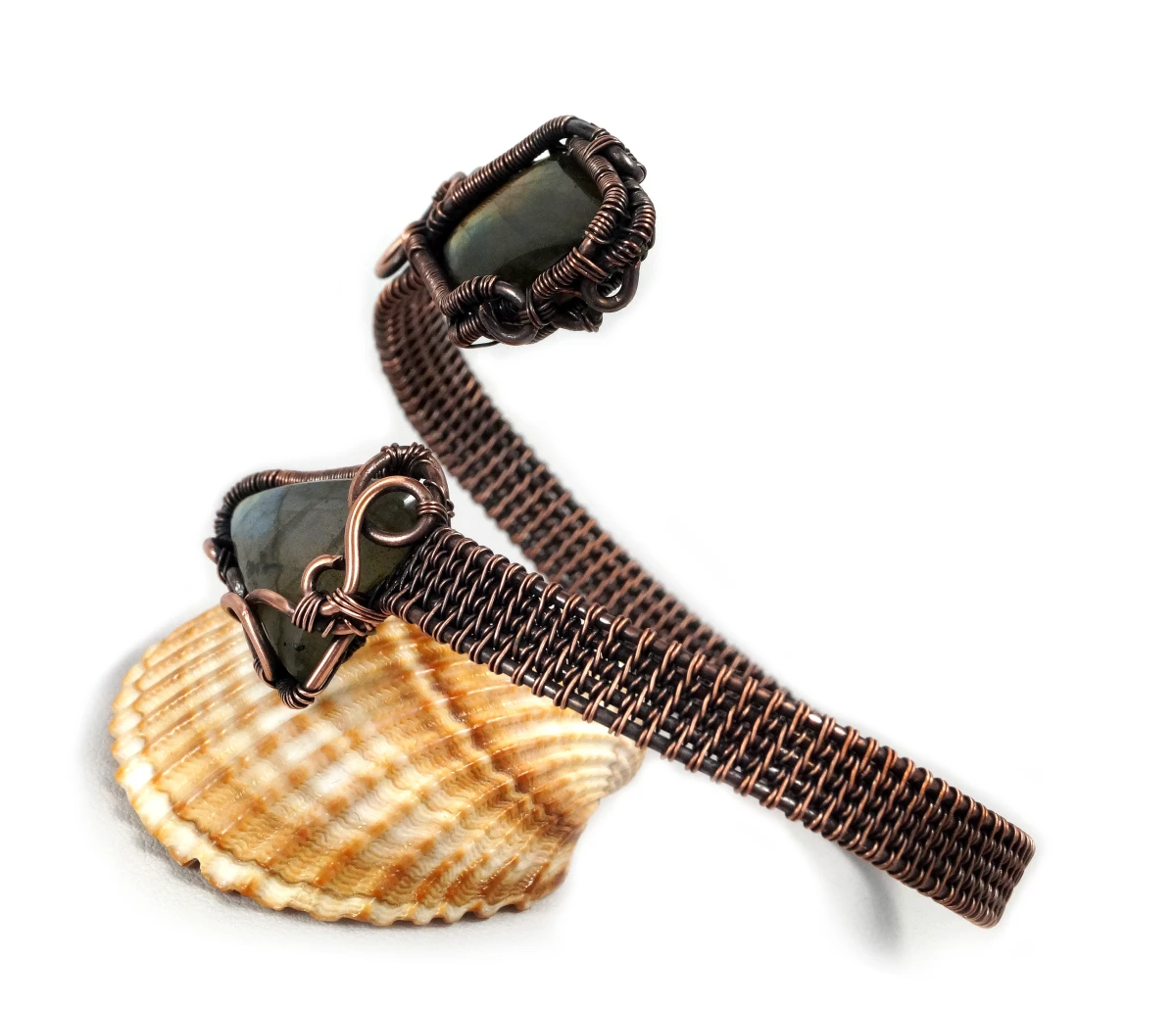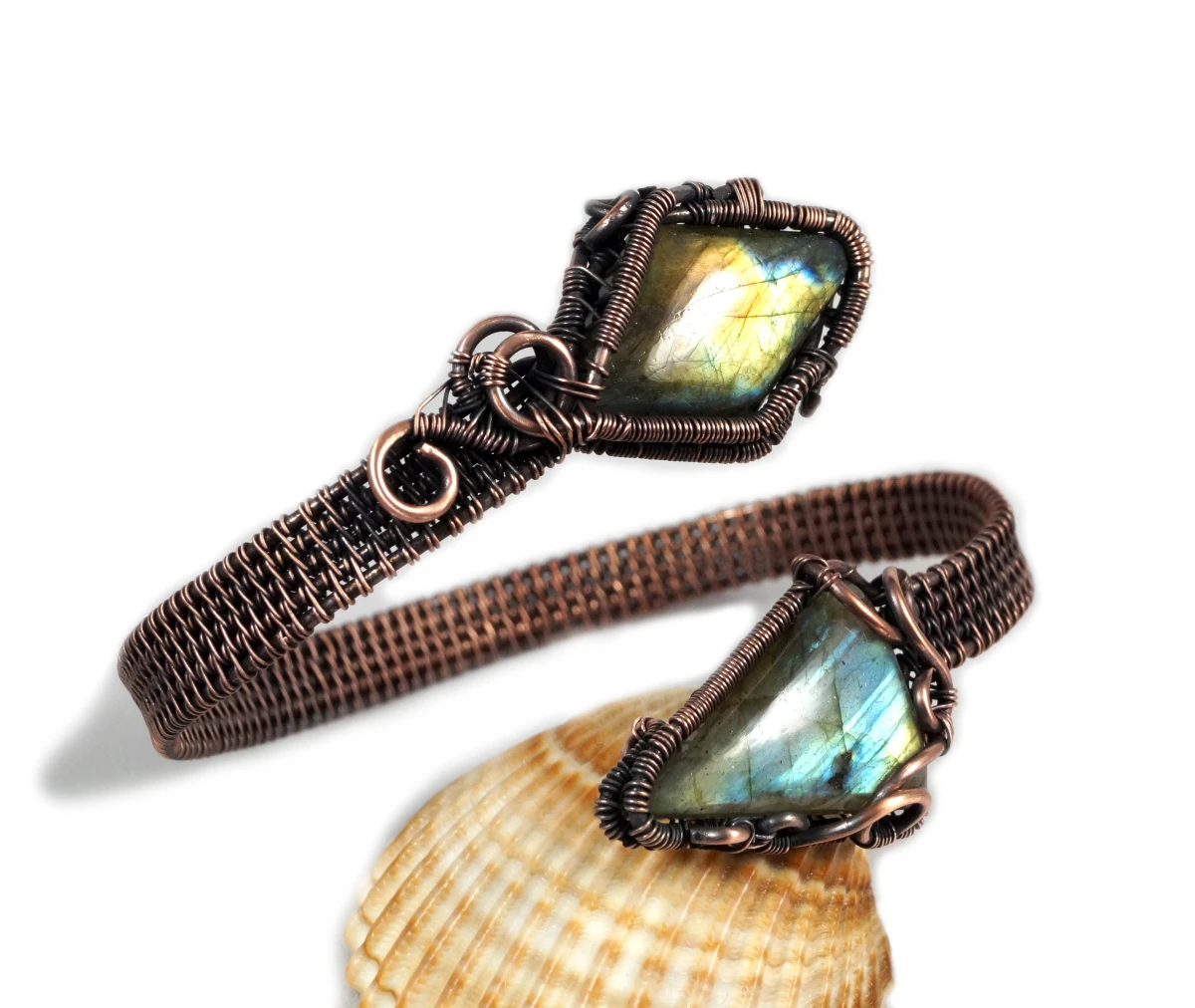 Bajeczna, misternie wykonana bransoletka z patynowanej miedzi z dwoma kaboszonami labradorytu w niebieskio pomarańczowym kolorze. Bransoletka wykonana w bardzo pracochłonnej technice wire wrapped. Bransoletka regulowana.