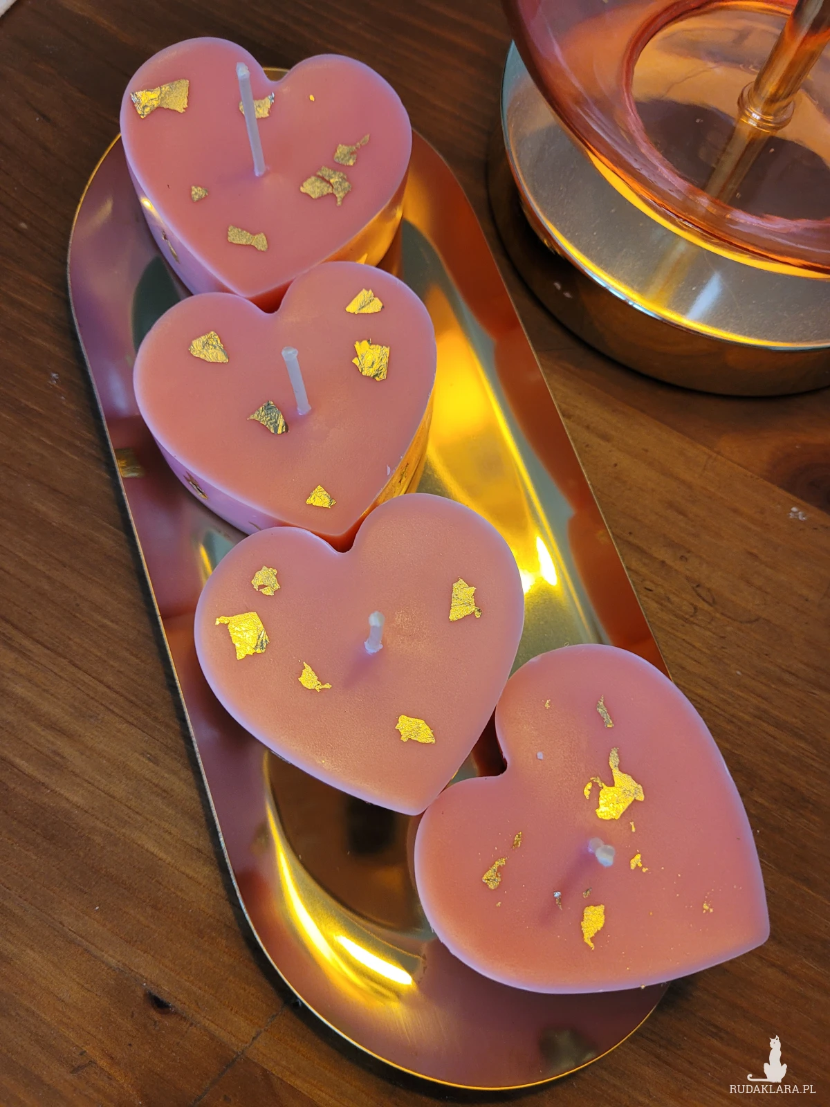 Zestaw świec sojowych handmade na zlotej tacce. Świece ozdobiłam płatkami złotej folii.