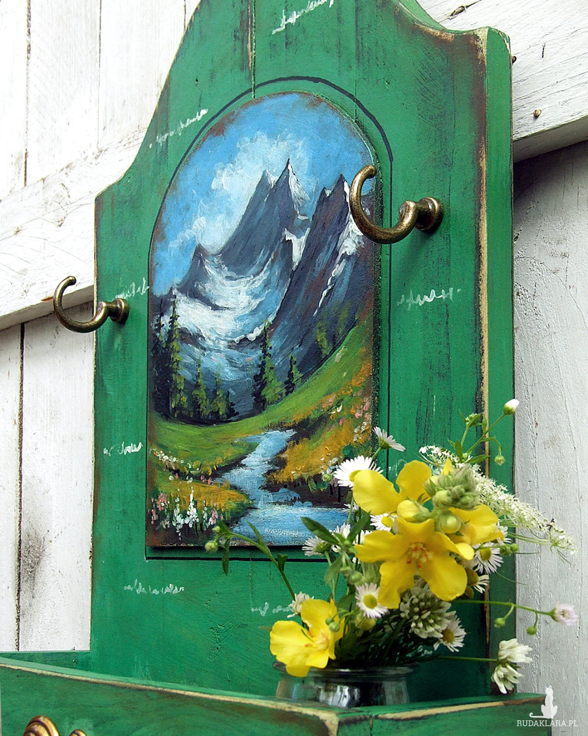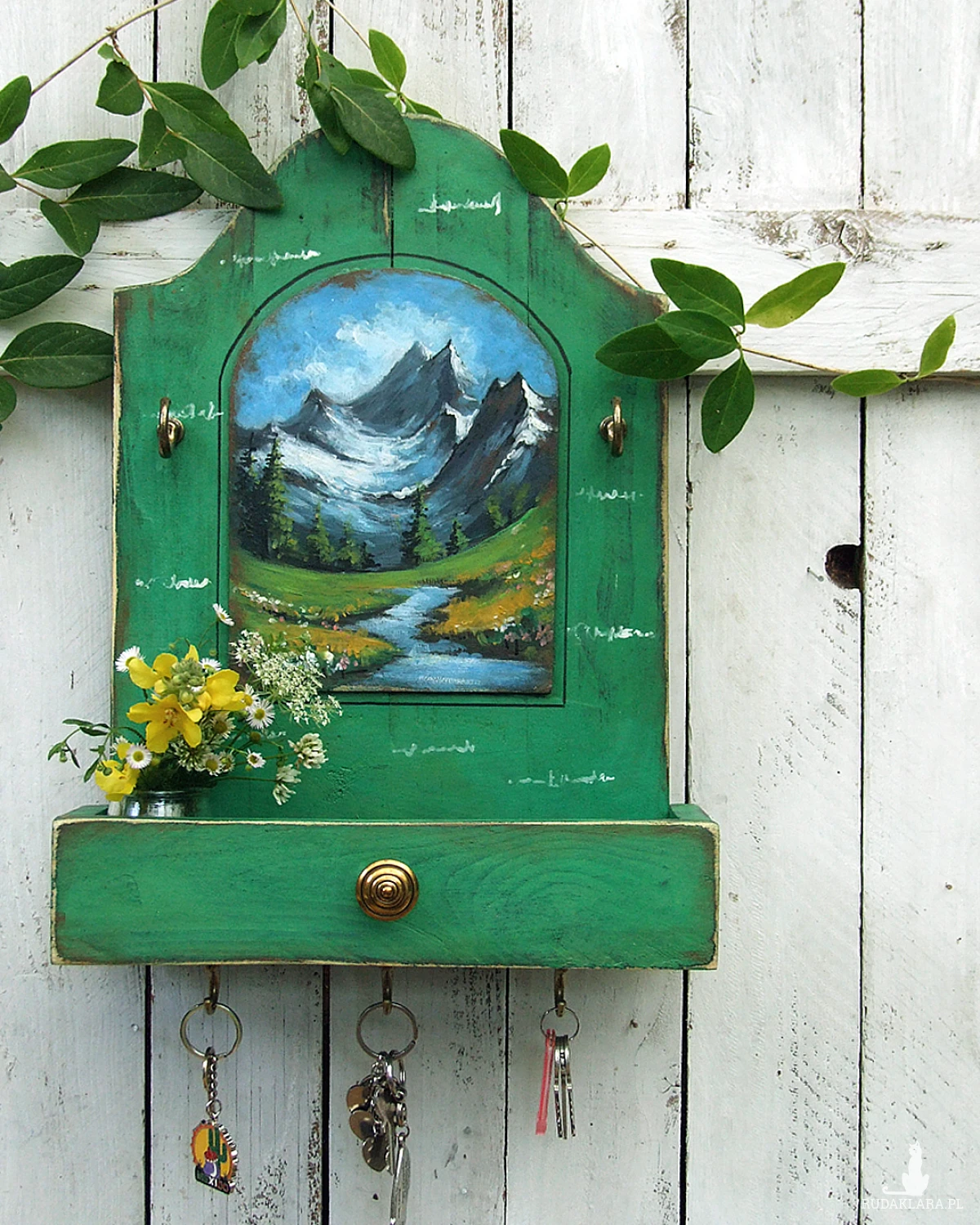 Drewniany wieszaczek, organizer, z półeczką przypominającą wysuniętą szufladkę i z malowanym pejzażem - funkcjonalna dekoracja do kuchni, przedpokoju lub łazienki.