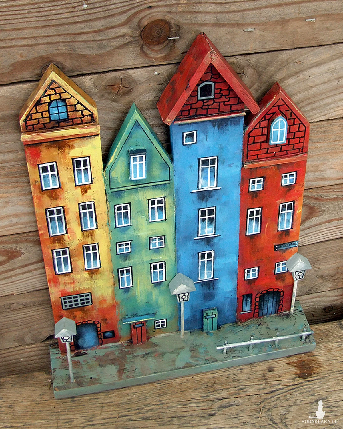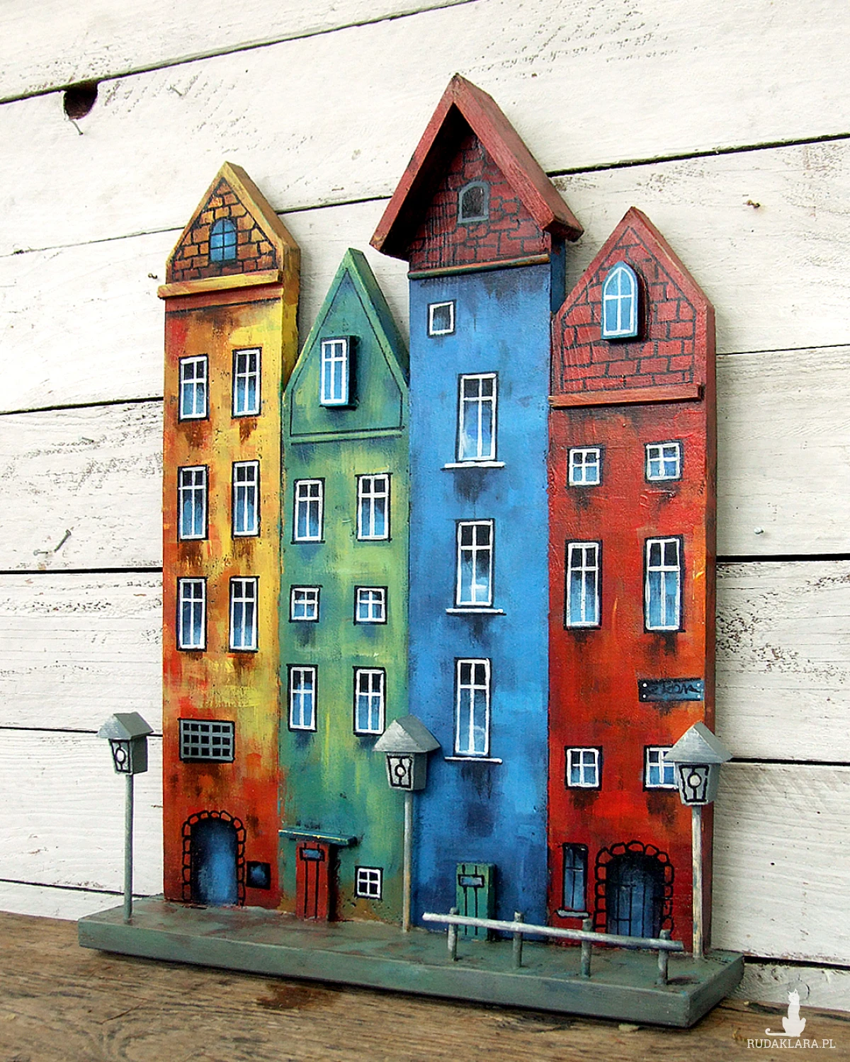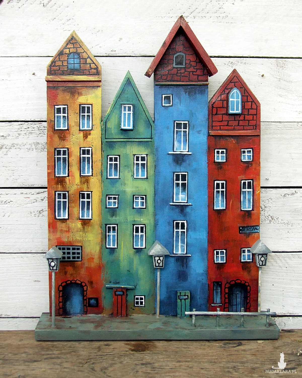 Klimatyczna dekoracja na ścianę lub do postawienia - kolorowe kamieniczki, ręcznie malowane.