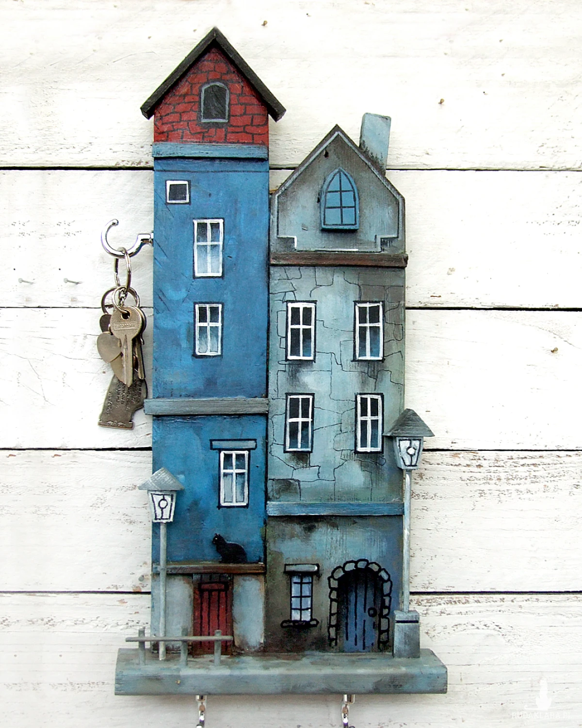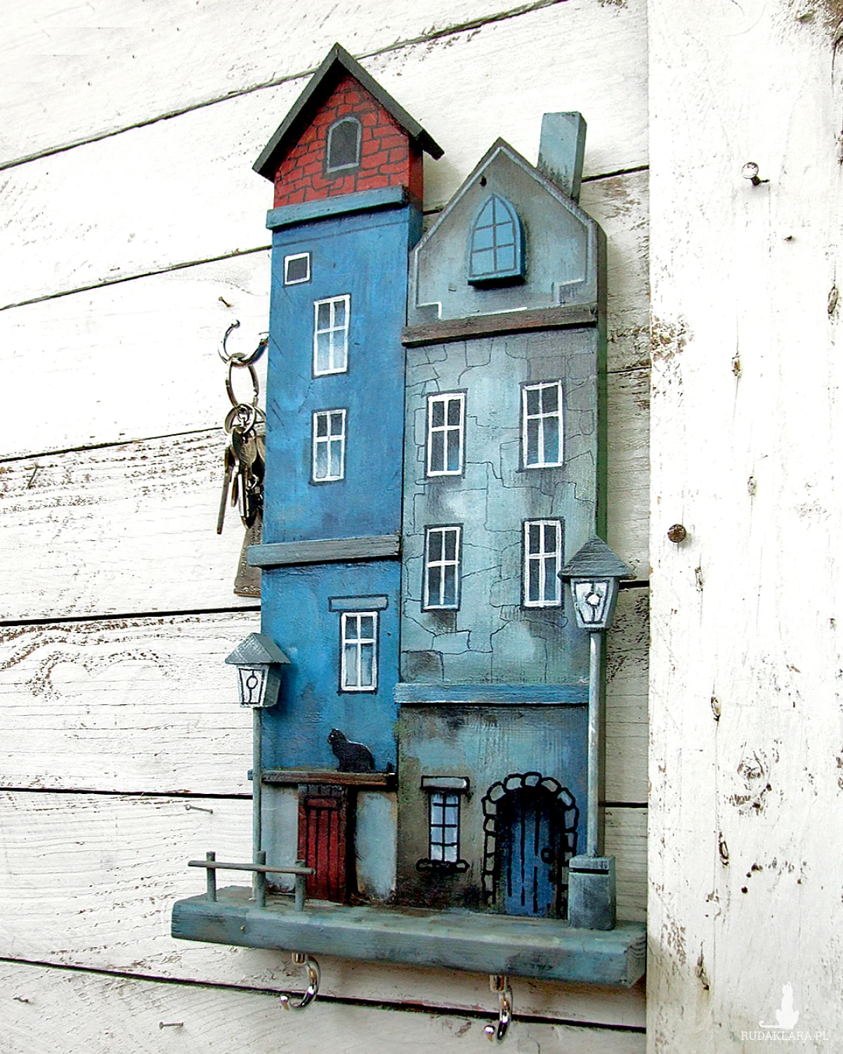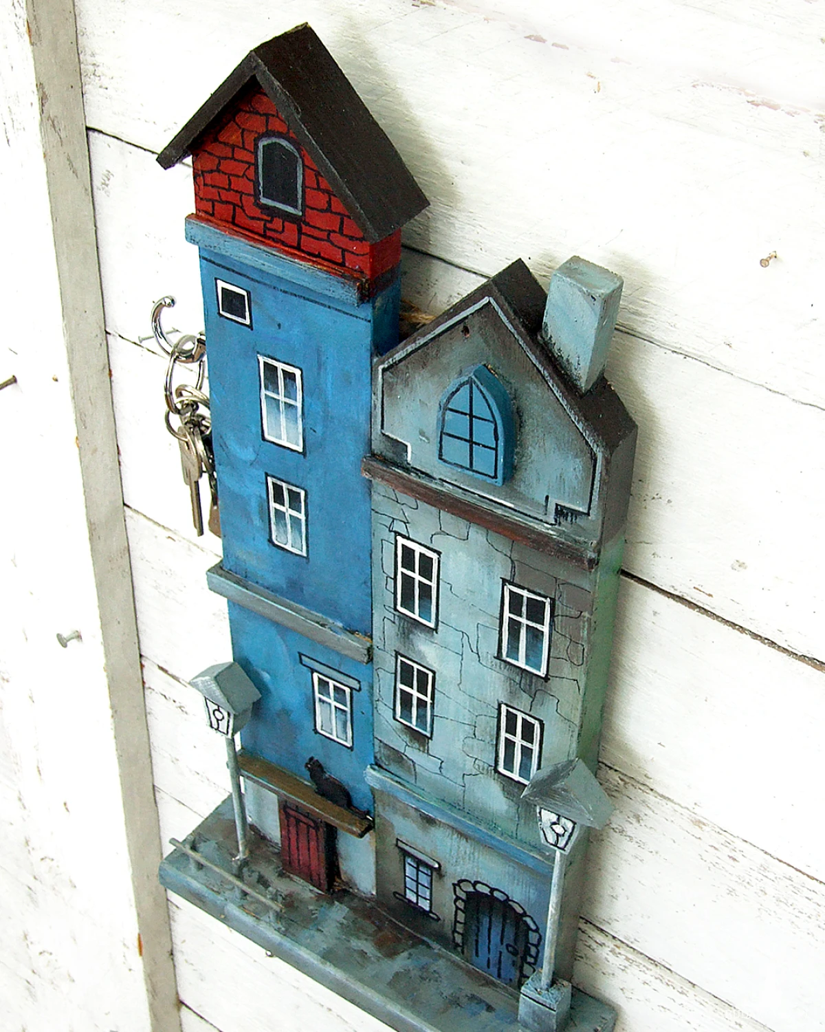 Domki mają proste kształty, całość konstrukcji nie jest więc skomplikowana, a cały efekt to bardzo dokładne i szczegółowe malowanie kamieniczek: ogromna ilość okienek, drzwi ze szczegółami, dobranie i cieniowanie koloru - to tworzy wyjątkowy klimat tej dekoracji. Całość jest zabezpieczona matowym lakierem akrylowym.
