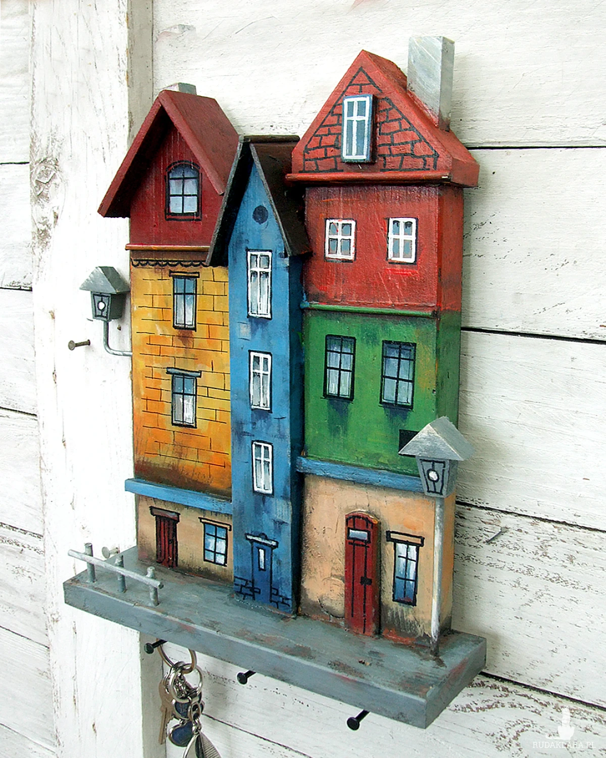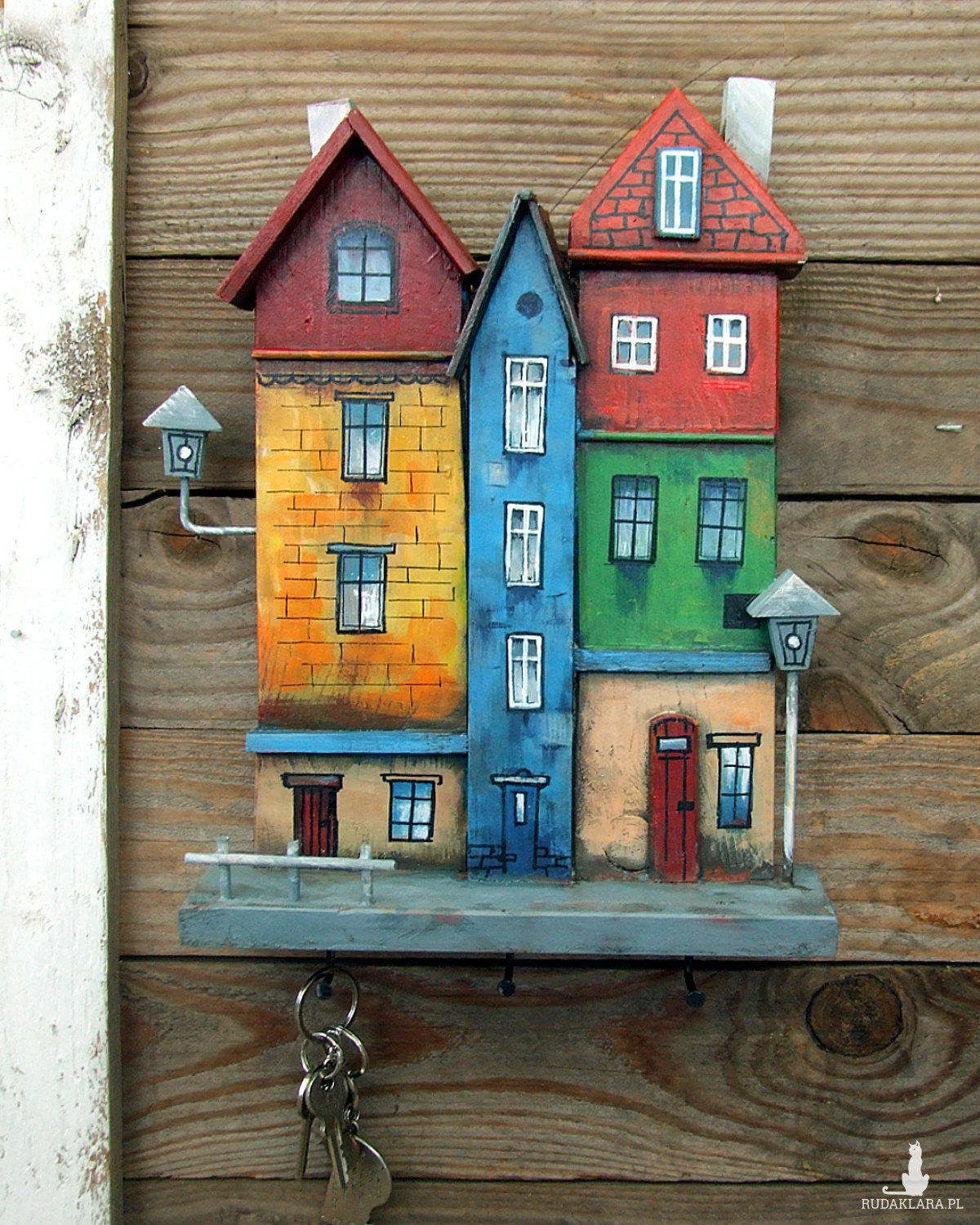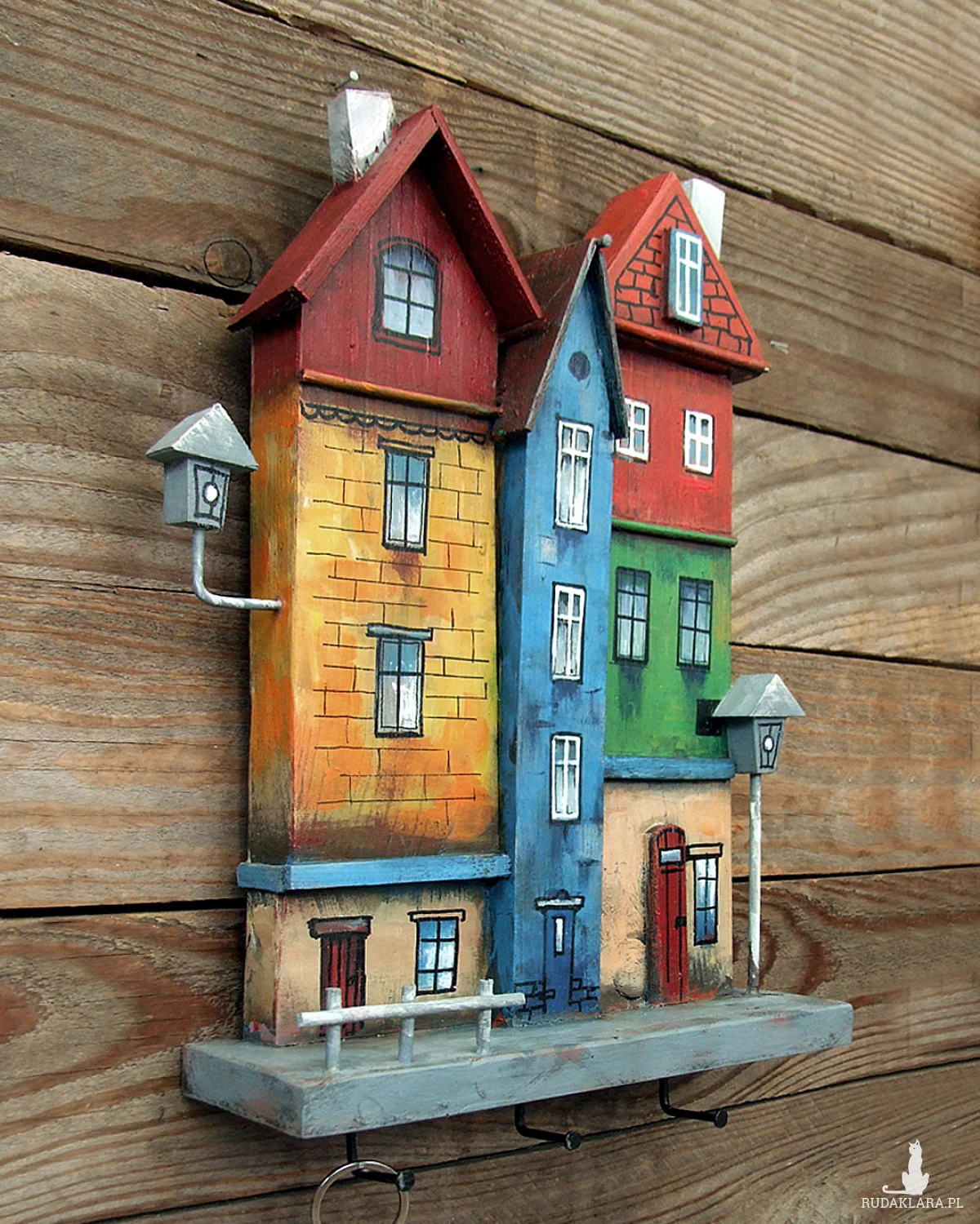 Domki mają proste kształty, całość konstrukcji nie jest więc skomplikowana, a cały efekt to bardzo dokładne i szczegółowe malowanie kamieniczek: ogromna ilość okienek, drzwi ze szczegółami, dobranie i cieniowanie koloru - to tworzy wyjątkowy klimat tej dekoracji. Całość jest zabezpieczona matowym lakierem akrylowym.
