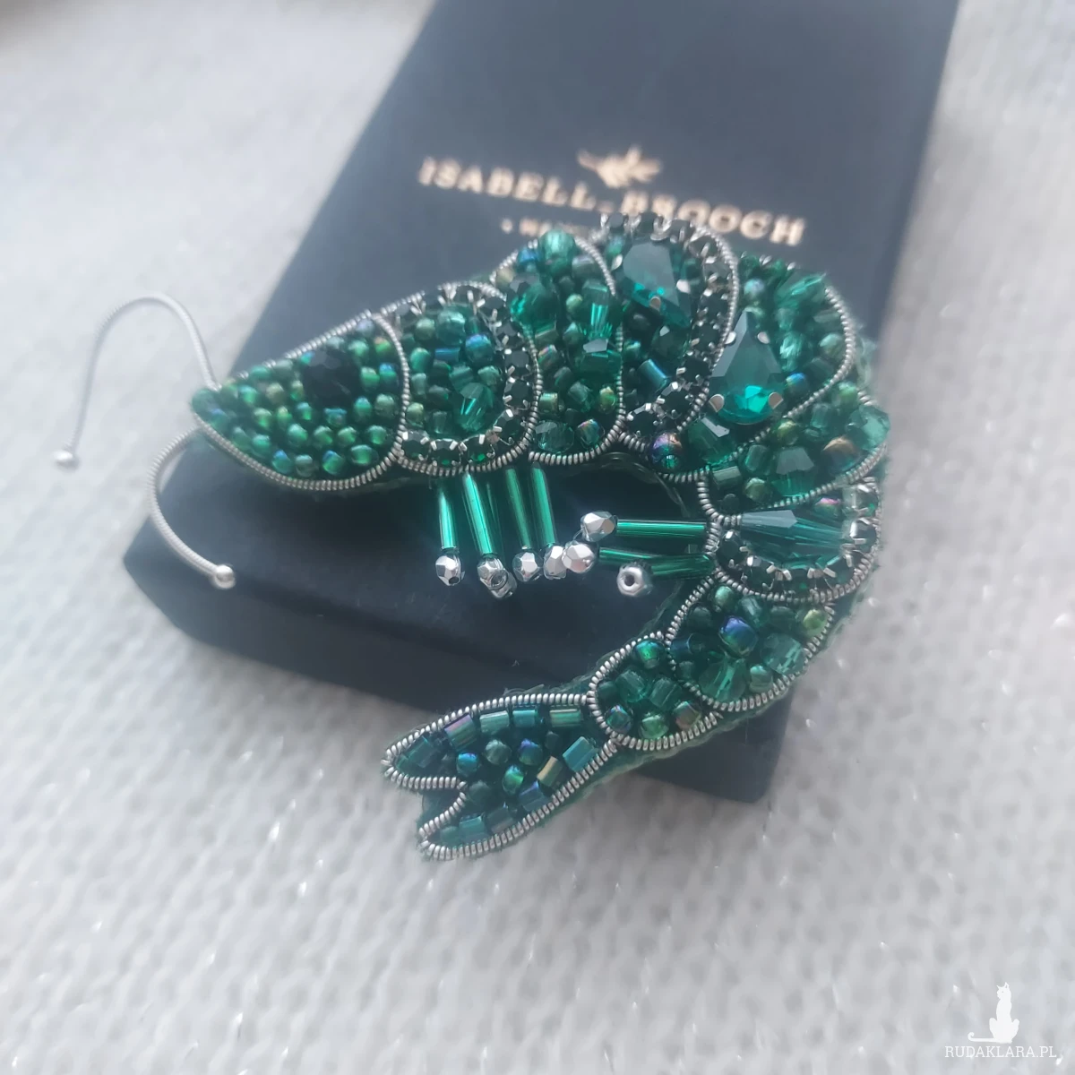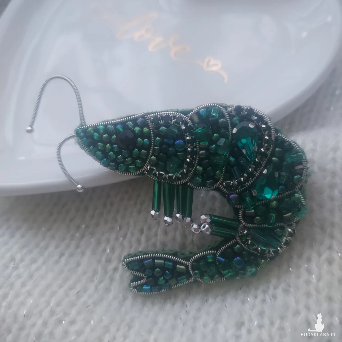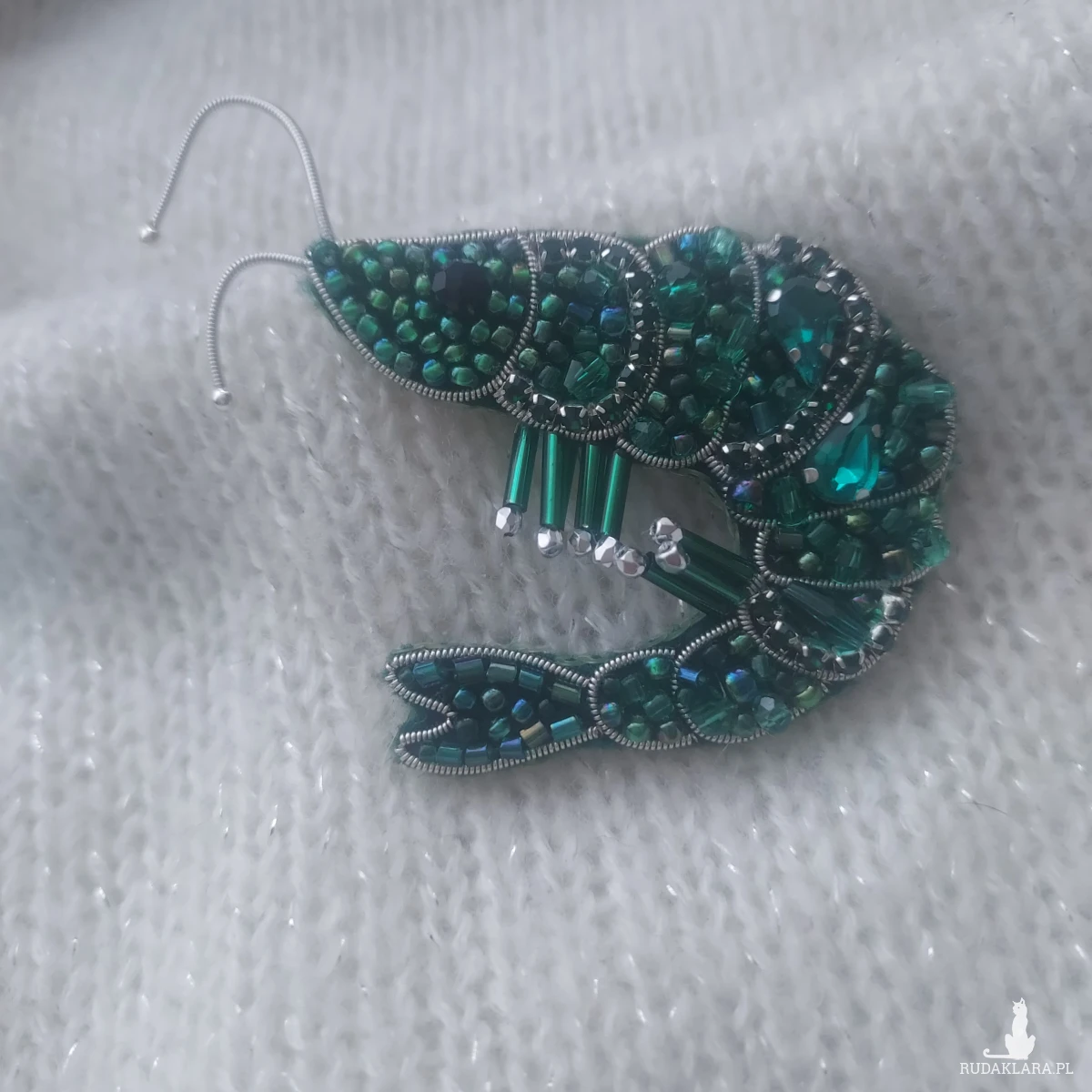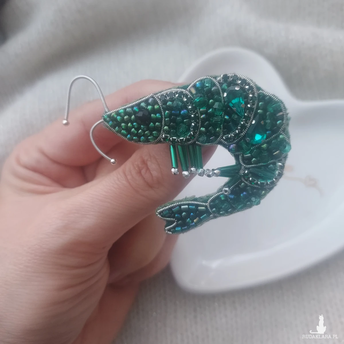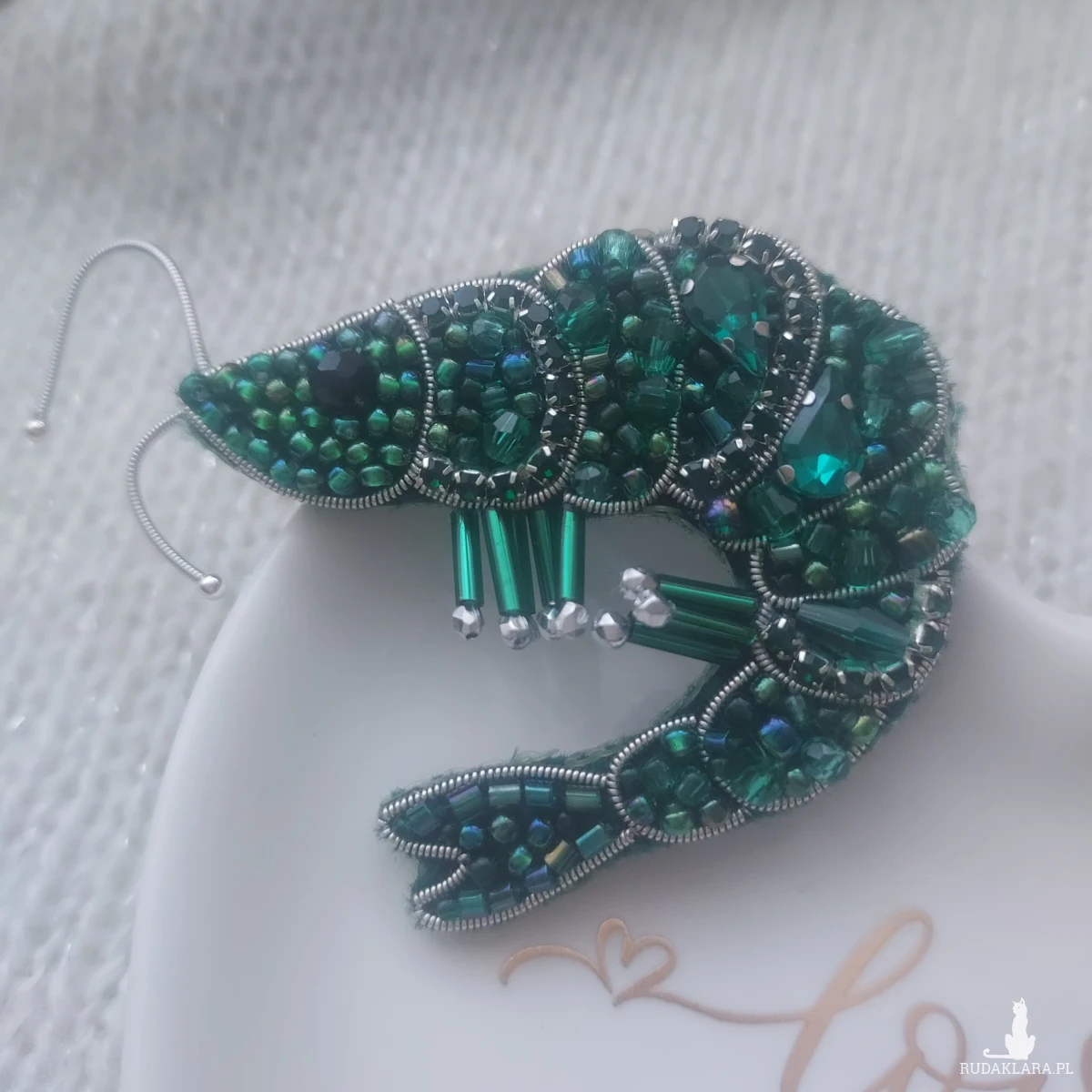 Poznaj świat morskich głębin z wyjątkową broszką KREWETKĄ kolorze szmaragdowym, która powstała w pracowni techniką haftu koralikowego.