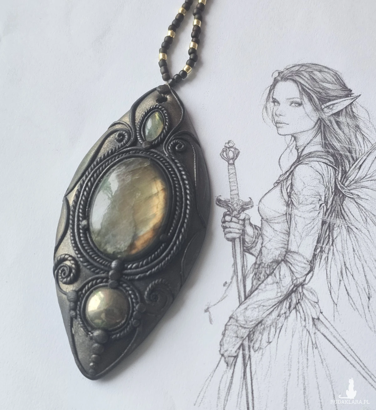 Wisior/naszyjnik/amulet/talizman wykonany misternie z gliny polimerowej. Ozdobiony filigranami, wzorami nawiązującymi do roślinnych pnączy, elfów czy do wzorów orientalnych.