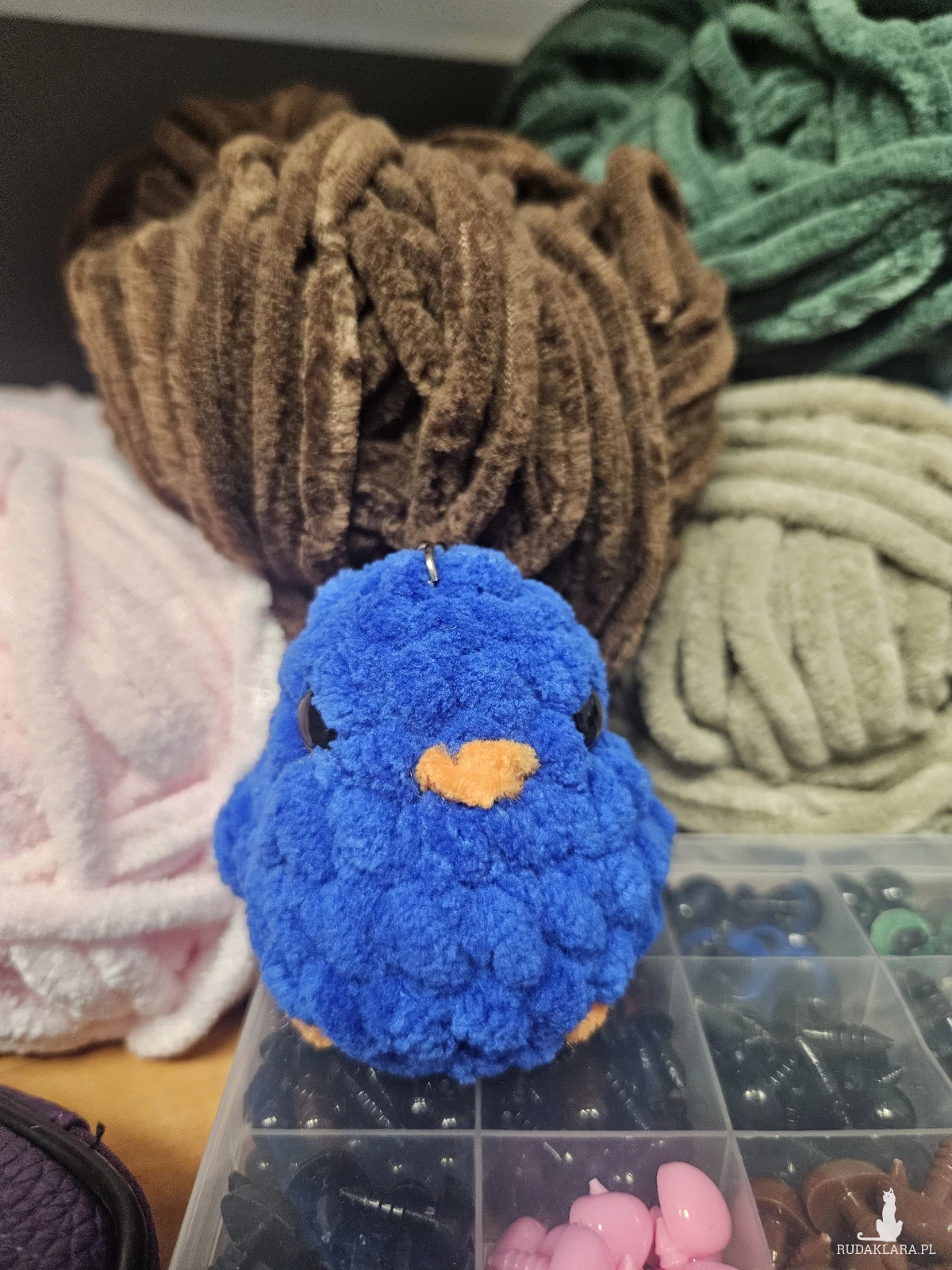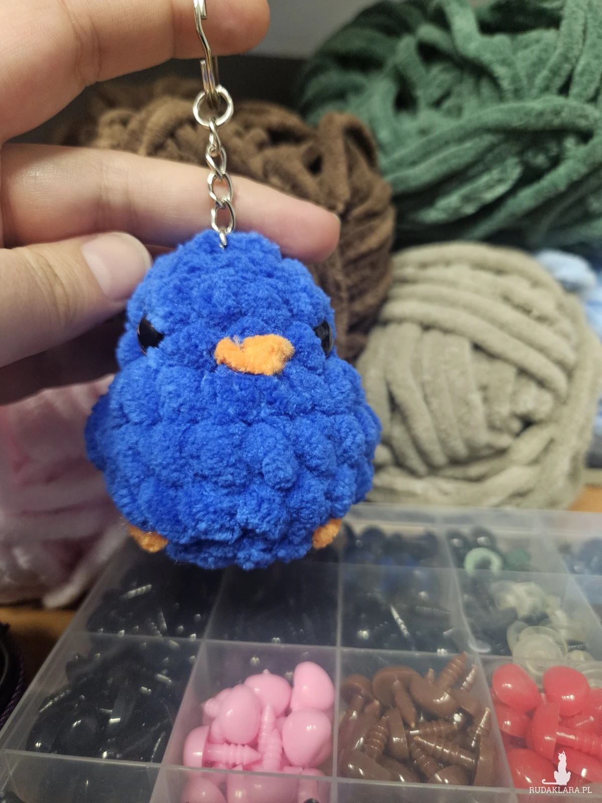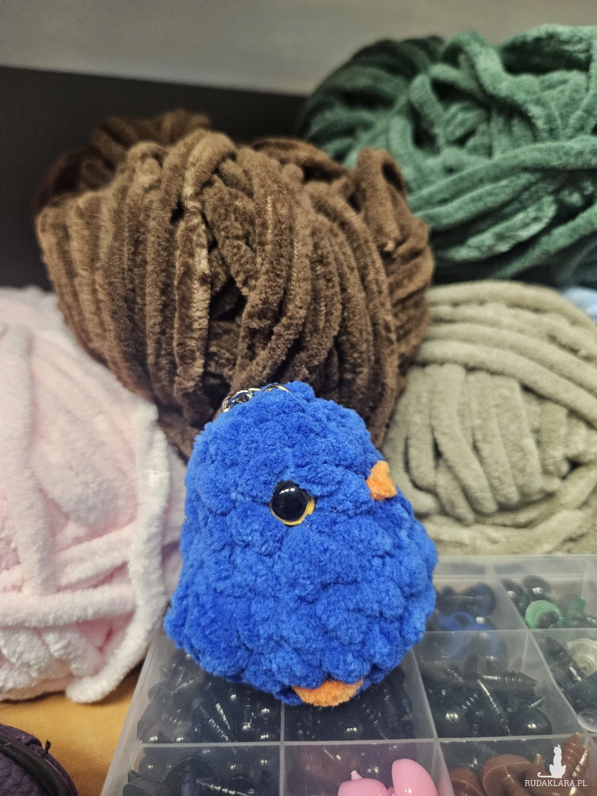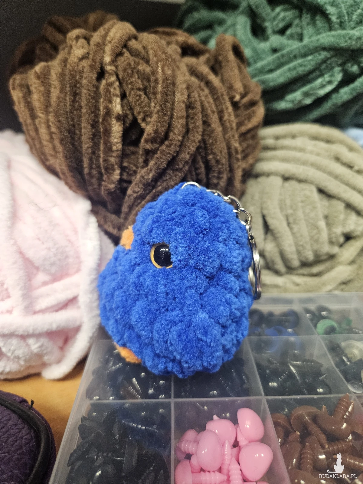 Ręcznie robione pluszaki z włóczki 100% mikropoliester i wypełniacz 100% biały silikon. Do tego guziczki na noski i oczka. Małe, nie dawać dzieciom gryść.