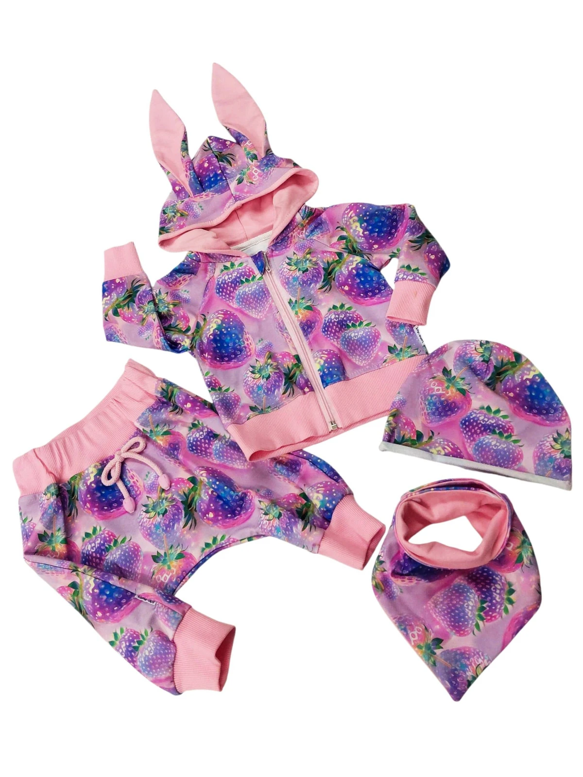 Komplet dziewczęcy, 4-częściowy, uszyty z dresówki pętelki wzór cyfrowy, połączenie z różem.