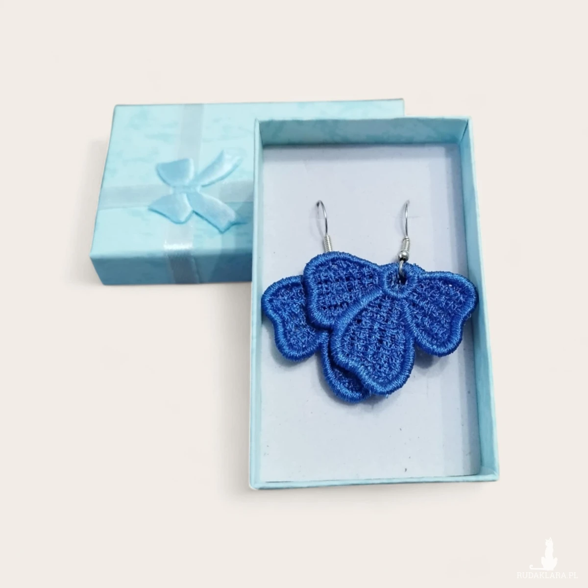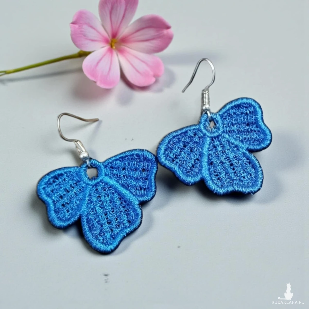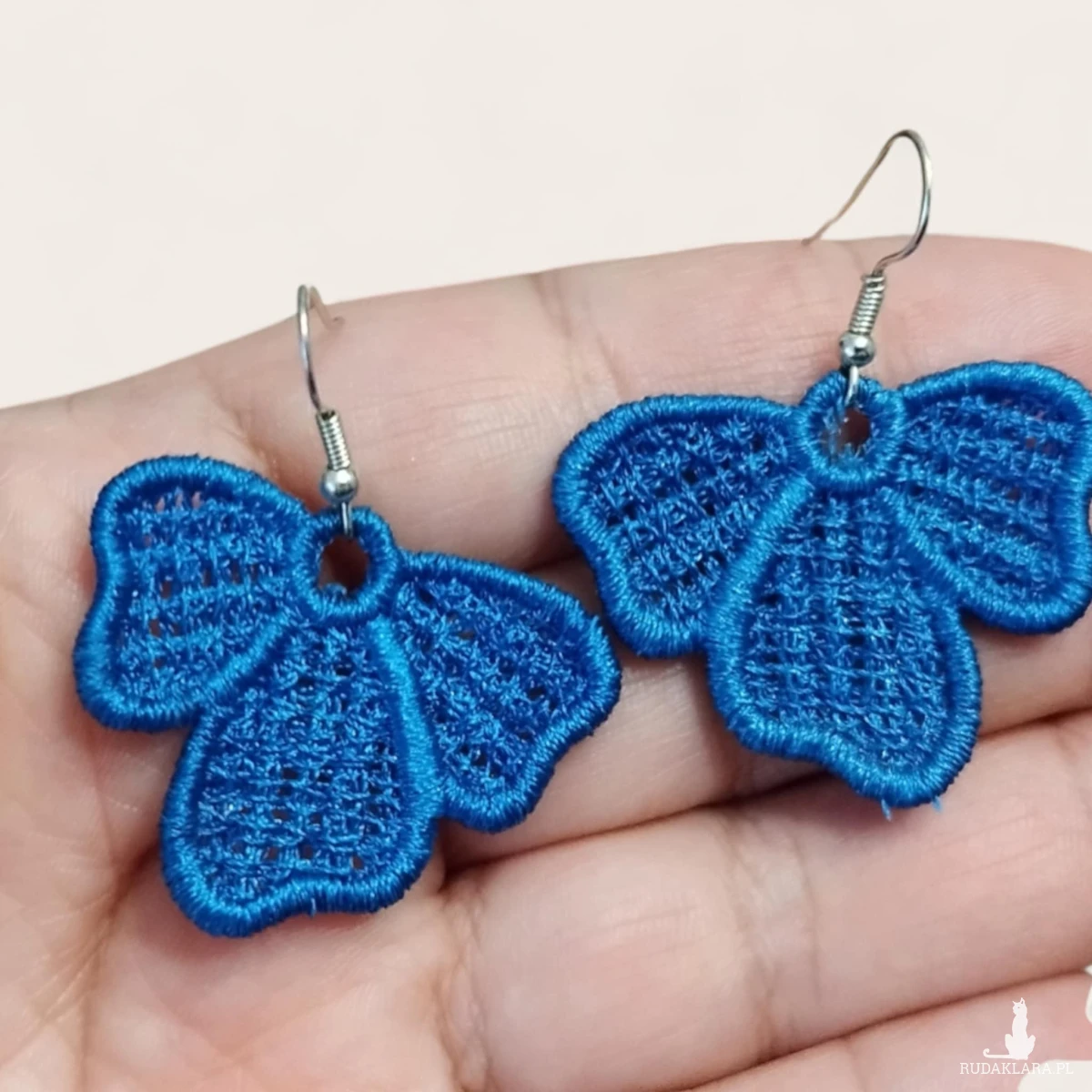 Kolczyki są haftowane (haft maszynowy). Kolczyki są sztywne w chwycie, ich kształt oraz wygląd nie zmieniają się. Haftowane kolczyki też są lekkie - to ich kolejny atut.