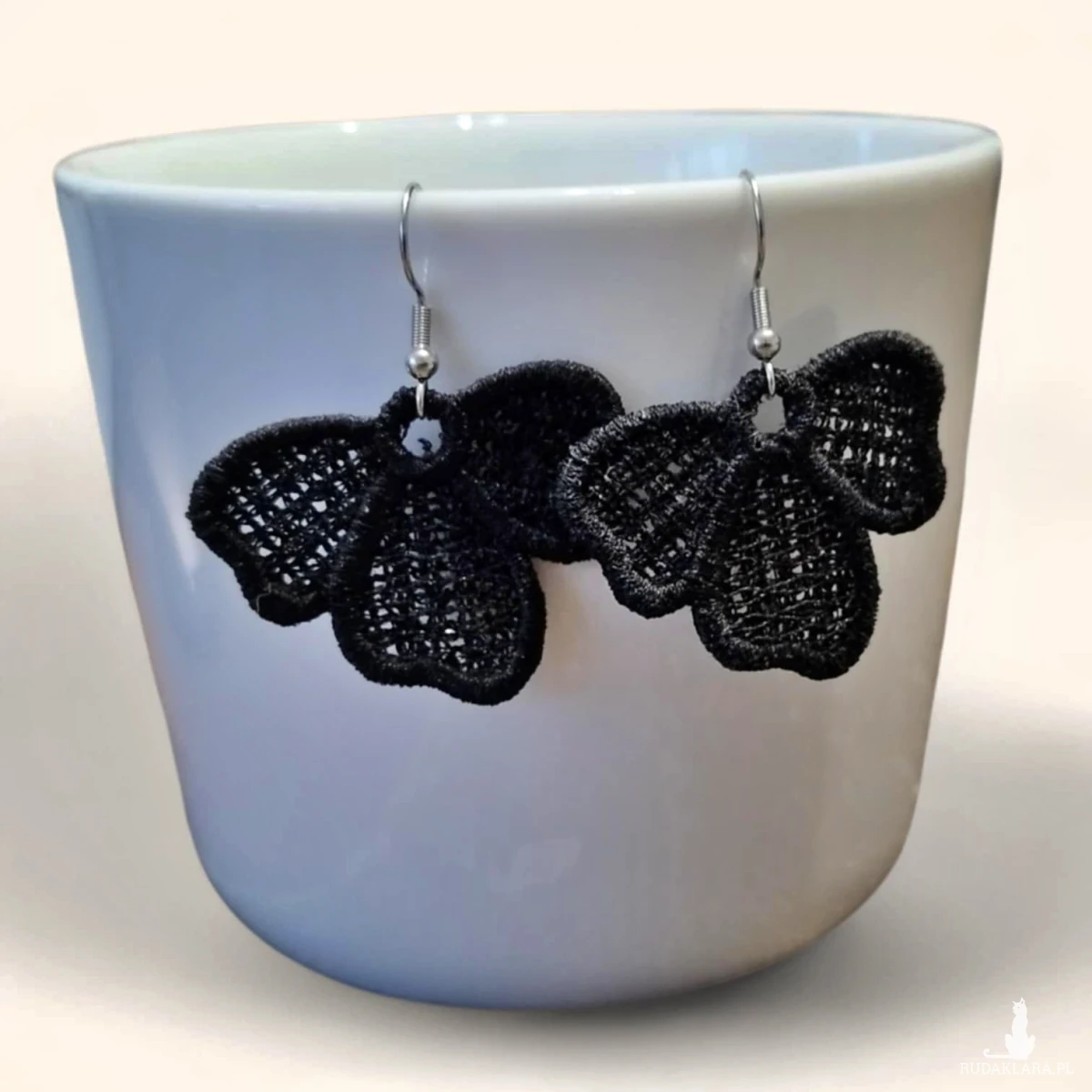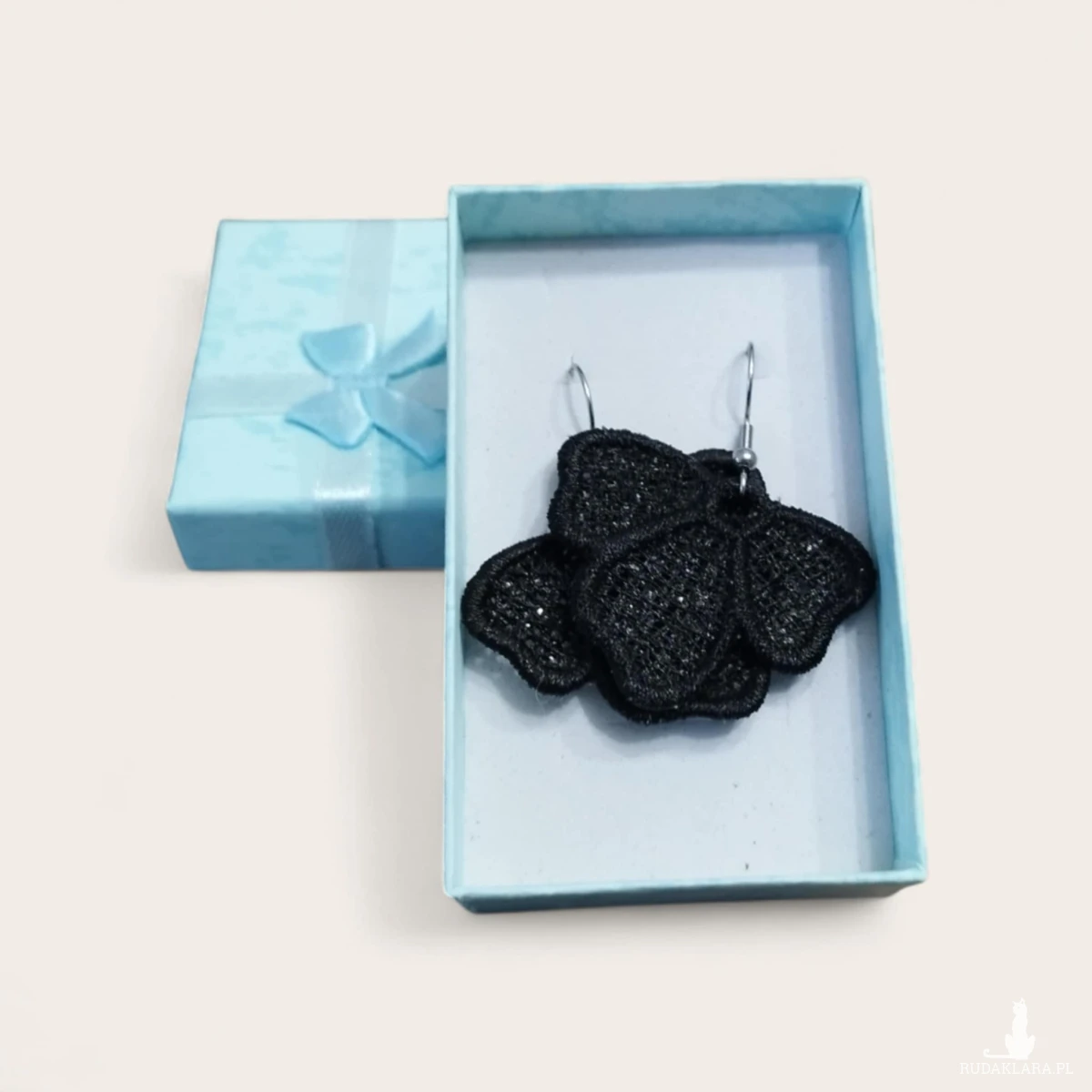 Kolczyki są haftowane (haft maszynowy). Kolczyki są sztywne w chwycie, ich kształt oraz wygląd nie zmieniają się. Haftowane kolczyki też są lekkie - to ich kolejny atut.