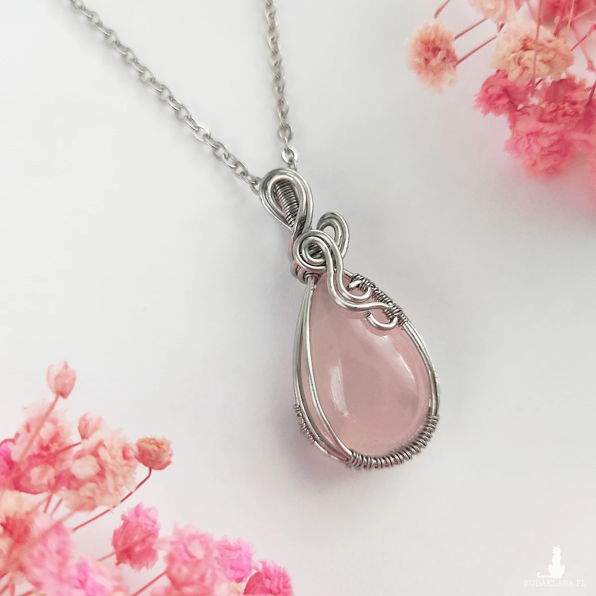 Naszyjnik Kwarc Różowy ręcznie robiony. Wykonany techniką wire wrapping z drutów ze stali chirurgicznej.