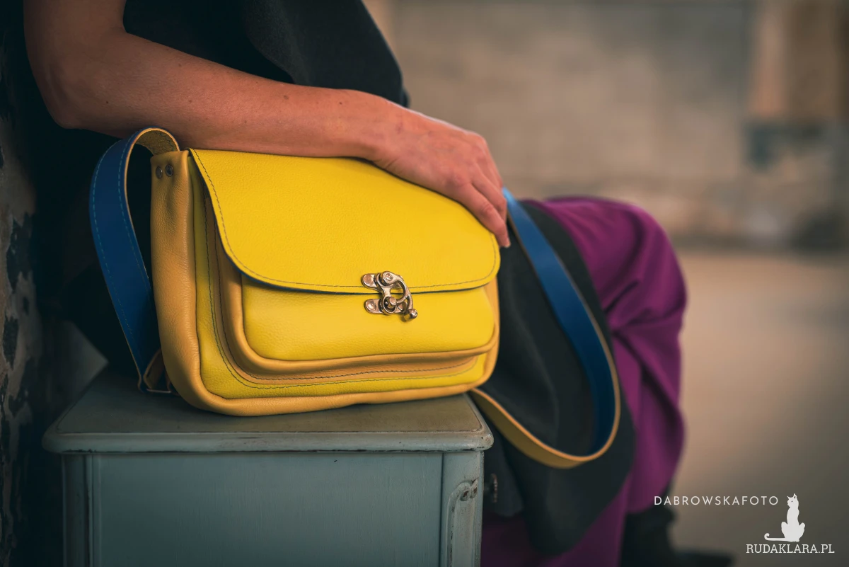 Niewielka, elegancka torebka o kroju klasycznej teczki. Uszyta ze świetnej jakości, mięsistej skóry naturalnej w kolorze żółtym (cytrynowym). Posiada dużą główną komorę, w której znajdują się kieszeń na zamek i dwie kieszenie otwarte. Z tyłu kieszeń na telefon. Wysokość – 20cm, szerokość – ok.28cm, głębokość głównej komory – ok 6cm, długość paska – max.130cm.