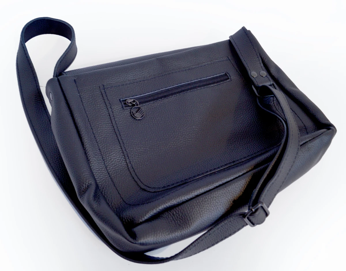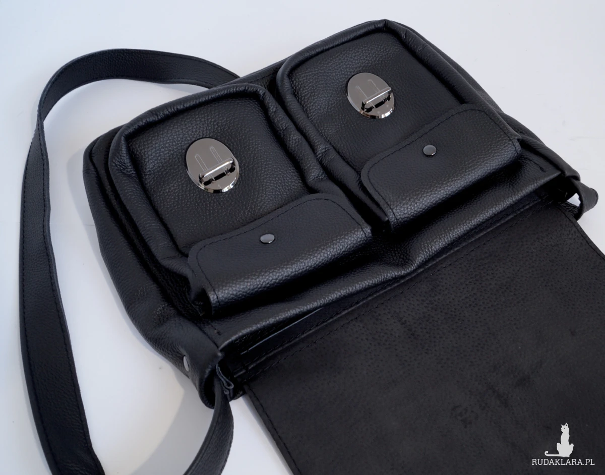 Teczka uszyta ze świetnej jakości skóry naturalnej, bydlęcej, czarnej z lekkim połyskiem. Ponadczasowy krój. Z przodu dwie duże kieszenie zamykane klapkami na magnes. Wewnątrz i z tyłu duże kieszenie na zamek. Wewnątrz kieszeń otwarta. Wysokość – 23, szerokość – 30, głębokość – 8-9, dł. paska – max. 135cm.