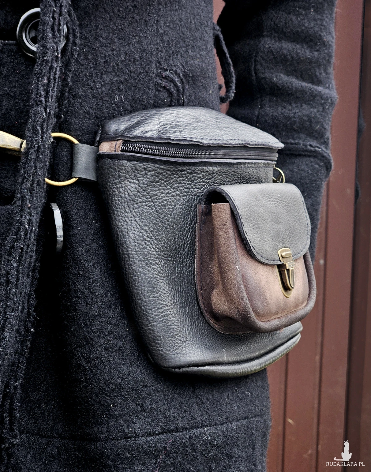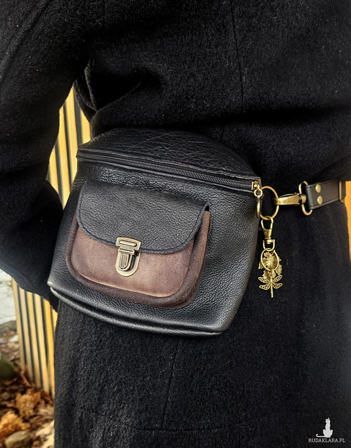 Fajna, miękka torebeczka na pas uszyta z czarnych i brązowych skór naturalnych o różnych odcieniach i fakturach. Brązowy zamsz, z którego uszyta jest przednia kieszeń jest postarzany na krawędziach. Niewielka ale pojemna, pomieści telefon, portfel, chusteczki i najpotrzebniejsze kosmetyki. Z tyłu kieszeń na zamek, wewnątrz przegródka. Sprzedawana w komplecie z regulowanym paskiem zapinanym na karabińczyki. Można ją nosić również na ramieniu. Wymiary: 21/17cm.