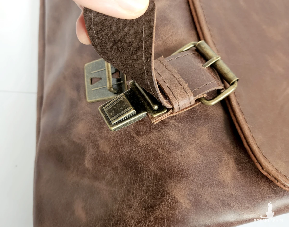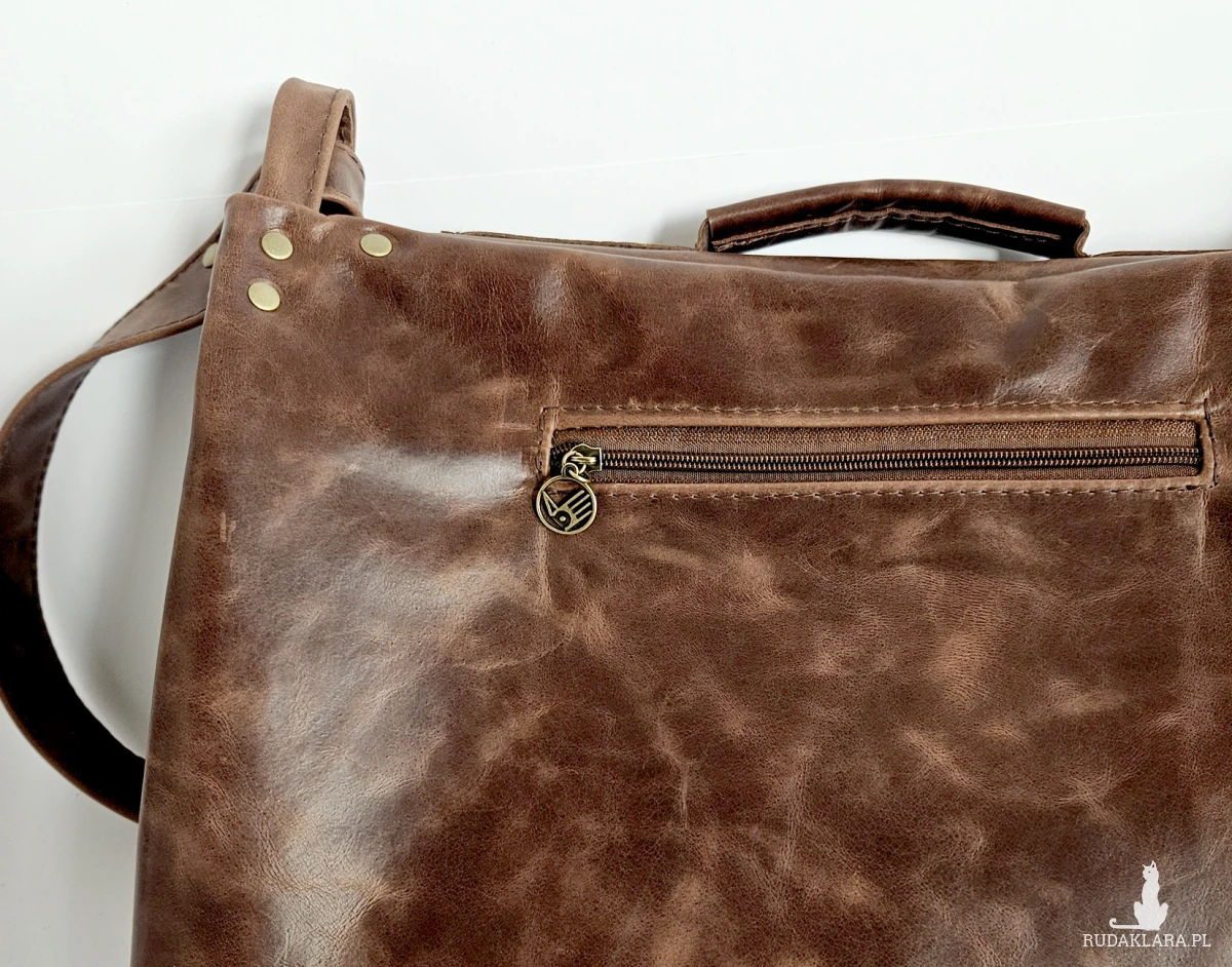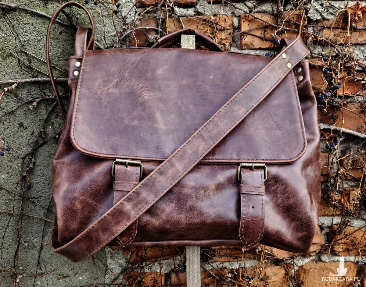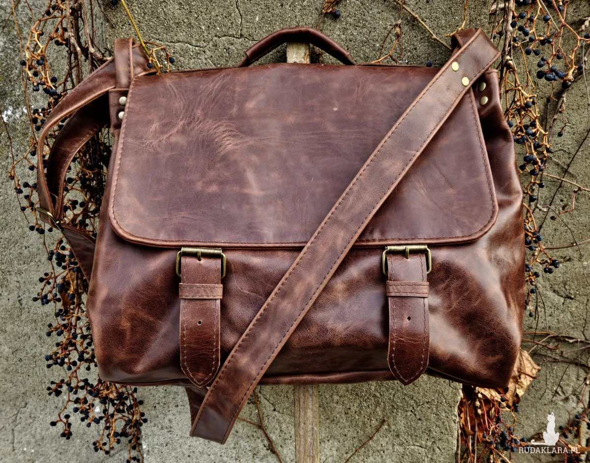 Duża, funkcjonalna i wygodna torba, uszyta ze świetnej jakości, pięknej skóry bydlęcej, licowej, olejowanej. Bardzo pojemna, mieści swobodnie format A4 i dużo więcej. Piękny, kasztanowo-brązowy, nieregularny kolor. Minimalistyczny, autorski krój. Zapinana na zatrzaski ukryte pod klamrami. Wewnątrz podszewka, duża kieszeń na laptopa (format A4, lub laptop 14”) kieszeń na zamek i cztery małe kieszenie otwarte. Z tyłu duża, zasuwana kieszeń. Wysokość – 34, szerokość – 42, szerokość – 14cm, regulowany pasek długi na max. 140 cm.