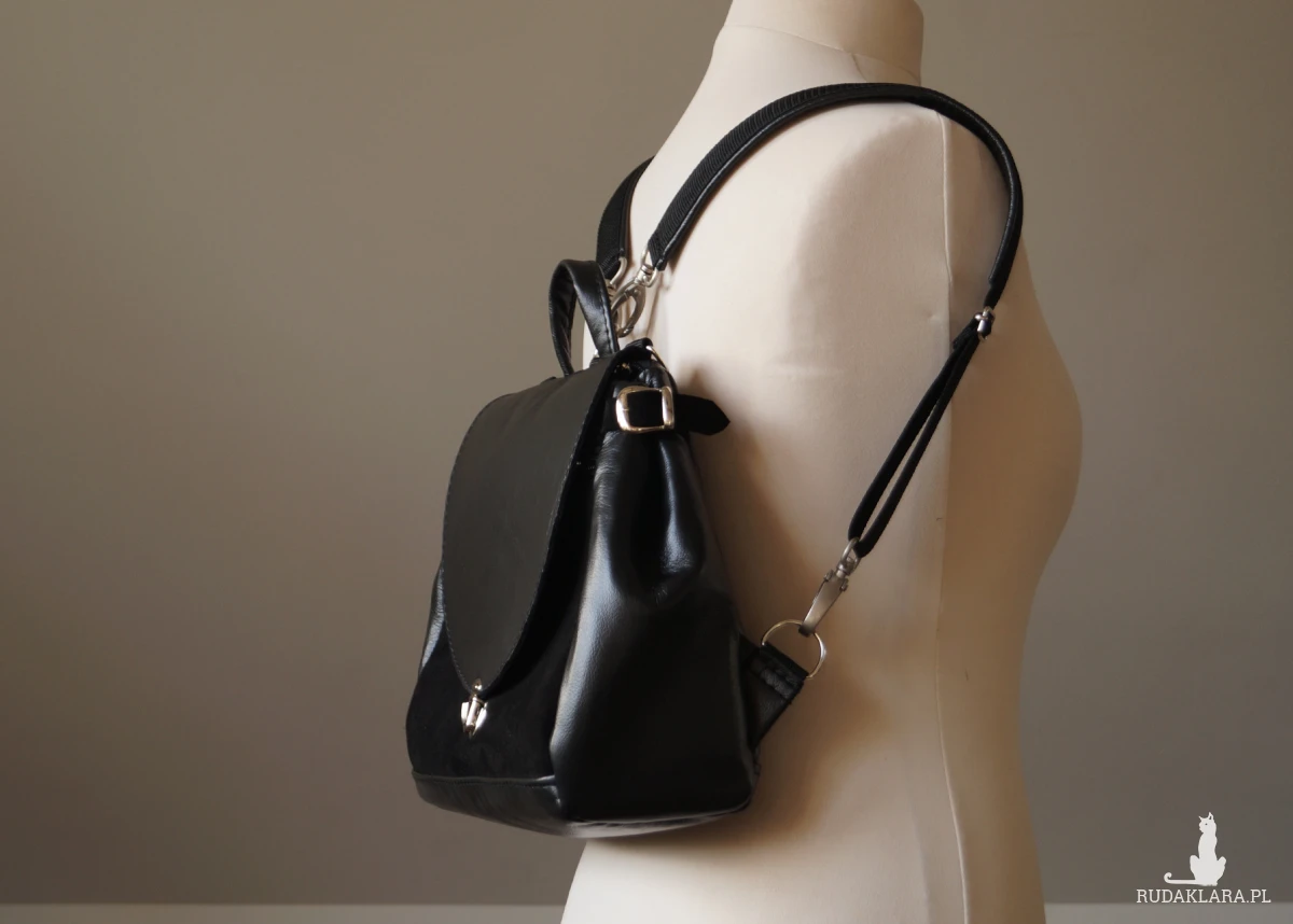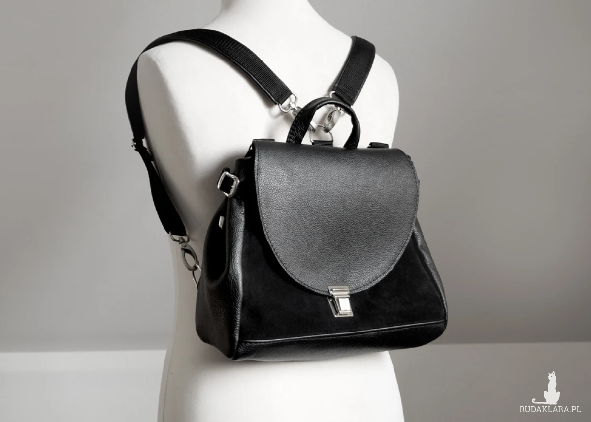 Teczka-kuferek z funkcją plecaka. Uszyta ze świetnej jakości skóry naturalnej, bydlęcej w kolorze czarnym (skóra licowa i zamsz).