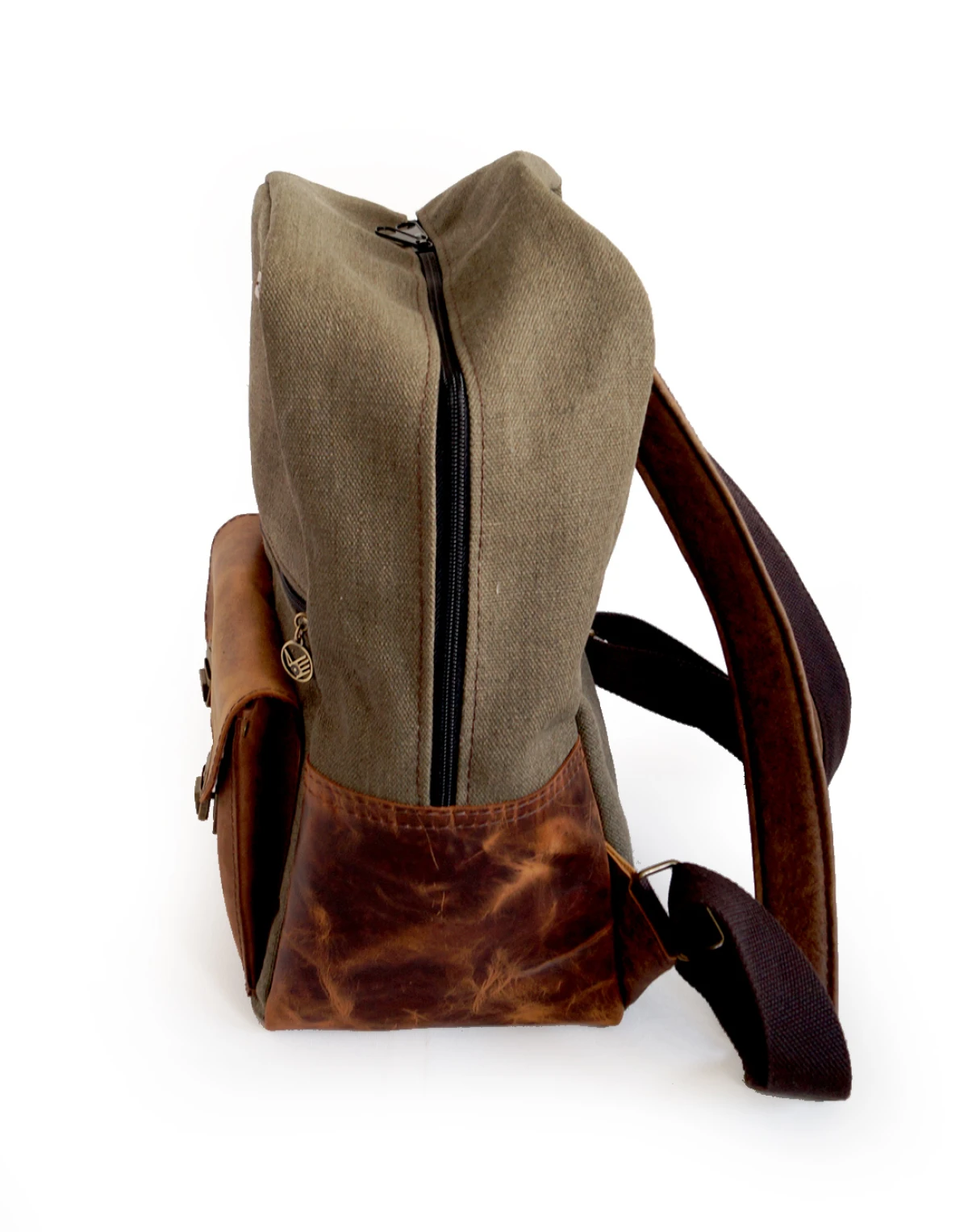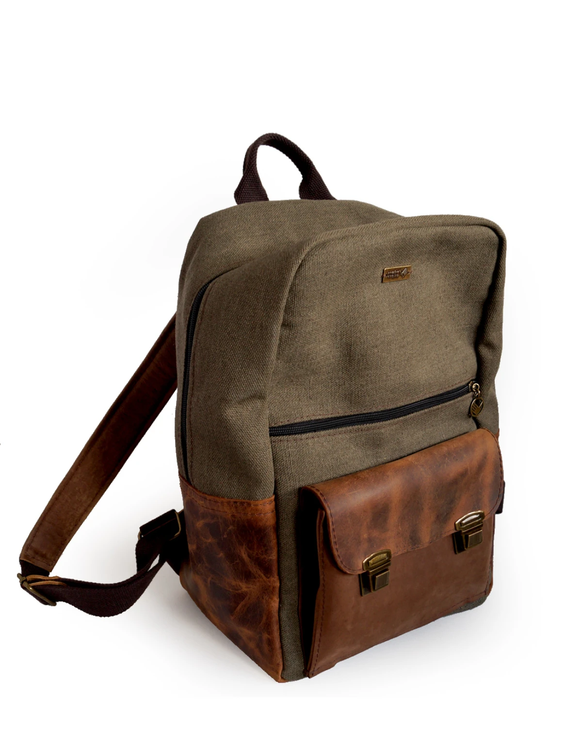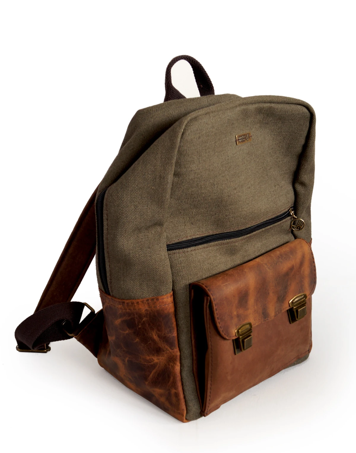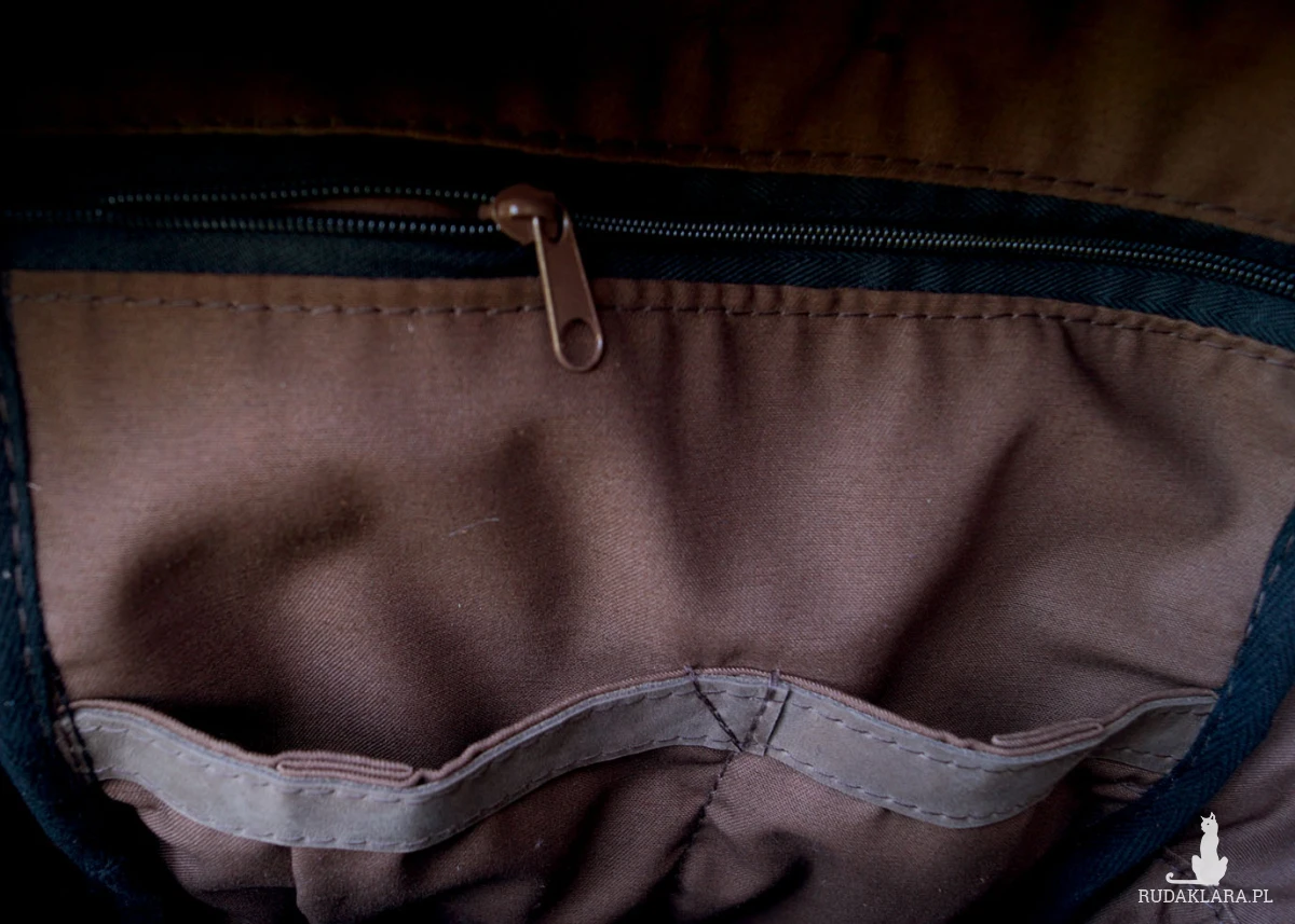 Uszyty z brezentu – wojskowej tkaniny wodoodpornej, oraz skóry naturalnej, woskowanej. Na zewnątrz dwie pojemne kieszenie, a wewnątrz brązowa podszewka, przegroda na laptop, spora kieszeń na zamek i dwie kieszenie otwarte.