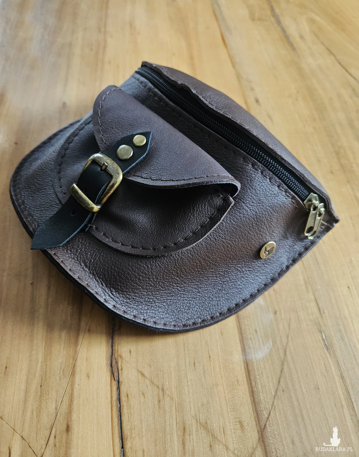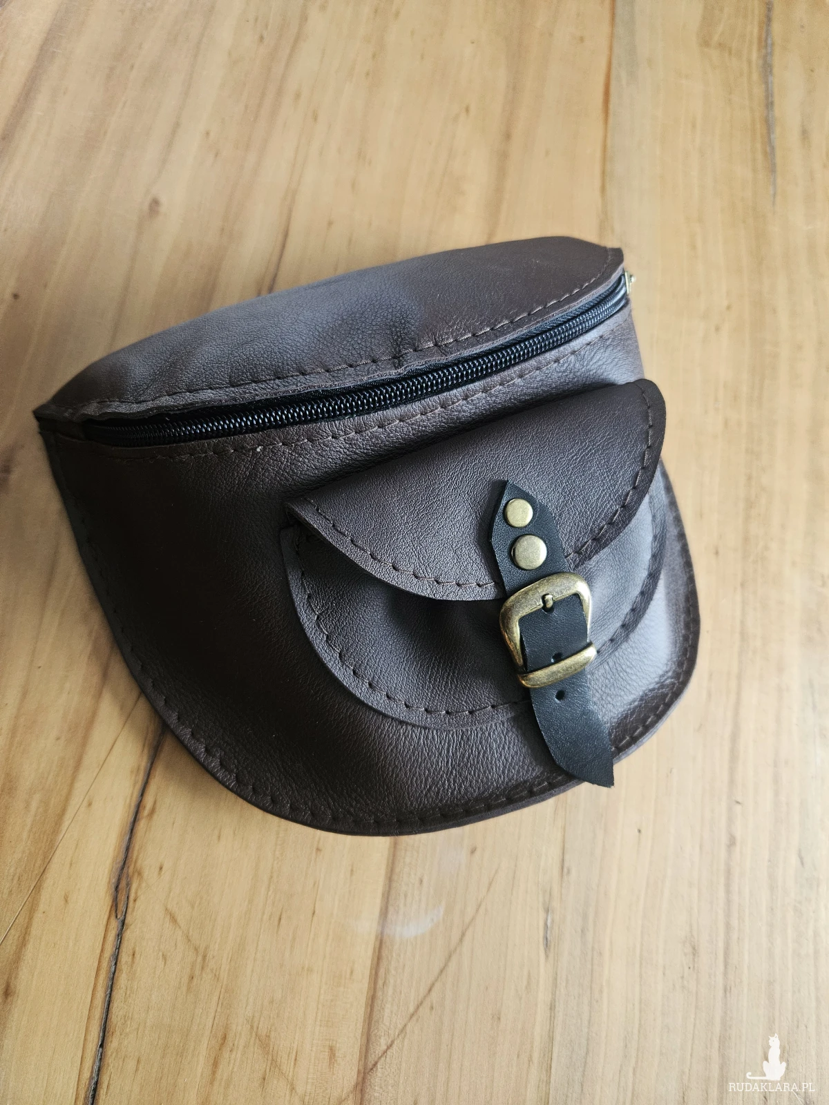 Praktyczna torebka na pas uszyta z brązowej skóry naturalnej, licowej w odcieniu ciemnej czekolady. Niewielka ale pojemna, pomieści telefon, portfel, chusteczki i najpotrzebniejsze kosmetyki. Z tyłu jedna, a z przodu dwie niewielkie kieszenie. Wewnątrz przegródka. Sprzedawana w komplecie z regulowanym paskiem zapinanym na karabińczyki. Można ją nosić również na ramieniu. Wymiary: 21/17cm.