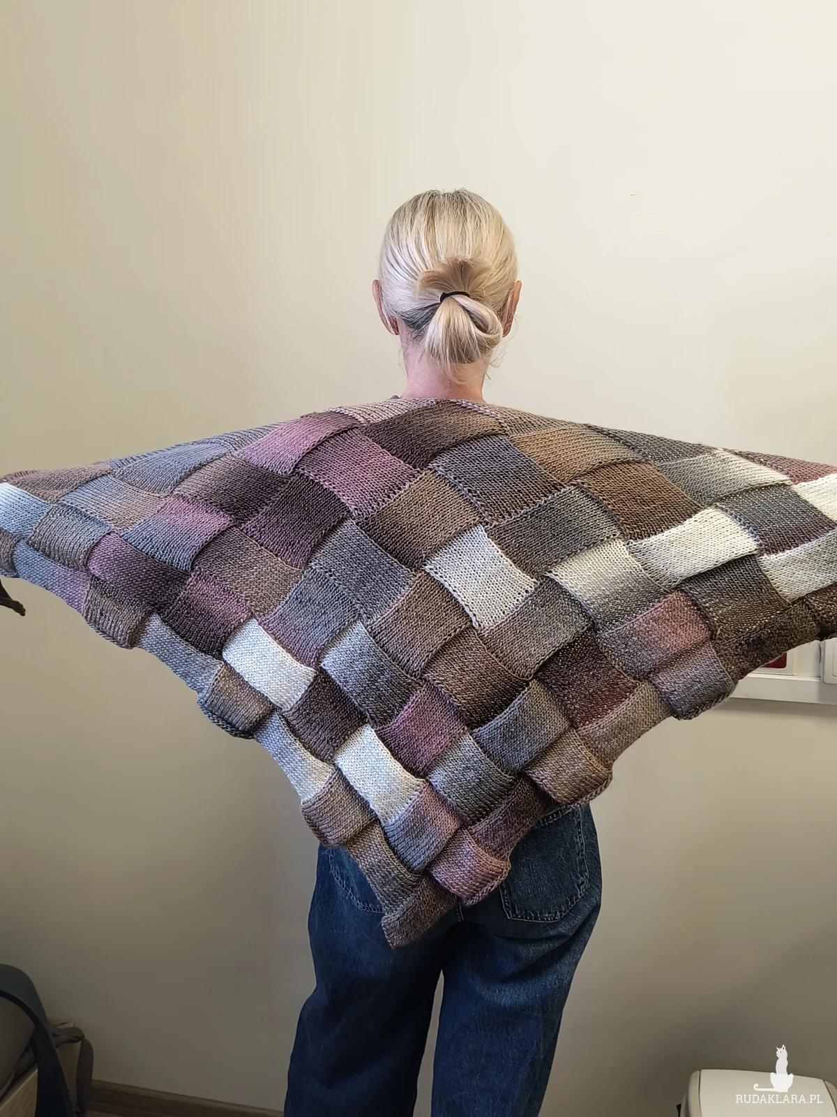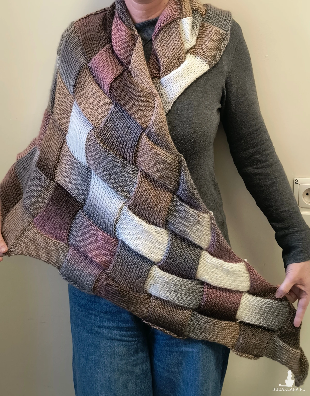 Chusta robiona na drutach. Wełna z akrylem w kolorze ombre biel, szarość, brąz i róż.