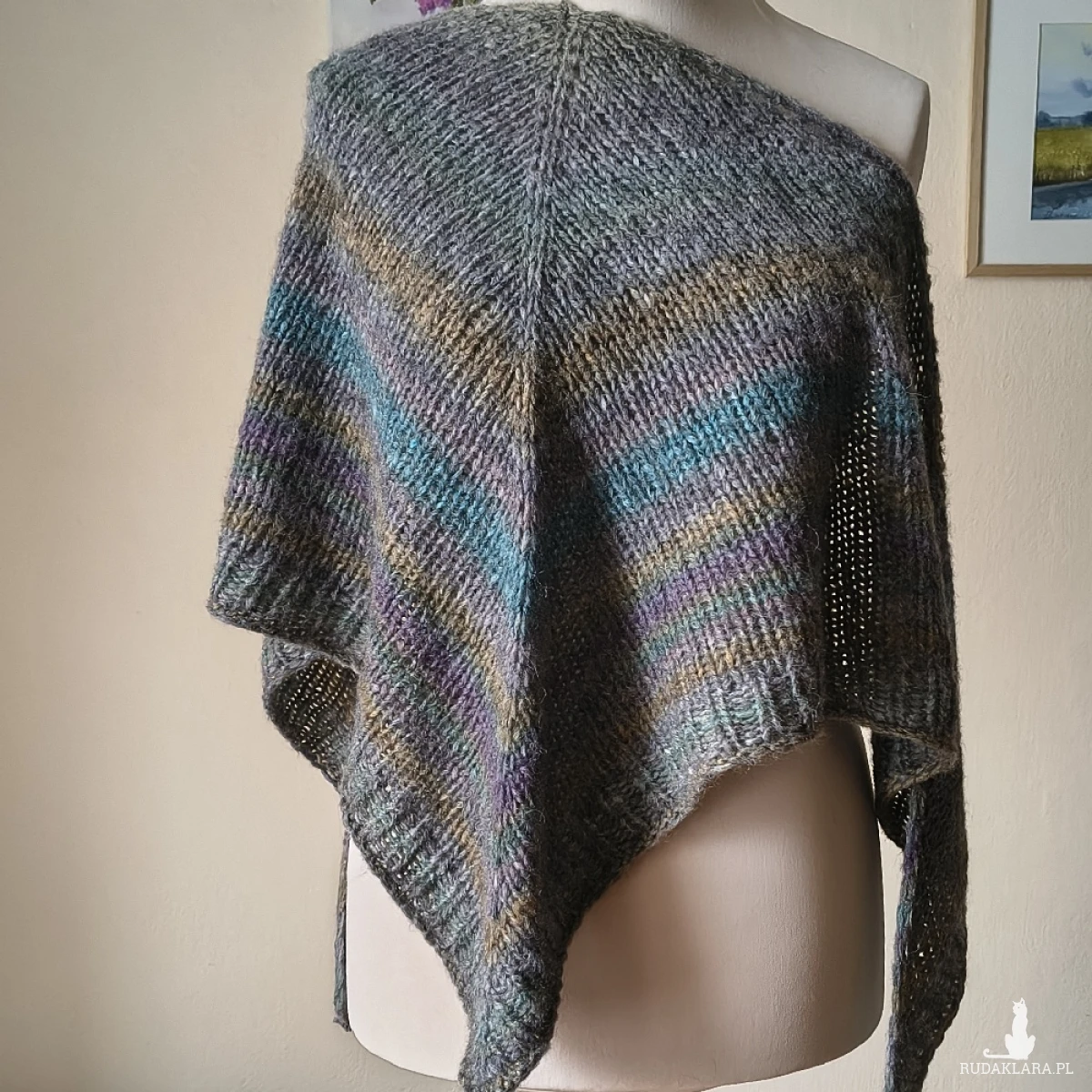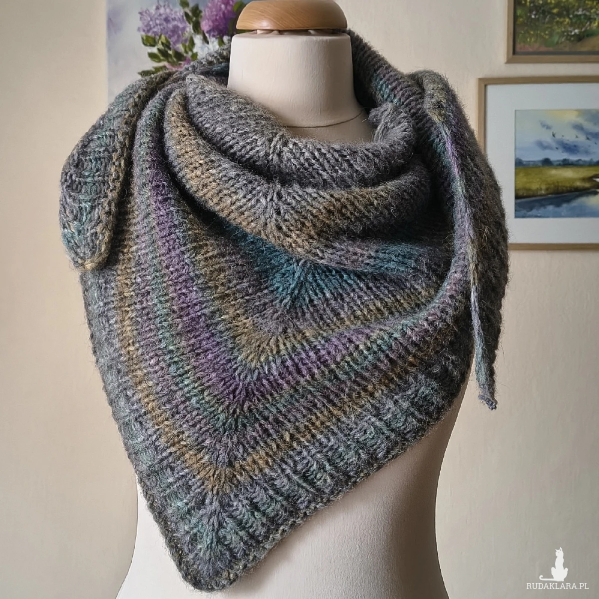 Przytulna, niesamowicie miękka, ciepła, delikatna dla skóry i uroczo puchata chusta, wykonana ręcznie na drutach z doskonałej włoskiej włóczki o składzie: baby alpaka, merino extafine i minimalna ilość włókien sztucznych. Jest to typ chusty, którego nie chce się zdejmować z szyi. Przepiękne odcienie szarości, muśniętej innymi barwami. Kolorystyka twarzowa, świetnie komponująca się z charakterem chusty i typem włóczki. Chusta w okresie zimowym otuli szyję, ramiona i plecy, a w letnim zastąpi narzutkę, czy letnią kurtkę. Wymiary: 174 cm. bok najdłuższy, 62 cm. wysokość trójkąta. Pranie wyłącznie ręczne.