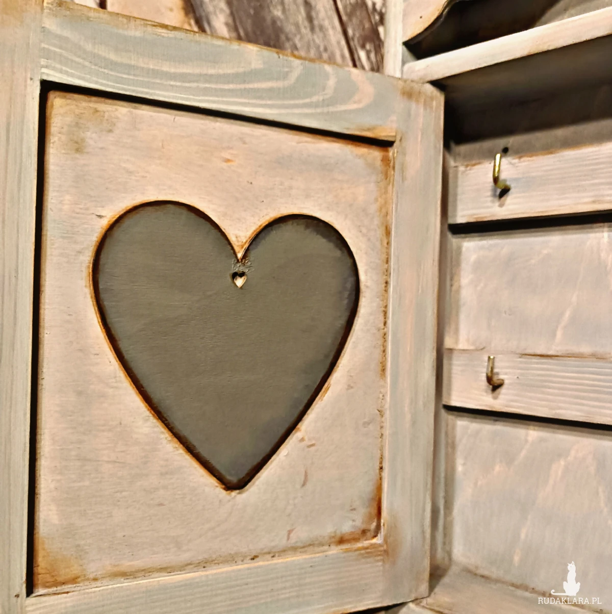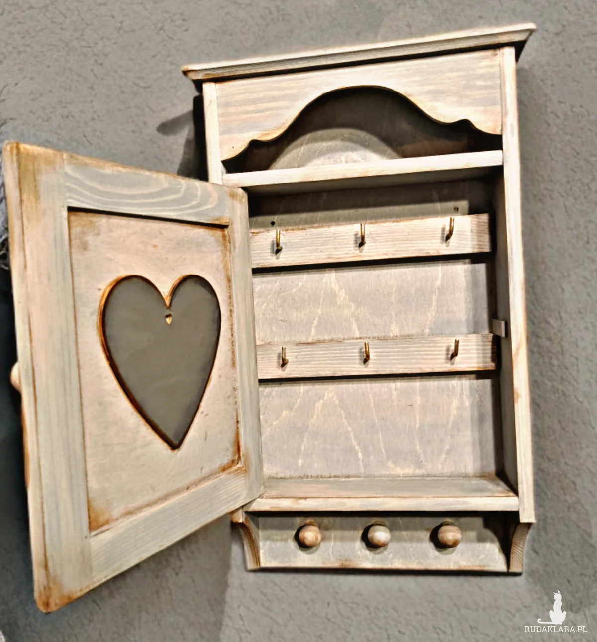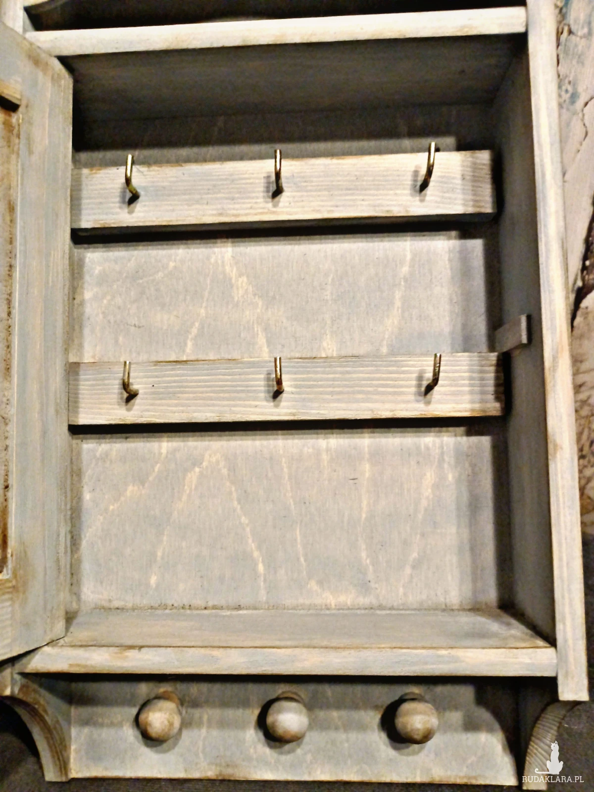 Drewniana skrzyneczka na klucze. Ozdobiona za pomocą techniki decoupage. Sześć haczyków na klucze wewnątrz skrzynki i trzy na zewnątrz.