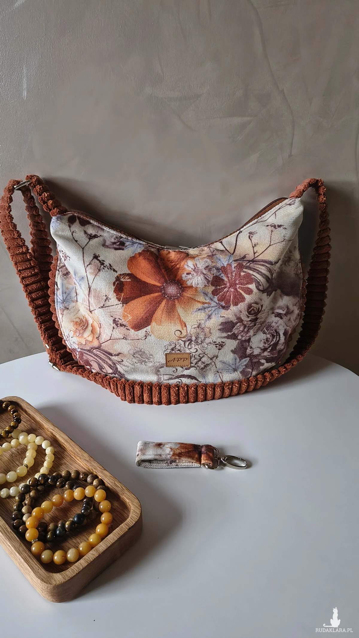Powstała z materiałów tapicerskich, co gwarantuje jej wytrzymałość i długie użytkowanie. Tył i przód torby to welur , a dno i pasek wykonane są ze sztruksu. Wewnątrz znajduje się wodoodporna podszewka z kieszonką na zamek. Pasek regulowany, wykonany ze sztruksu, a więc delikatny dla naszego ciała. Torbę można nosić na ramieniu lub przez ramię. Okucia srebrne, niklowane.