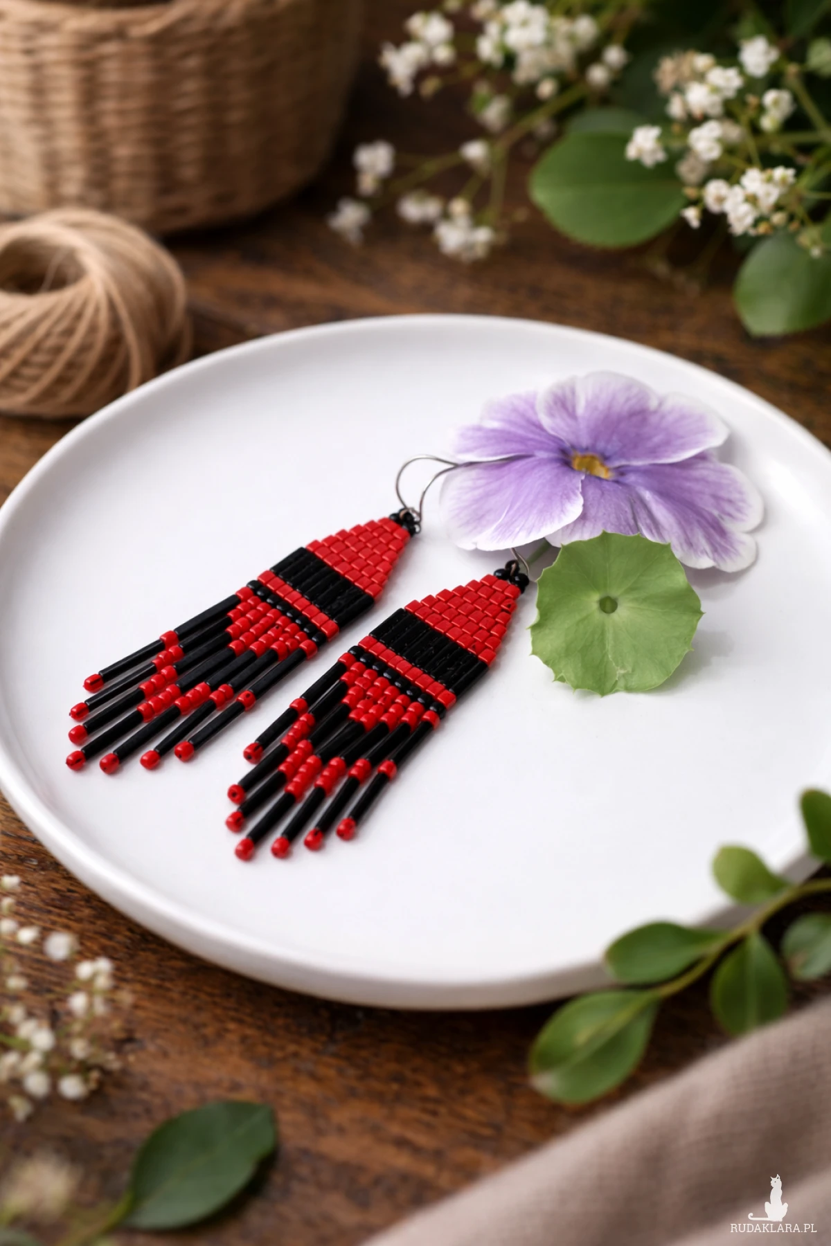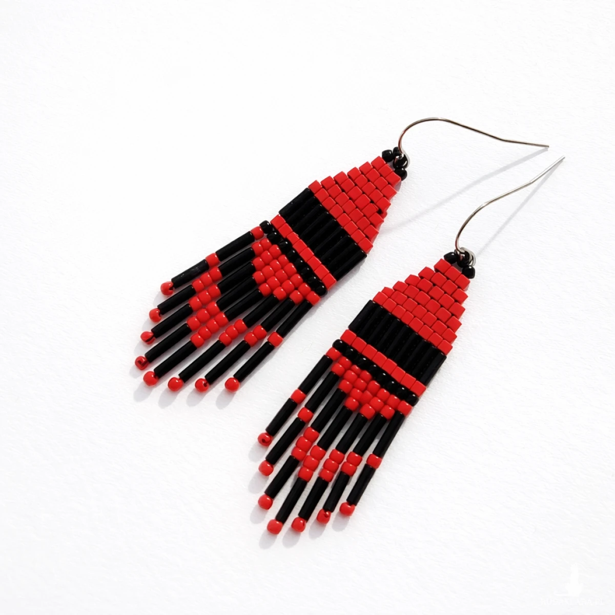 Oryginalne kolczyki etno stworzone z drobnych koralików w klasycznym zestawieniu czerwieni i czerni. Geometryczny wzór oraz efektowne frędzle sprawiają, że biżuteria przyciąga wzrok i podkreśla indywidualny styl.