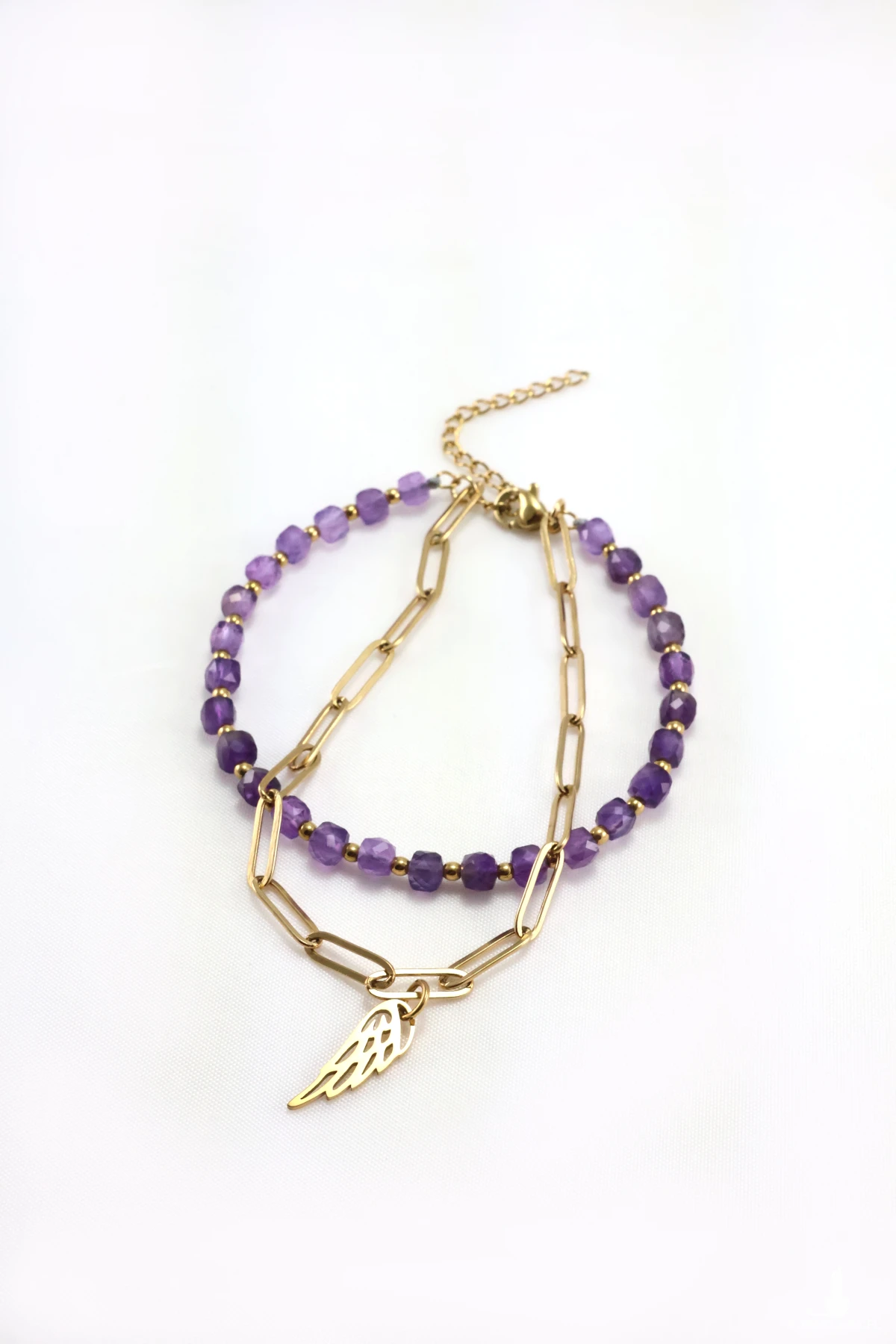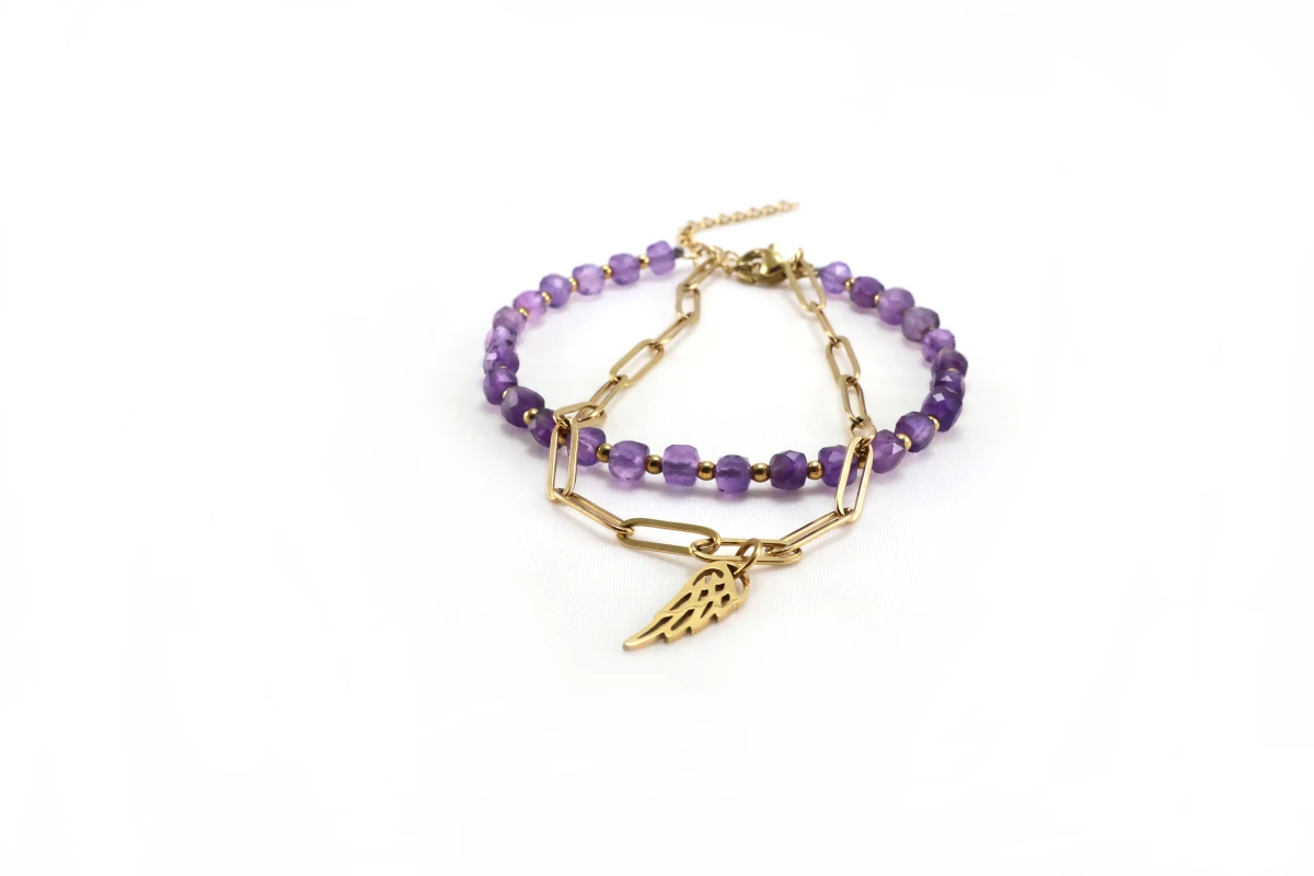 Podwójna bransoletka z ametystów to idealny sposób, aby wnieść odrobinę magii i elegancji do każdego dnia. Niezależnie od okazji, ten dodatek sprawdzi się doskonale! Połączenie delikatnych koralików ametystu i nowoczesnego łańcucha sprawia, że pasuje zarówno do jeansów i t-shirtu, jak i do wieczorowej sukienki. Uważa się, że ametyst wspiera jasność umysłu, pomaga w medytacji i przynosi poczucie spokoju, co jest nieocenione w codziennym pośpiechu. Zawieszka w kształcie skrzydła anioła może pełnić rolę Twojego osobistego talizmanu, przypominającego o sile, wolności i opiece.