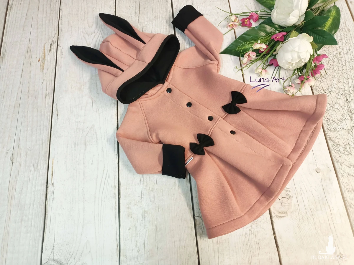 Płaszczyk uszyty z dresówki drapanej, z kapturem i uszami w kolorze brudnego,ciemniejszego różu.