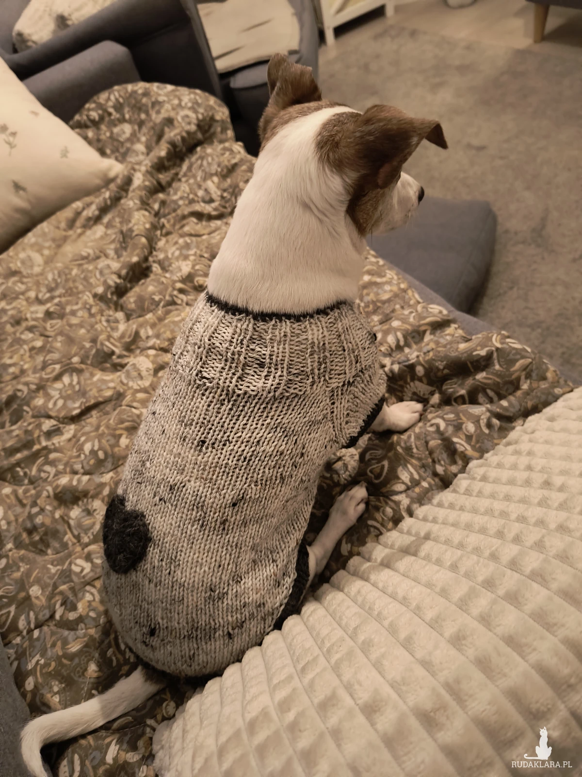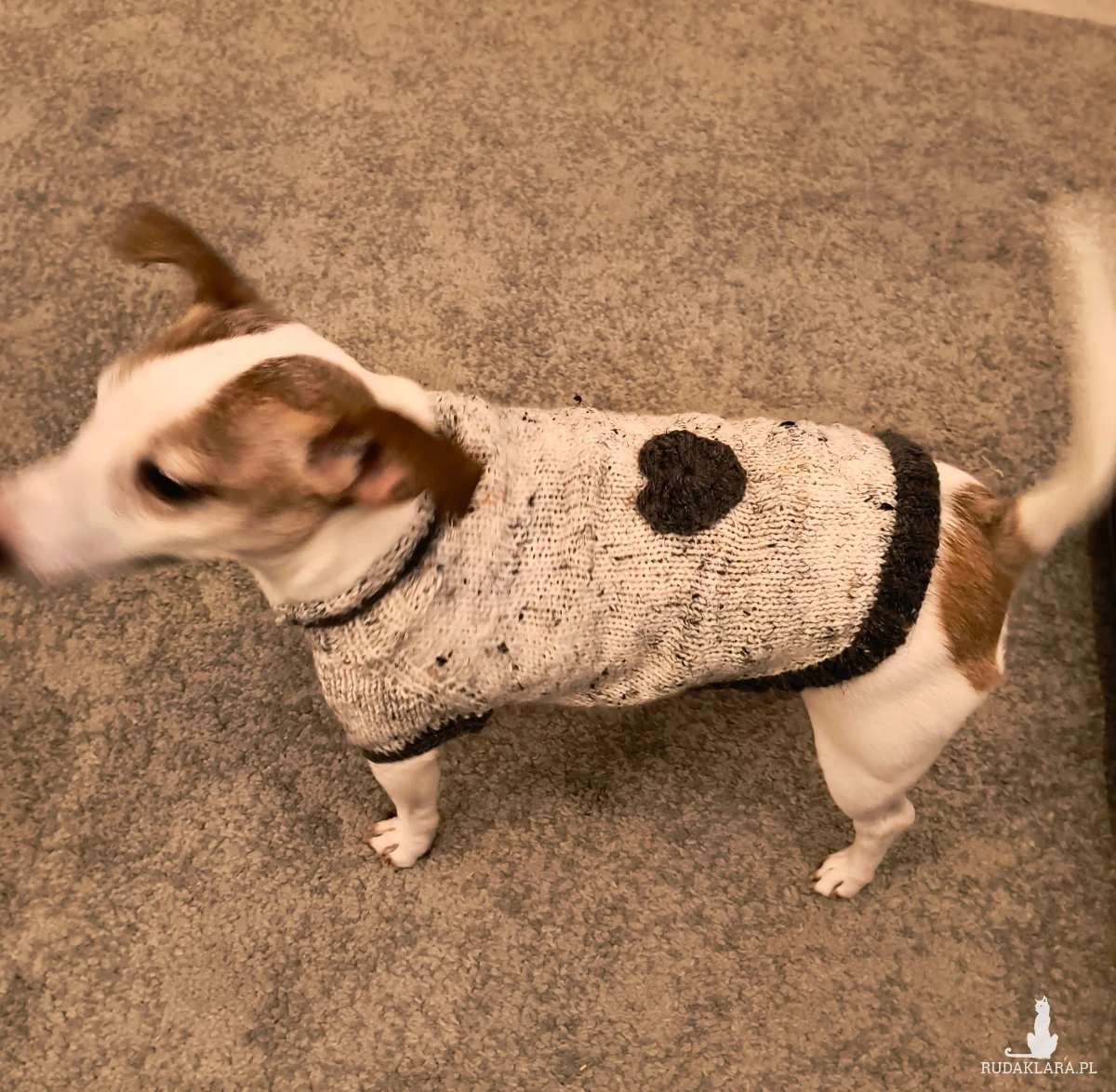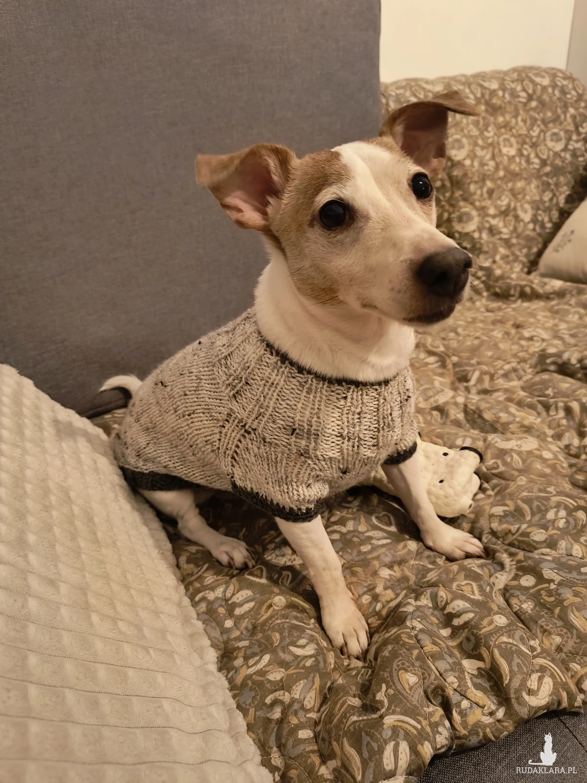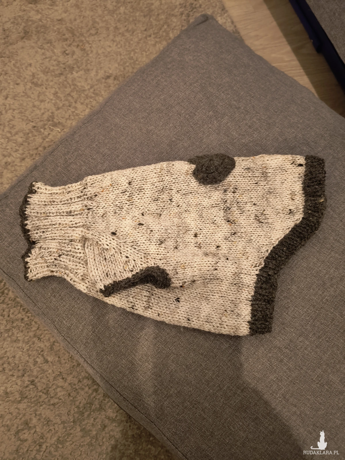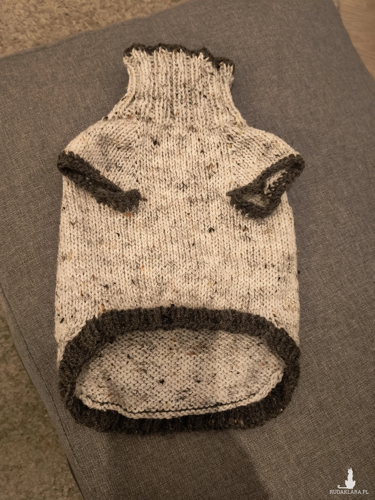 Sweterek dla psa, kota wełna z akrylem. Długość całkowita 32 cm, obwód 40 cm. Modelka szersza 45 😄