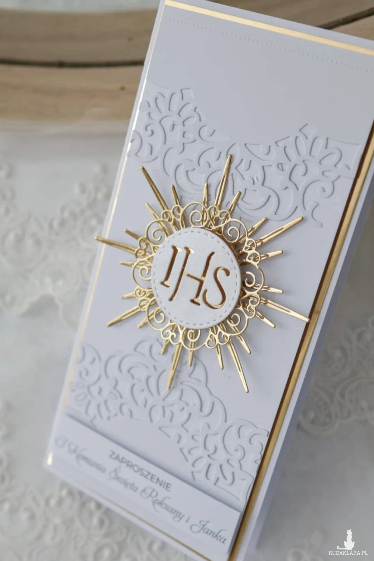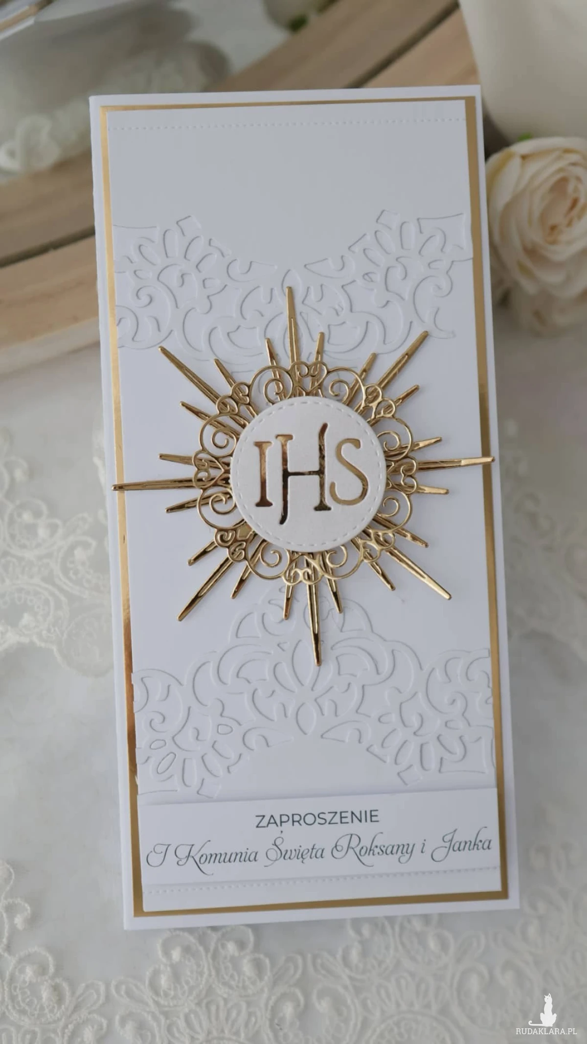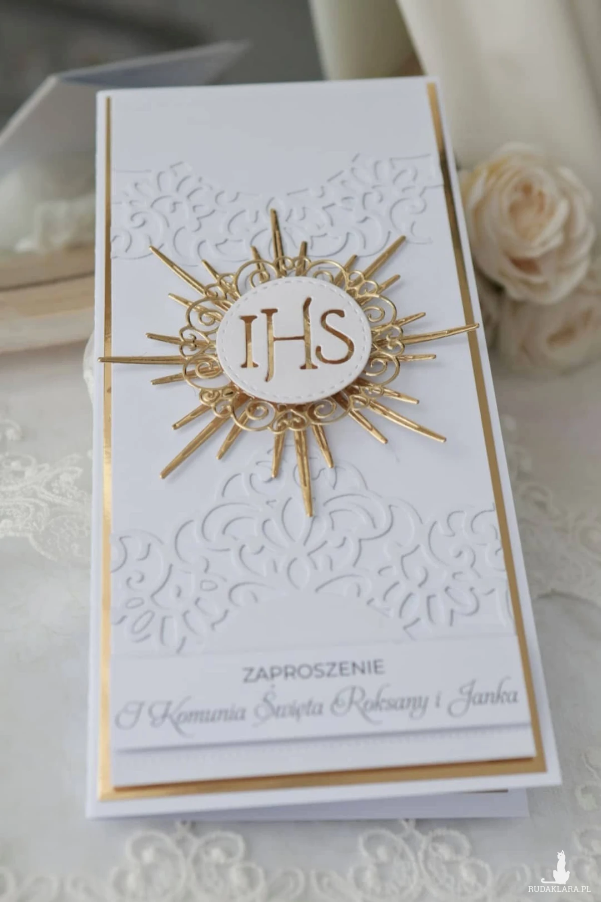 Pierwsza Komunia Święta to ważne wydarzenie dla dziecka, rodziny i najbliższych. Zaproszenie jest jego pierwszą zapowiedzią - tym, co goście biorą do ręki jako pierwsze. To zaproszenie na Pierwszą Komunię Świętą dla dziewczynki wyróżnia się elegancją, subtelną formą i klasycznym wyglądem. Każde zaproszenie jest personalizowane dzięki czemu całość jest spójna i wyjątkowa.