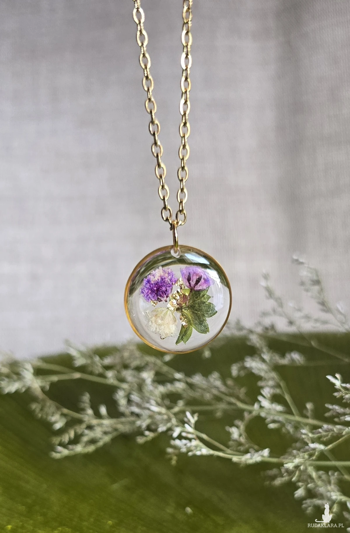 Oferuję Państwu unikalną biżuterię. Zawieszka jest wykonana z suszonych kwiatów i żywicy epoksydowej. Biżuteria jest wspaniałym i oryginalnym prezentem na lata.