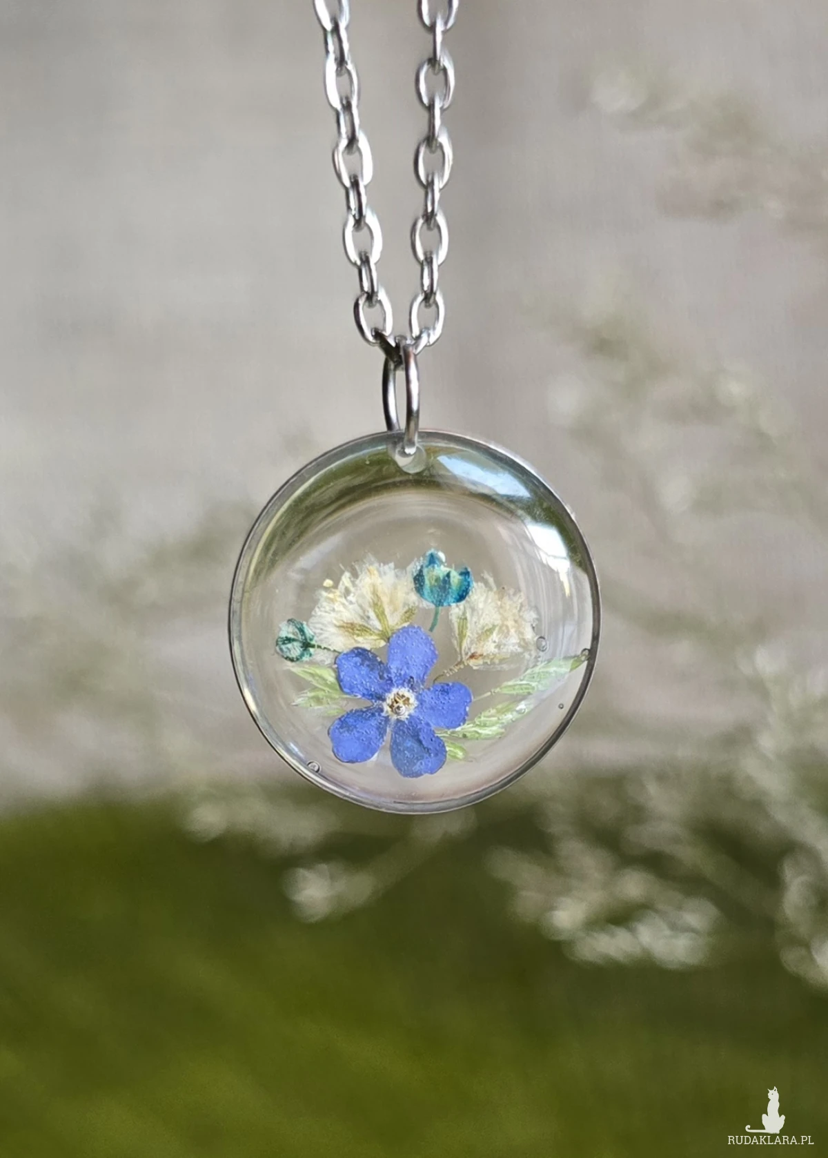 Oferuję Państwu unikalną biżuterię. Zawieszka jest wykonana z suszonych kwiatów i żywicy epoksydowej. Biżuteria jest wspaniałym i oryginalnym prezentem na lata.