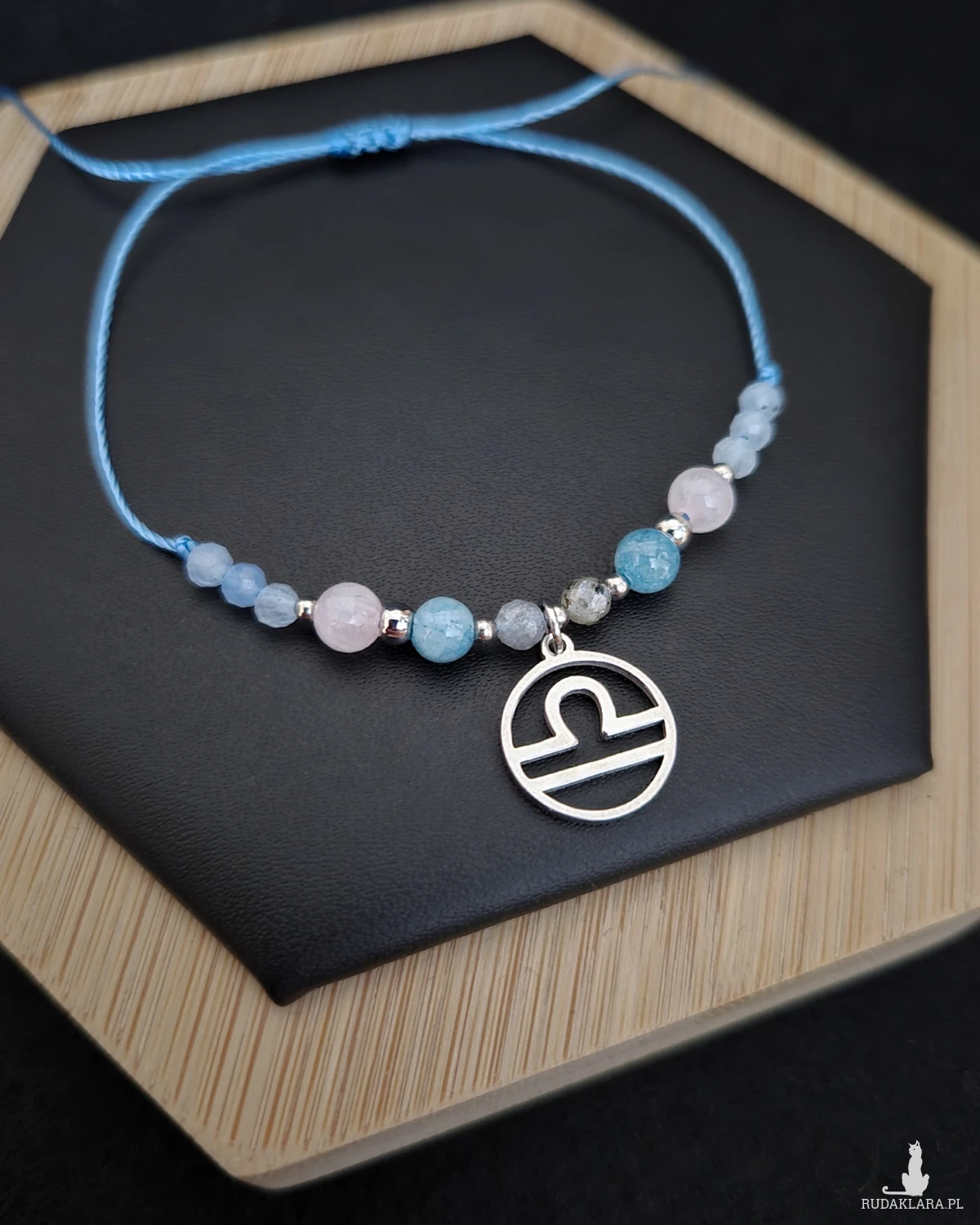 Akwamaryn wprowadza spokój i emocjonalną równowagę, kwarc różowy wzmacnia energię miłości i empatii, a labradoryt zapewnia ochronę i wspiera intuicję. Jasna, pastelowa kolorystyka podkreśla delikatność, elegancję i harmonijną naturę Wagi.