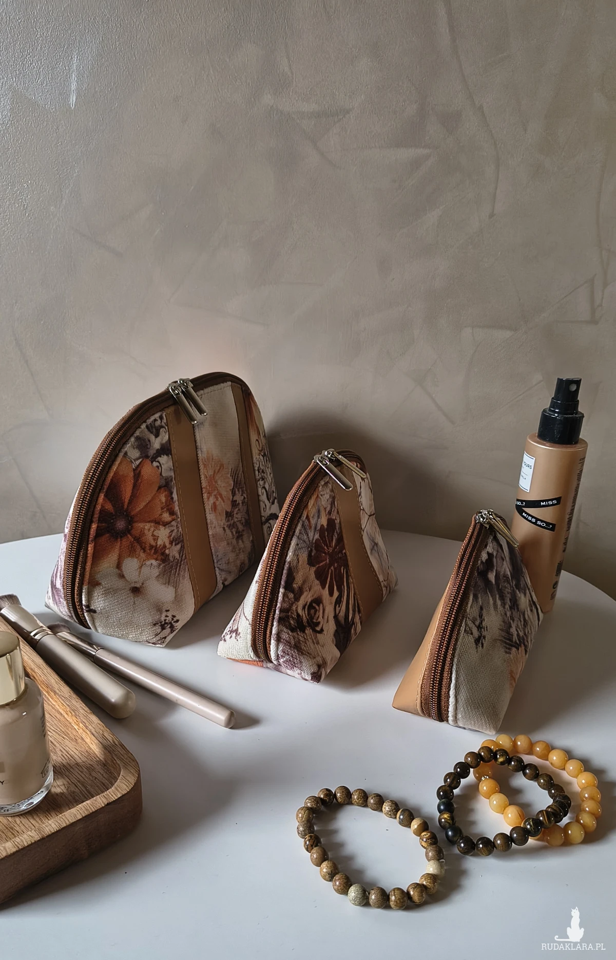 Każda kosmetyczka powstaje ręcznie, z dbałością o trwałość i estetykę. Starannie dobrane materiały, solidne wykończenia i unikatowy wzór sprawiają, że to zestaw, który zostaje na lata.