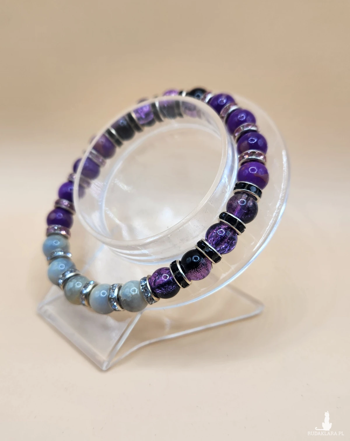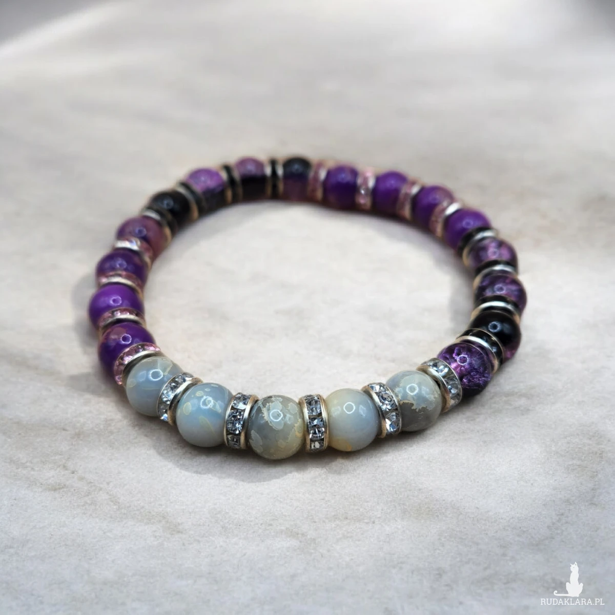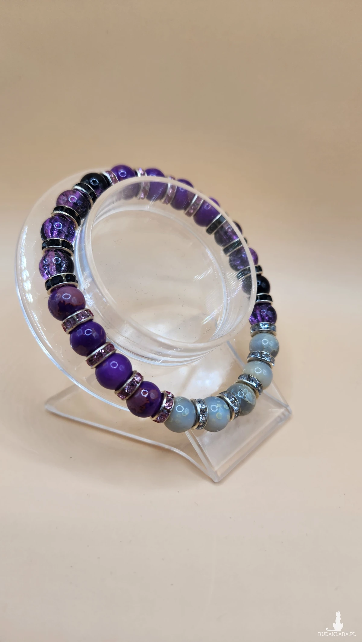 Elegancka bransoletka wykonana z okrągłych koralików w odcieniach fioletu, czerni i szarości. Centralną część zdobią jasnoszare koraliki o delikatnym, marmurkowym wzorze, oddzielone błyszczącymi przekładkami z kryształowym efektem. Całość tworzy spójną i stylową kompozycję, idealną zarówno na co dzień, jak i na specjalne okazje.