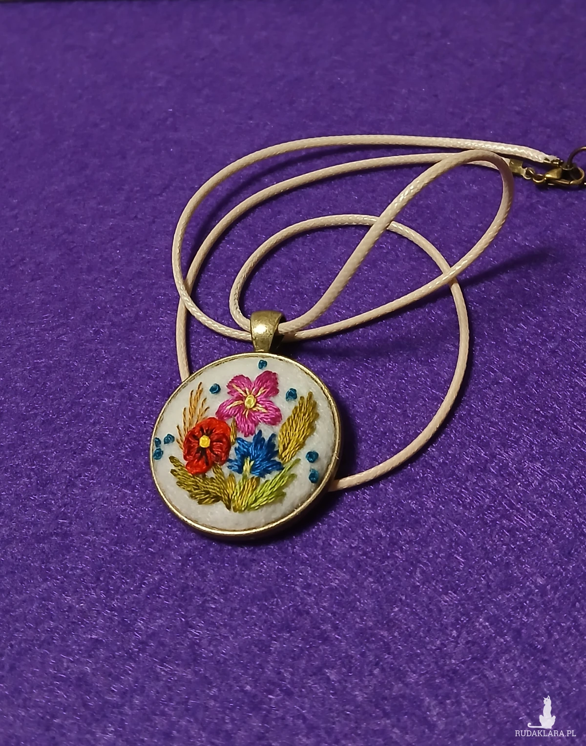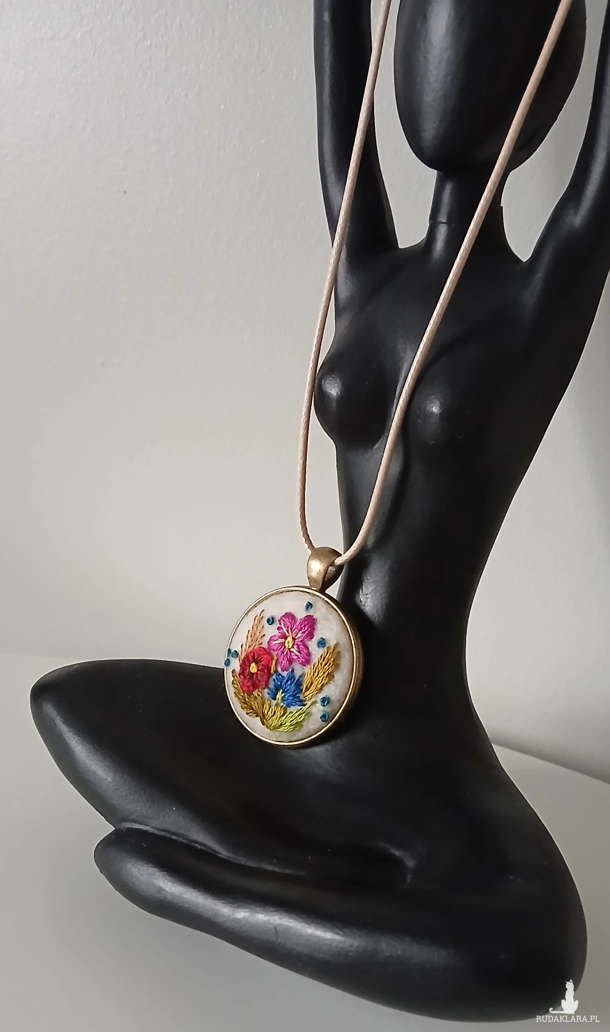 Dopadła Cię tęsknota za latem? Dodaj do swojej kreacji letni wisior z kolorowym bukietem polnych kwiatów na jasnym tle i pomyśl że zima wcale nie jest taka zła.
