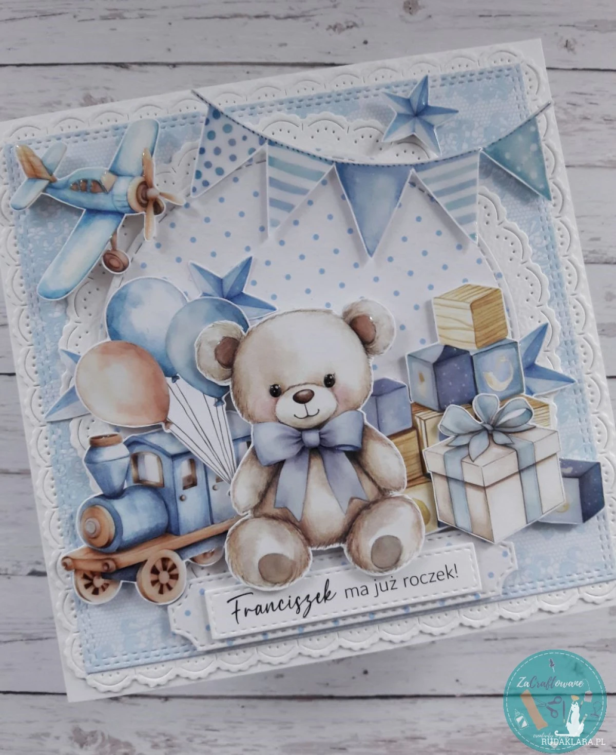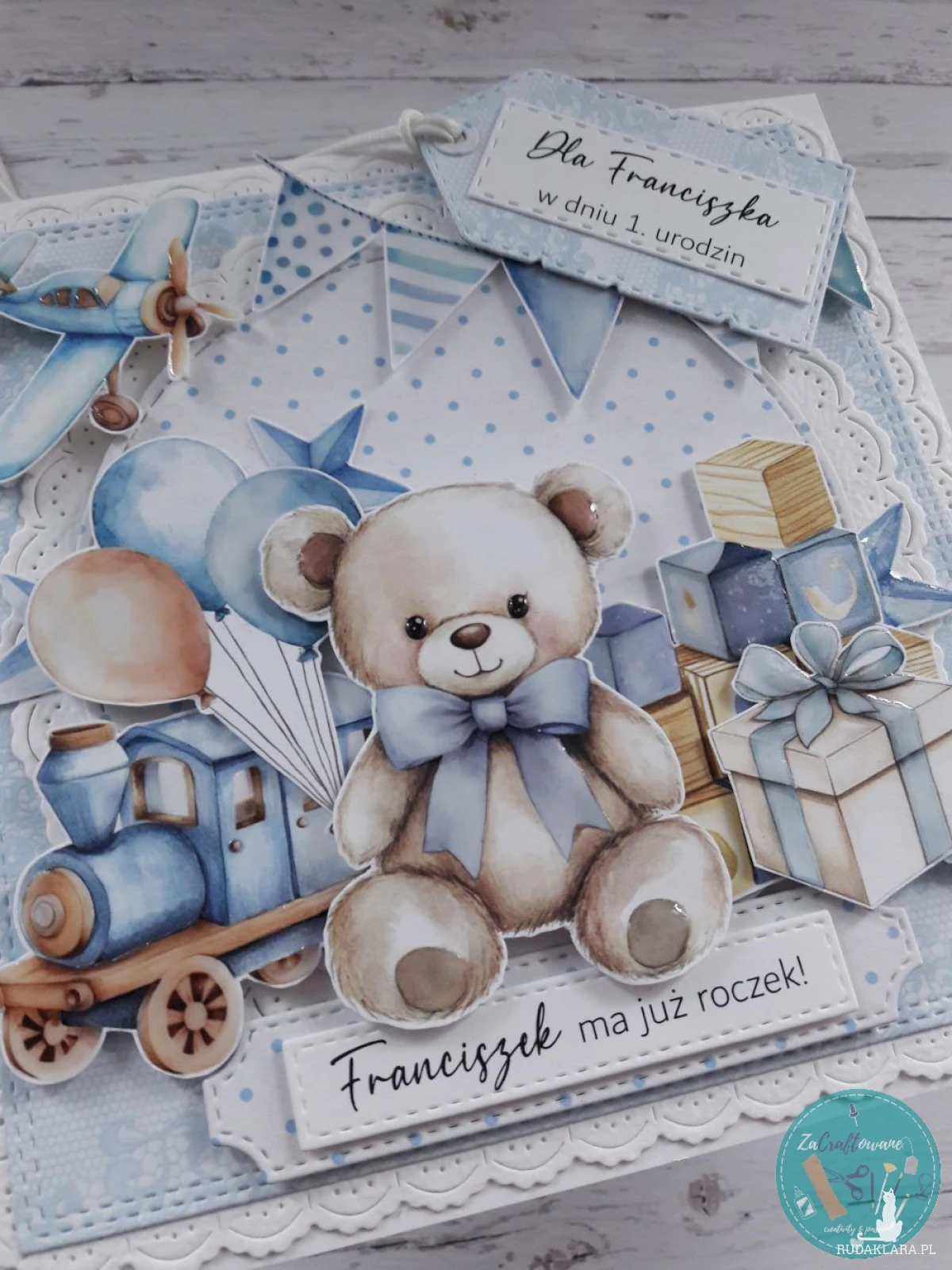 Motywem przewodnim kartki jest pokój dziecięcy wypełniony zabawkami, w tym trzymającym balony uroczym misiem, który tylko czeka na świętowanie 1. urodzin razem z Maluszkiem.